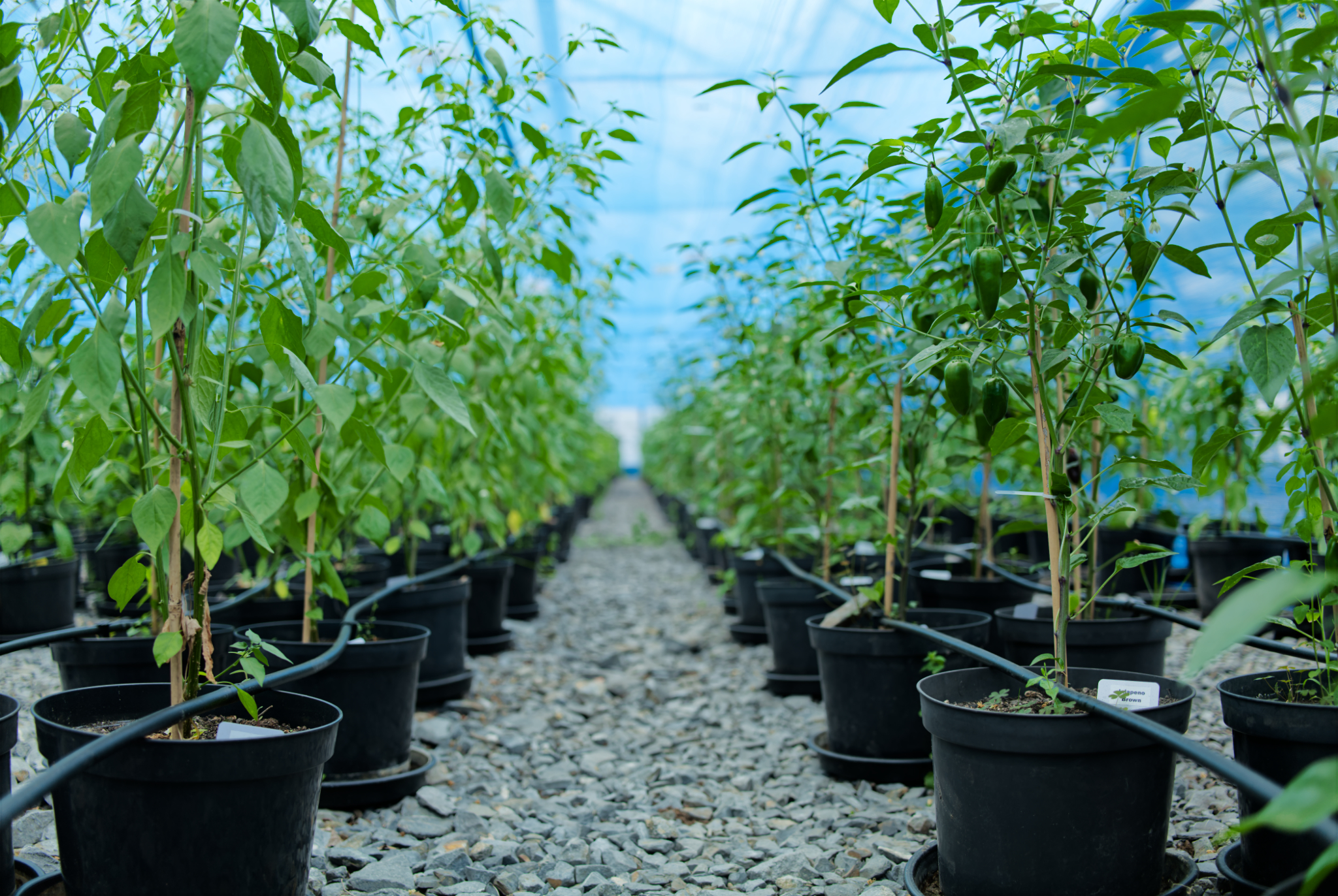 Podloží v našem skleníku není hlína pouze překrytá černou netkanou textilií. Základ celého skleníku je vysypaný 30–50 cm vysokou vrstvou hrubé kamenné suti. Rostliny jsou pěstované jednotlivě v květináčích, skrze které je napojená kapková závlaha.