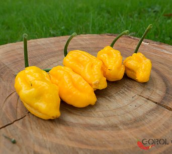Plody: Robustní, zavalité, svým způsobem připomínají lehce krabaté habanero. Dorůstají délky okolo 5-6 cm a průměru asi 4-5 cm. Zprvu jsou světle zelené, následně zrají do bledě oranžové barvy.  Chuť a pal: Plody se vyznačují jemnou…