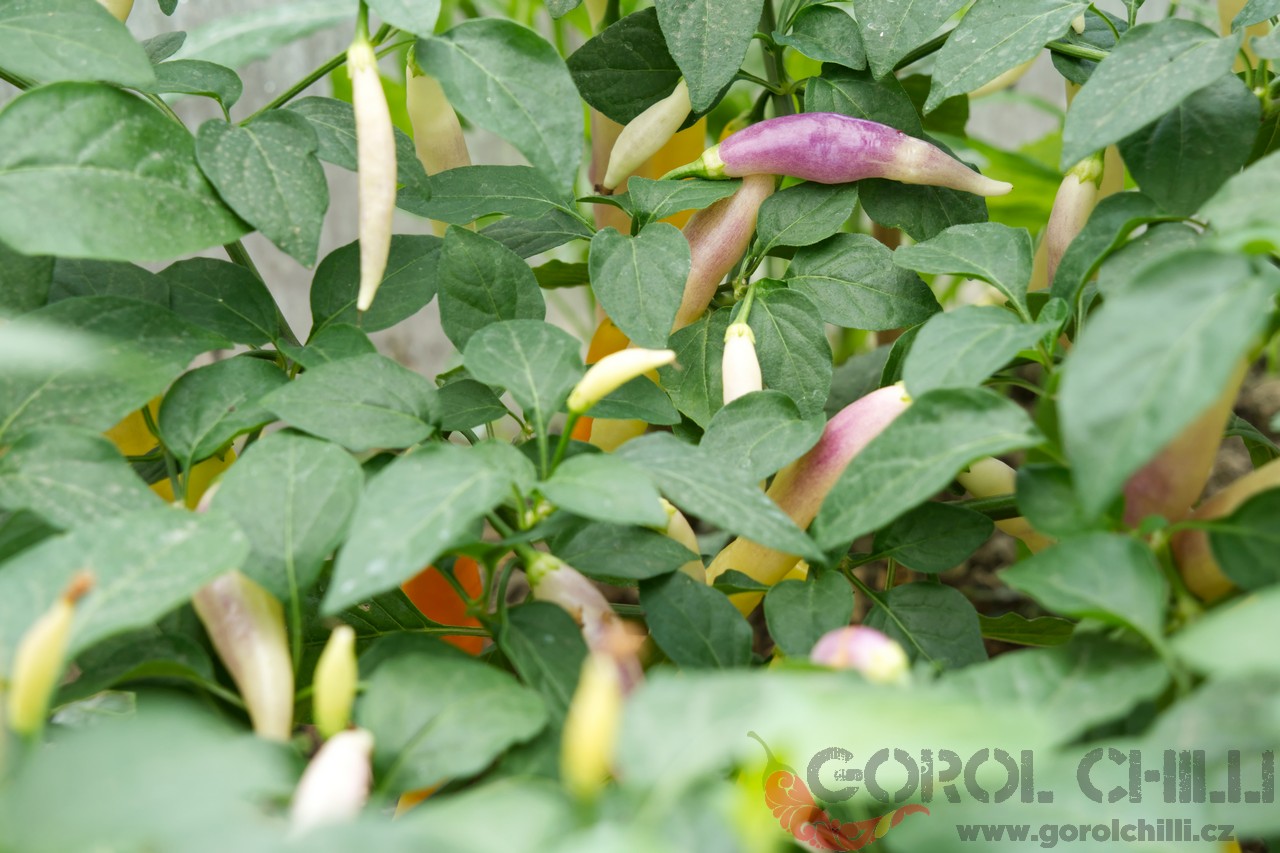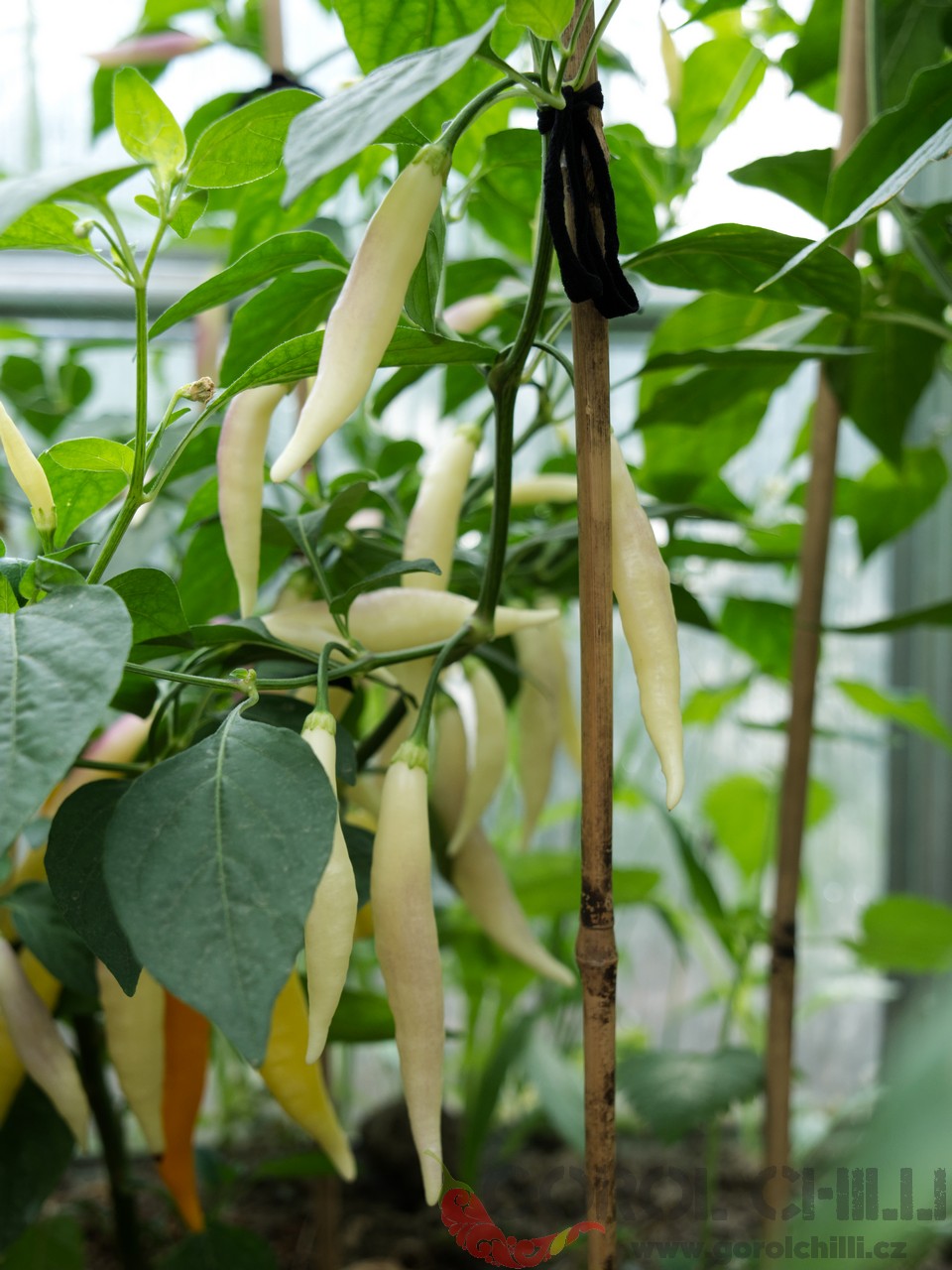 Plody: Podlouhlé, soudečkovité, úhledně zaoblené s hladkým povrchem. Tvarově prakticky totožné s odrůdou Pimenta da Neyde. Jsou asi 4-7 cm dlouhé a 1,5 cm široké. Zprvu jsou zelené s černými přelivy, následně zrají do krémově bílé barvy s…