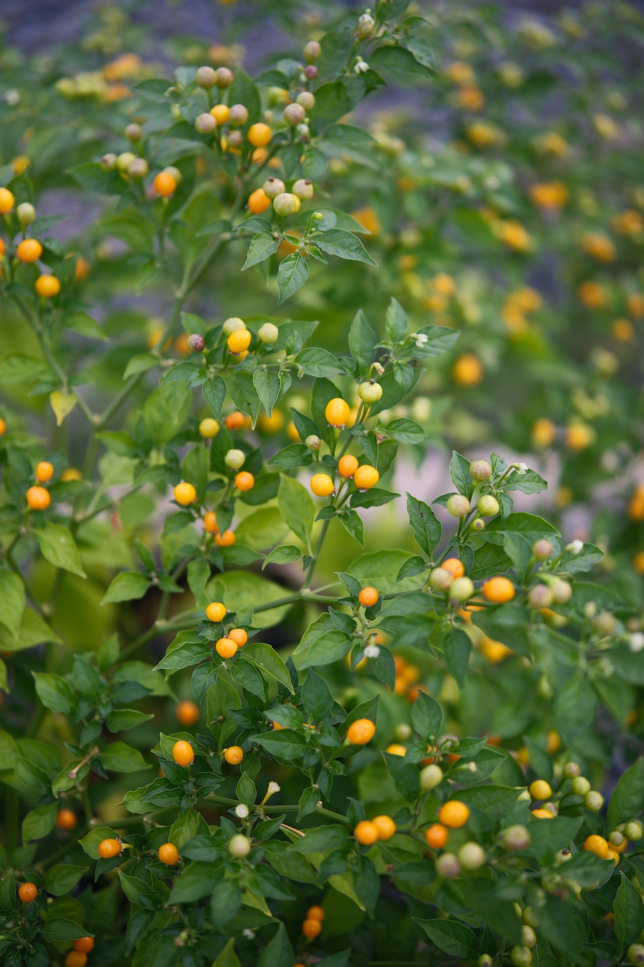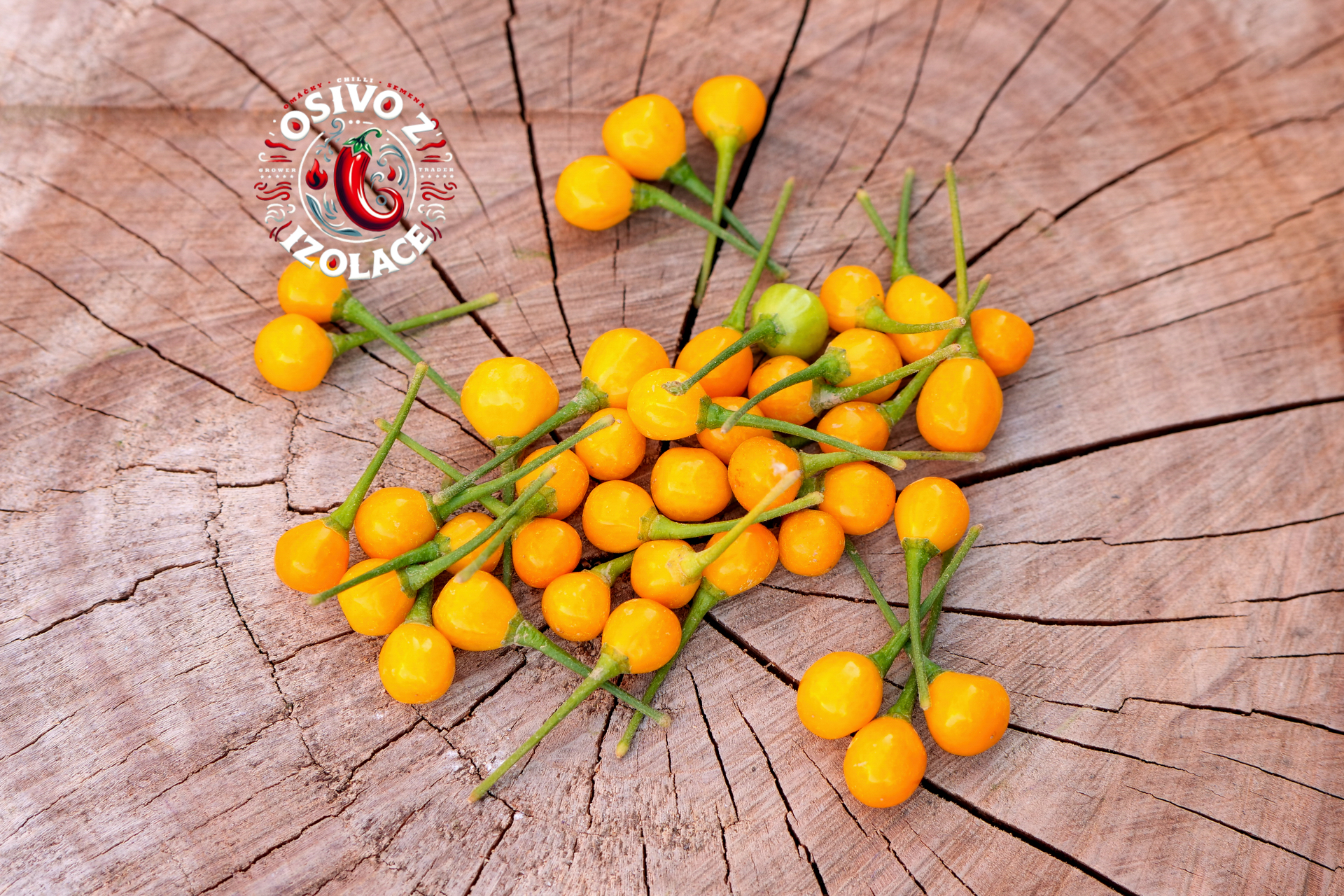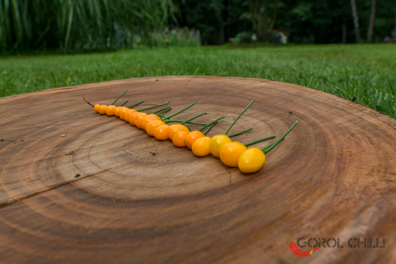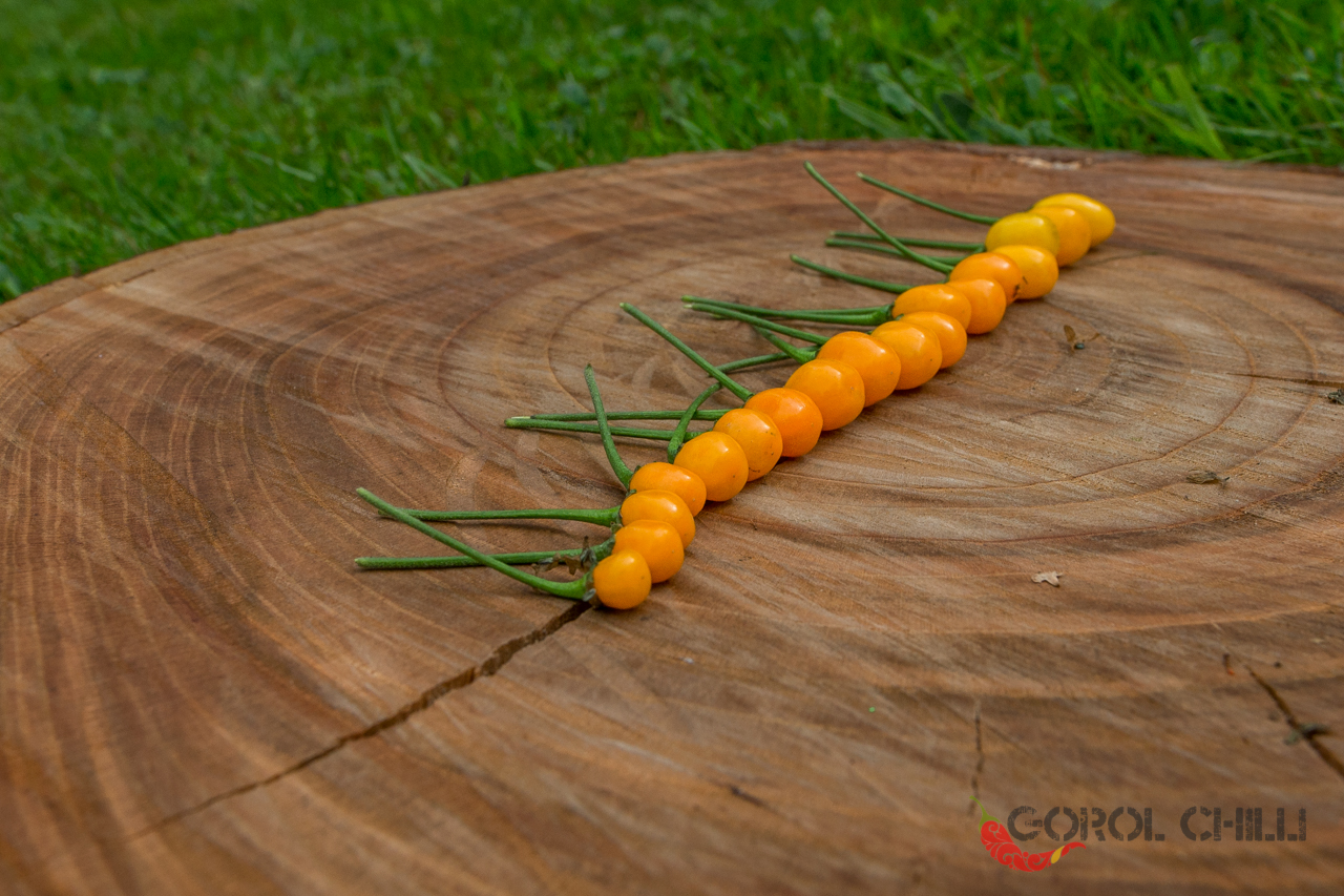 Plody: Drobné, kulaté, měří jen okolo 1 cm v průměru, někdy i méně. Zprvu jsou zelené, následně zrají do nádherně svítivé žluté barvy.