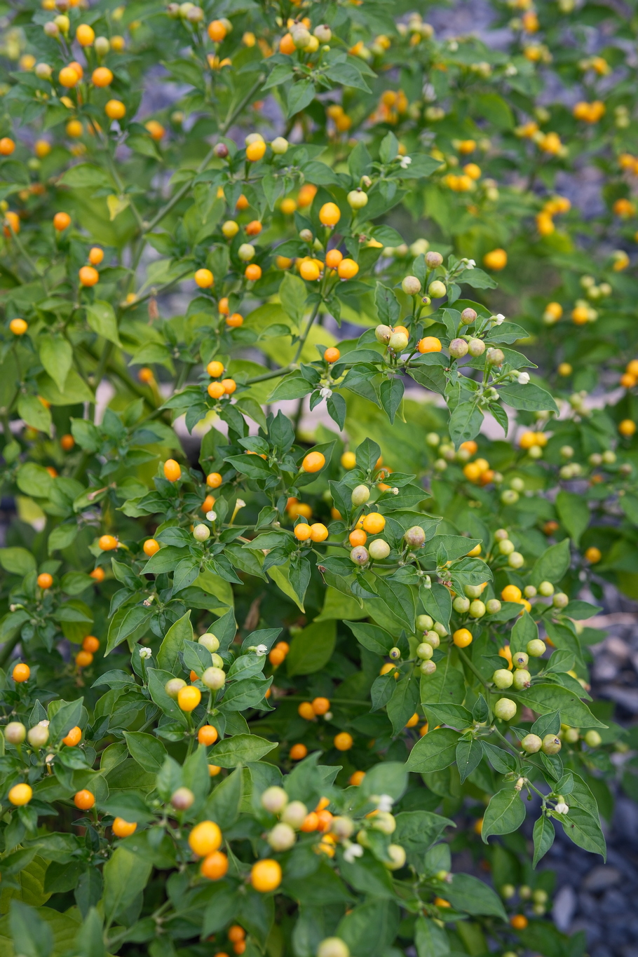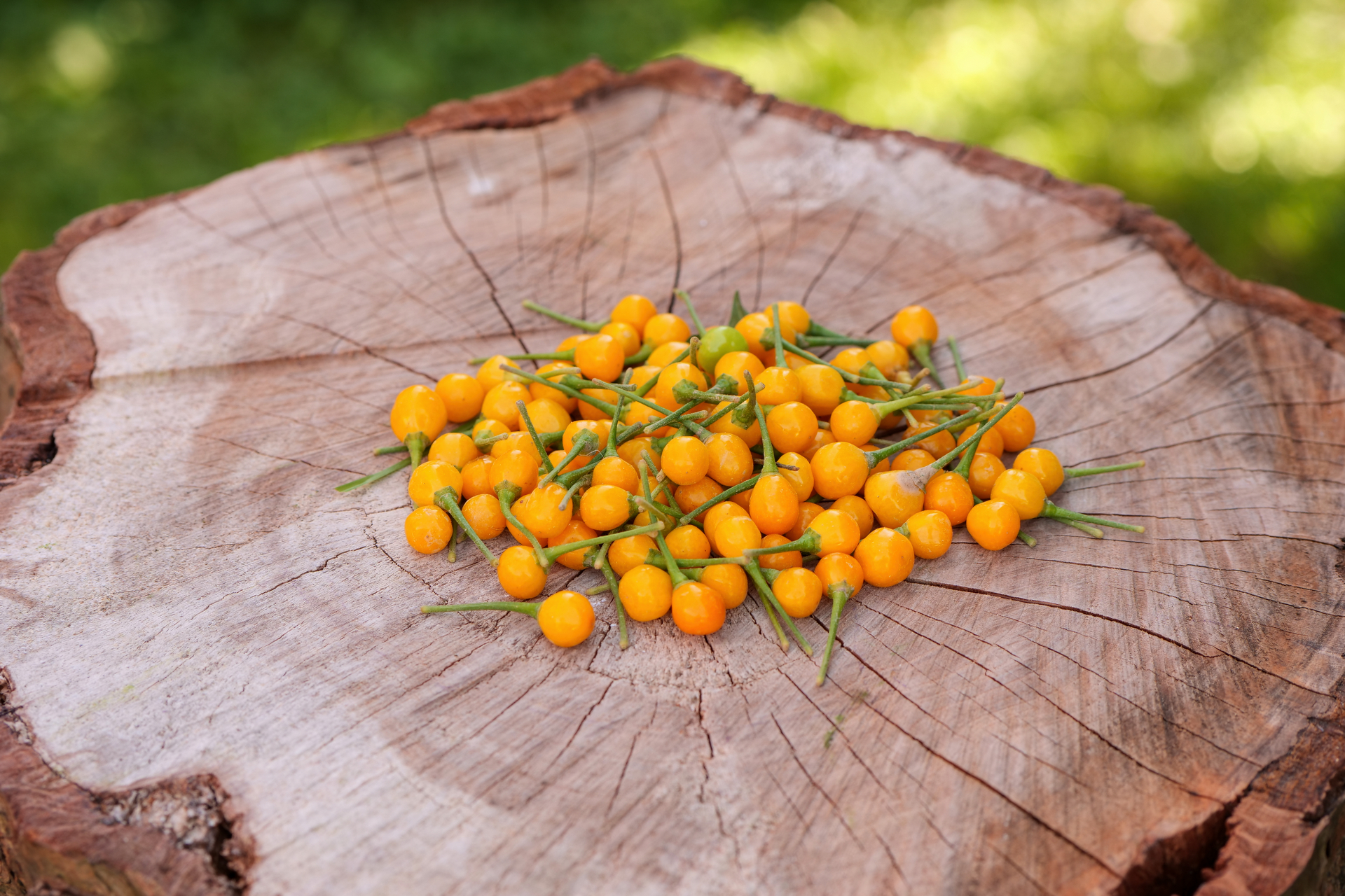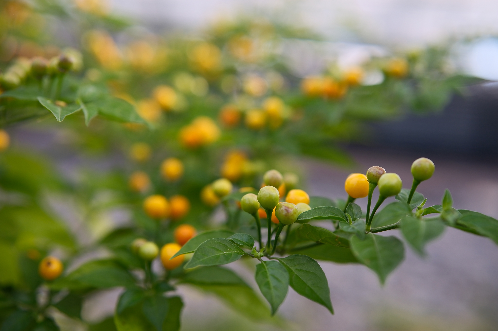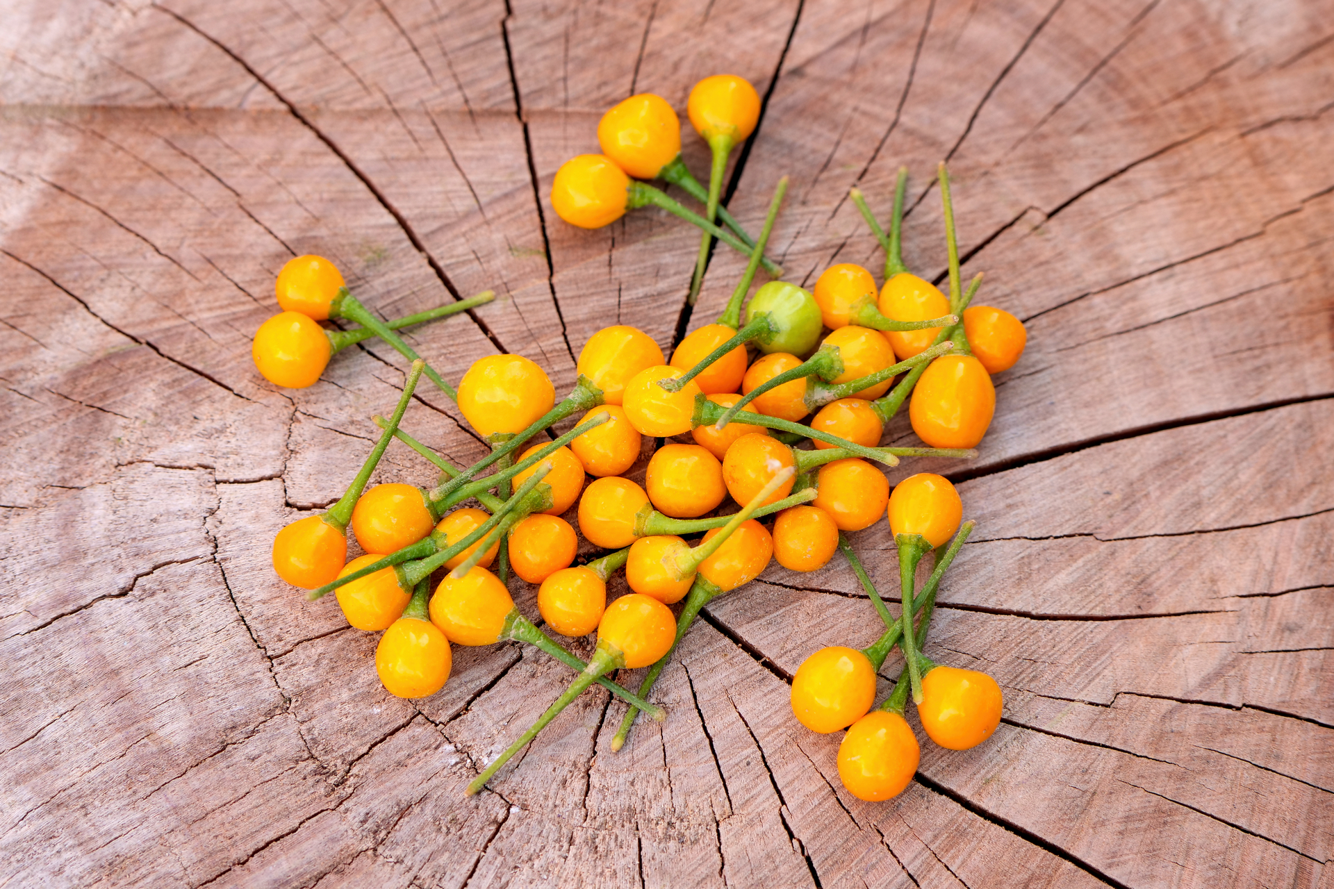 Plody: Drobné, kulaté, měří jen okolo 1 cm v průměru, někdy i méně. Zprvu jsou zelené, následně zrají do nádherně svítivé žluté barvy.