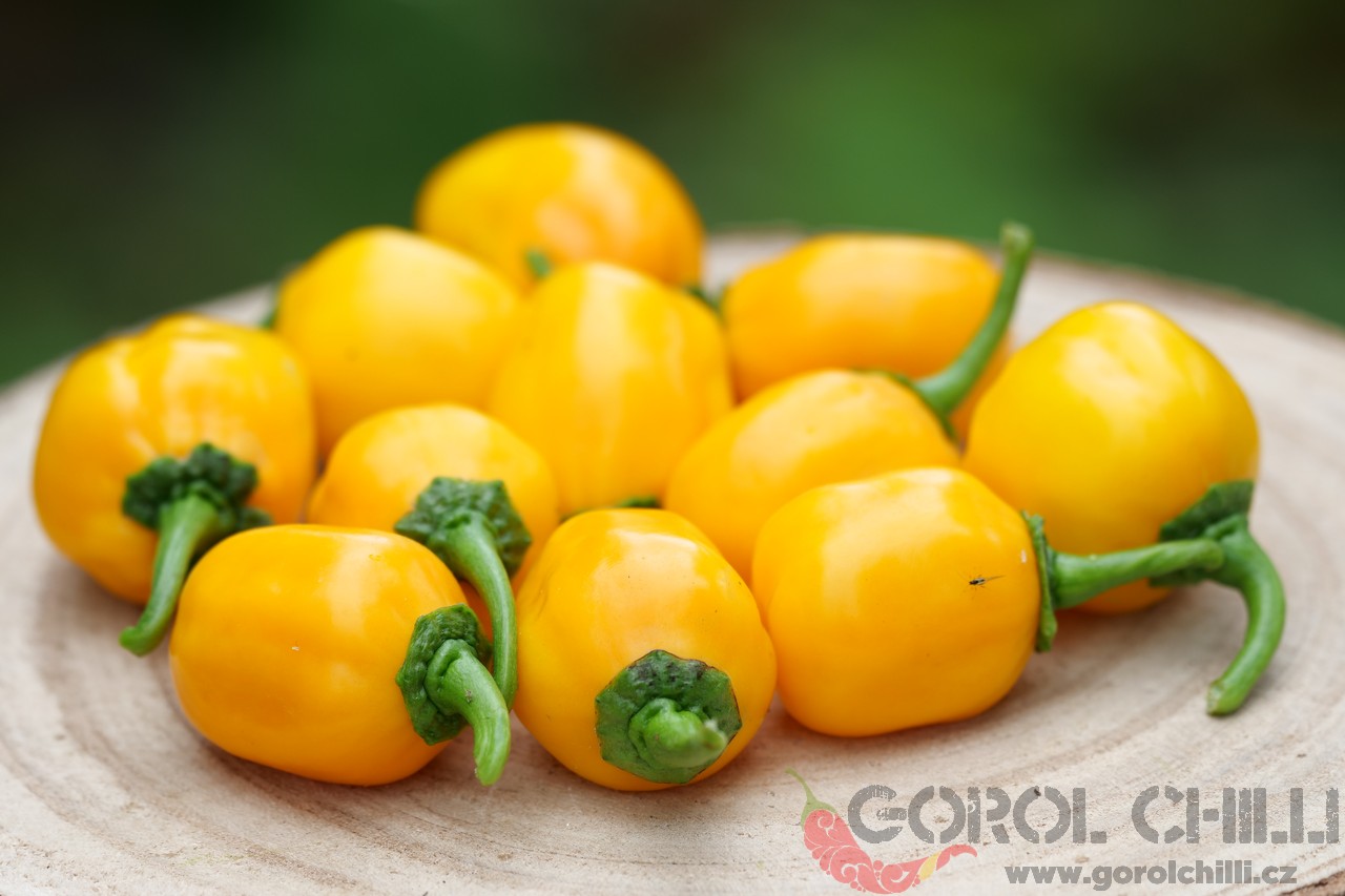 Plody: Robustní, soudečkovité, lehce připomínající "atomový hříbek". Dorůstají okolo 5-6 cm na délku a okolo 5 cm v průměru. Zrají ze světle zelené do krémově bílé barvy.  Chuť a pal: Papriky mají velmi jemnou kořeněnou chuť doprovázenou…