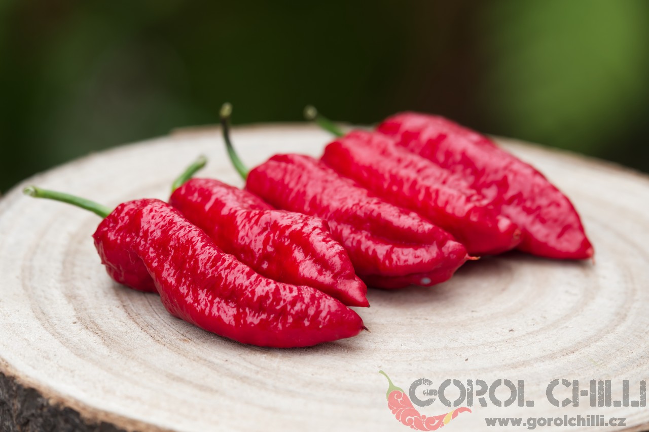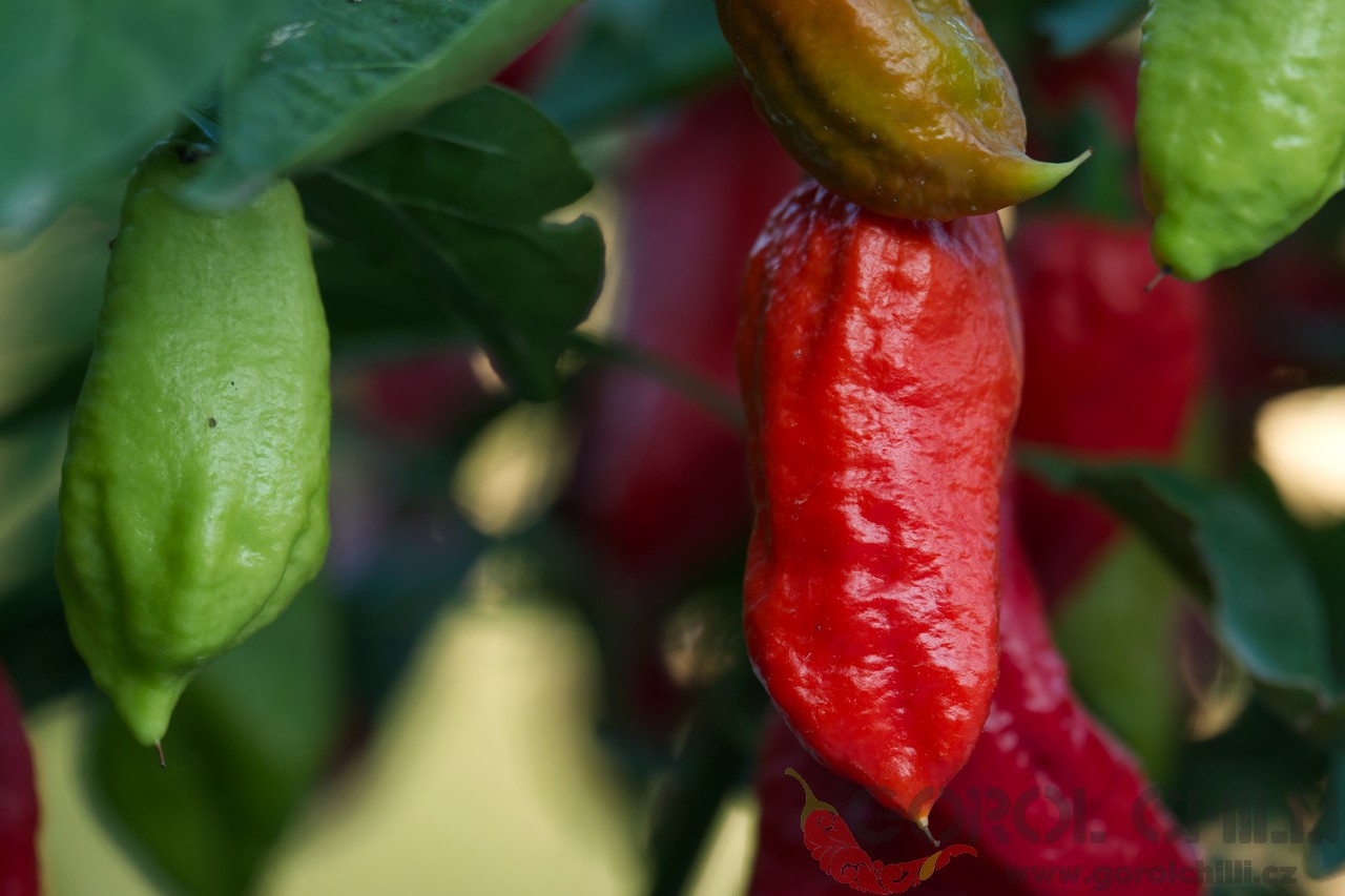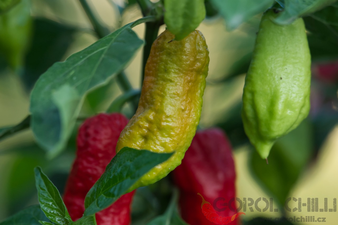 Plody: Podlouhlé, úzké s lehce krabaté. Zprvu jsou světle zelené až bělavé, později zrají do krásné karamelové barvy. Dorůstají délky okolo 8-11 cm a průměru do 2 cm. Chuť a pal: Chuť je typická pro indické kultivary typu Jolokia,…