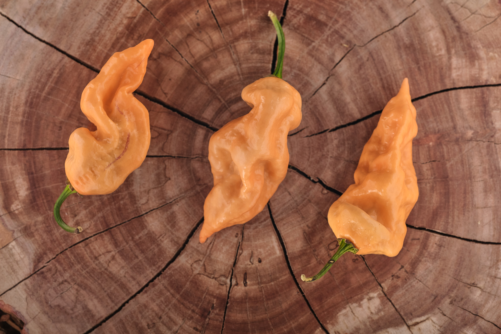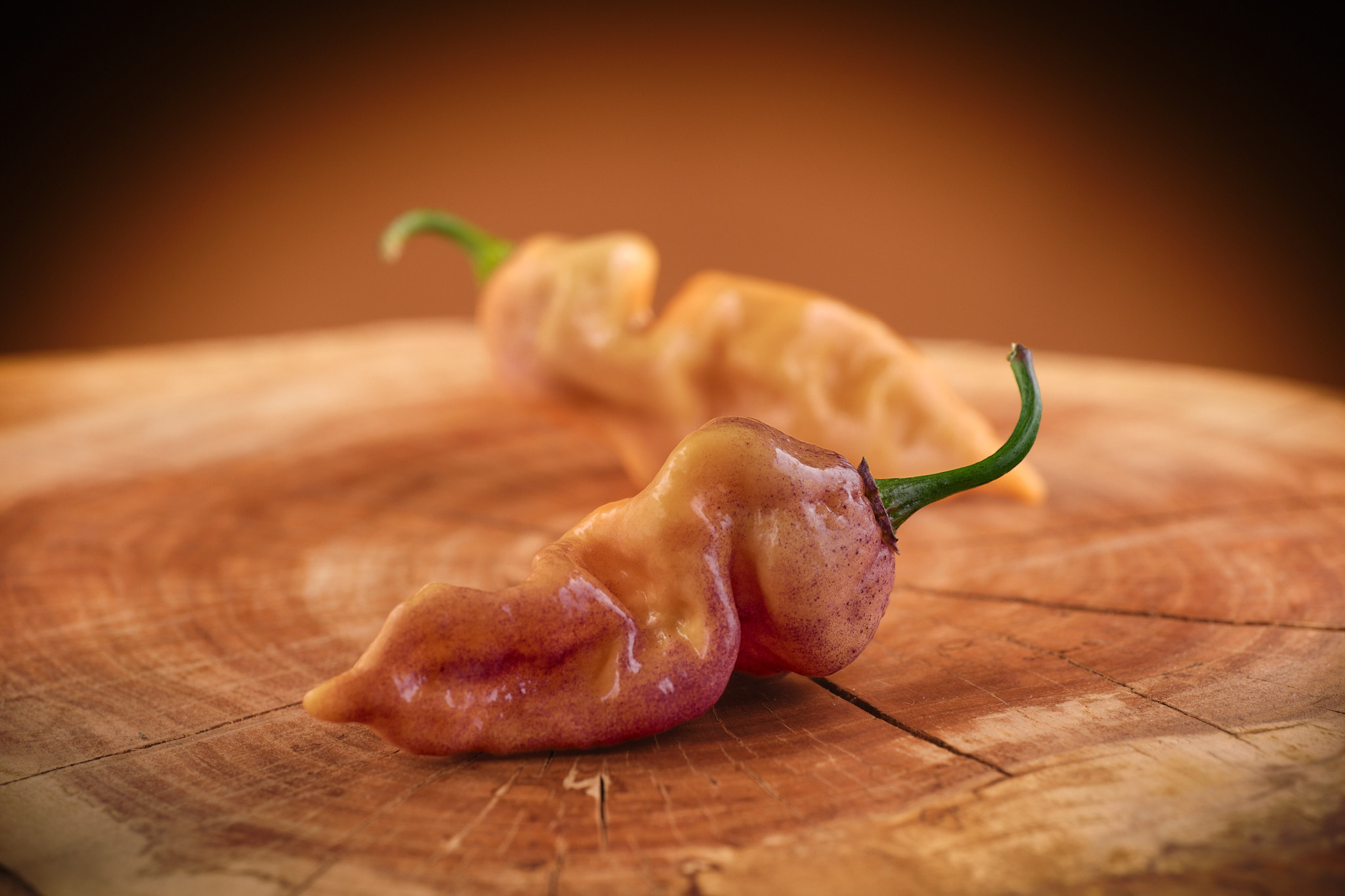 Plody: Robustní, zavalité, svým způsobem připomínají lehce krabaté habanero. Dorůstají délky okolo 5-6 cm a průměru asi 4-5 cm. Zprvu jsou světle zelené, následně zrají do bledě oranžové barvy.  Chuť a pal: Plody se vyznačují jemnou…