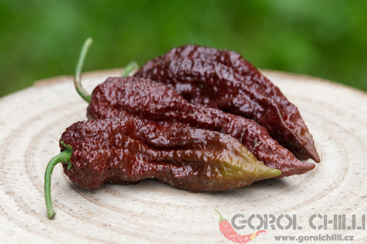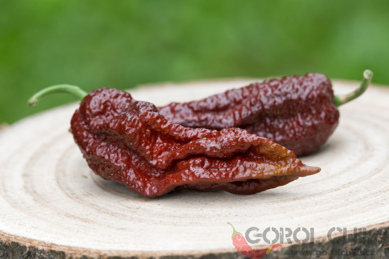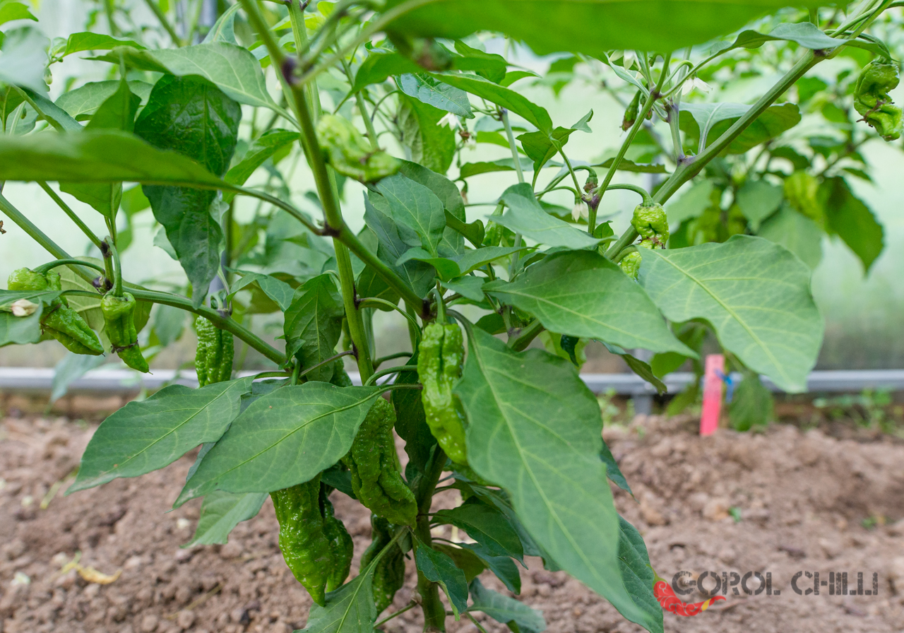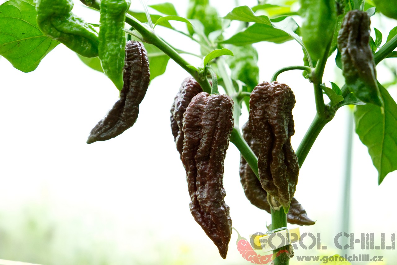 Rostlina: Spíše středně vysoký až vyšší keřík dorůstající výšky okolo 0,8-1,2 metru a průměru koruny okolo 0,8-1 m. Plody nasazuje jednotlivě i ve dvojicích, což poskytuje vysoký výnos typický obecně pro okruh Bhut Jolokia.
