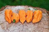 Plody: Robustní, zavalité, svým způsobem připomínají lehce krabaté habanero. Dorůstají délky okolo 5-6 cm a průměru asi 4-5 cm. Zprvu jsou světle zelené, následně zrají do bledě oranžové barvy.  Chuť a pal: Plody se vyznačují jemnou…