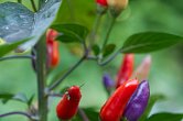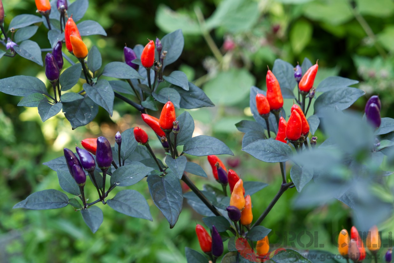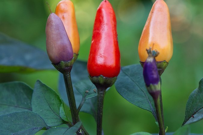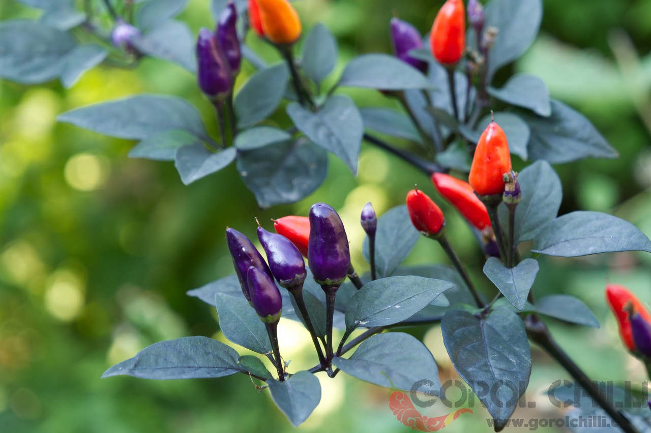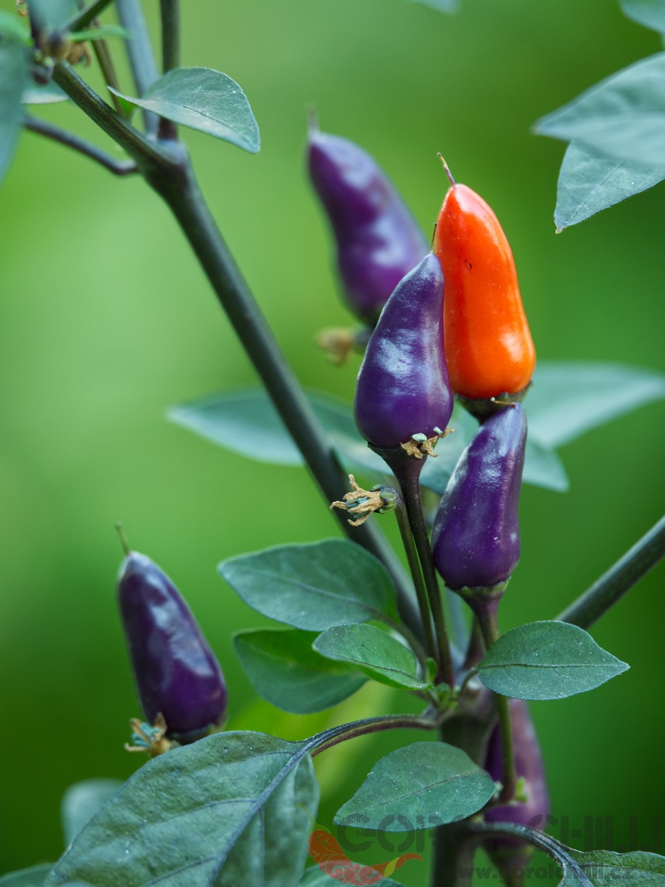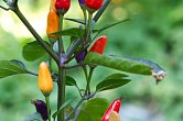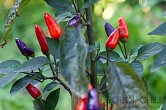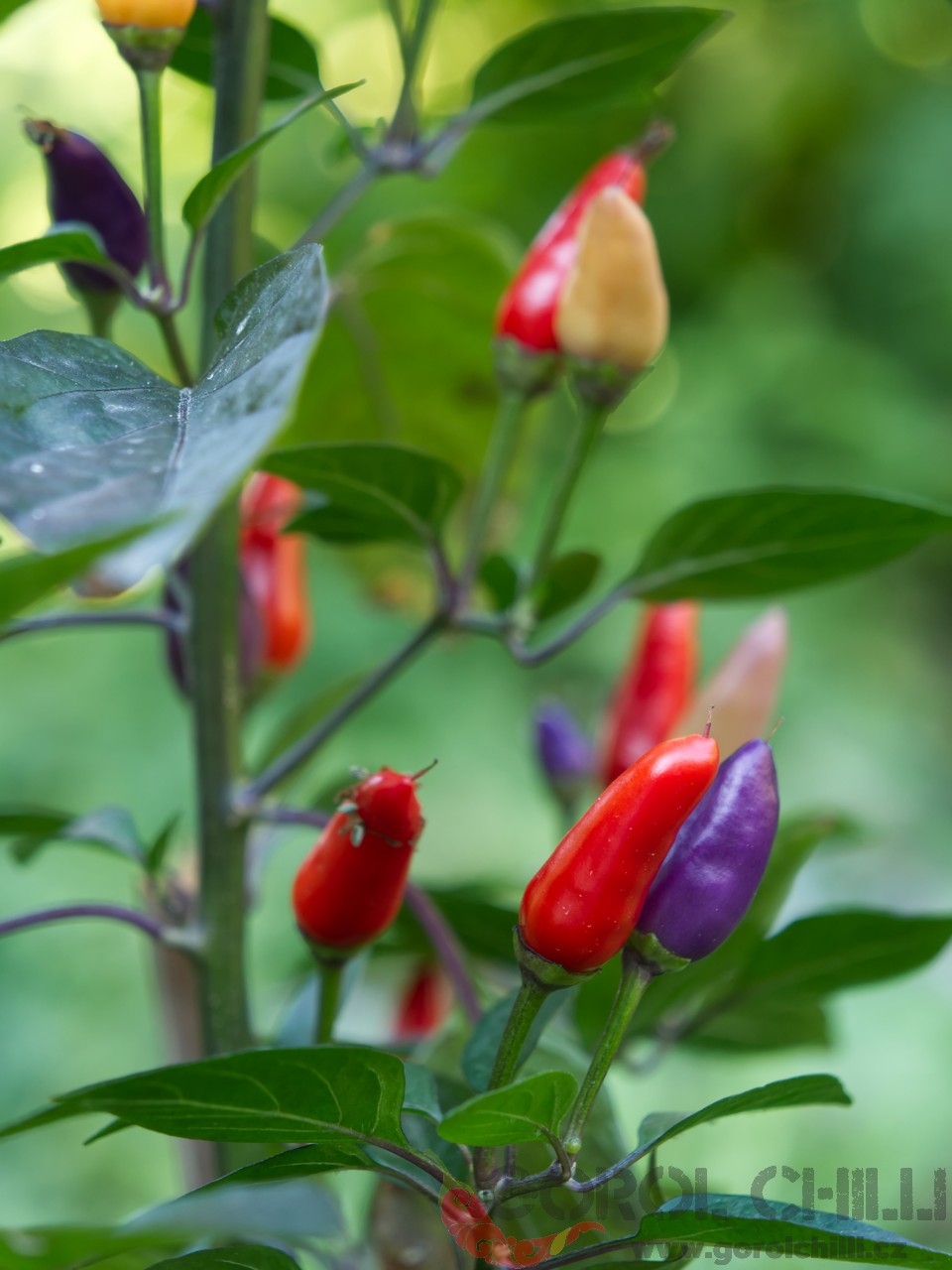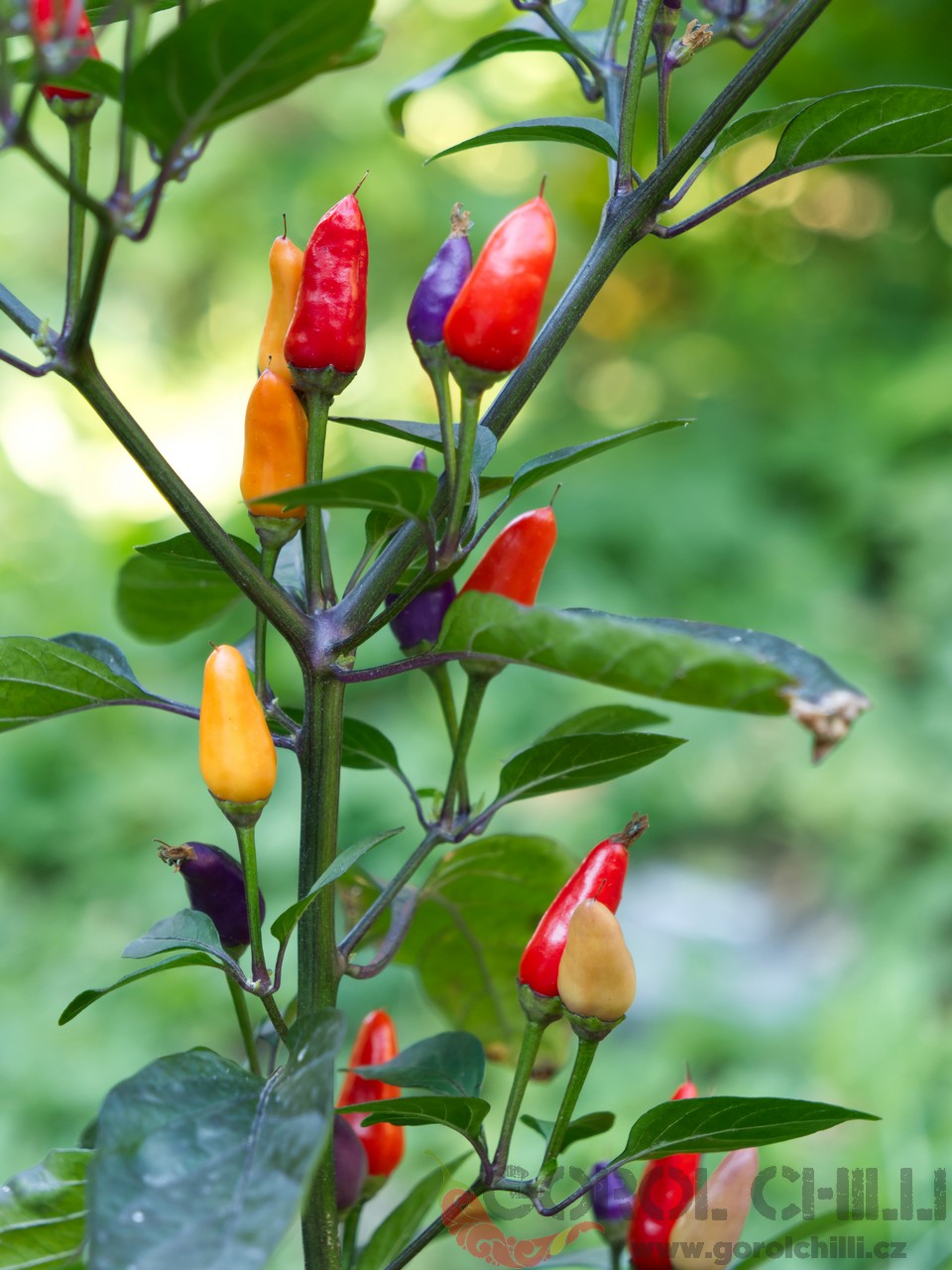 Plody: Drobné, kónické, asi 2-3 cm dlouhé a méně než 1 cm široké. Zprvu jsou fialové, následně zrají přes žlutou a oranžovou do svítivě červené barvy.