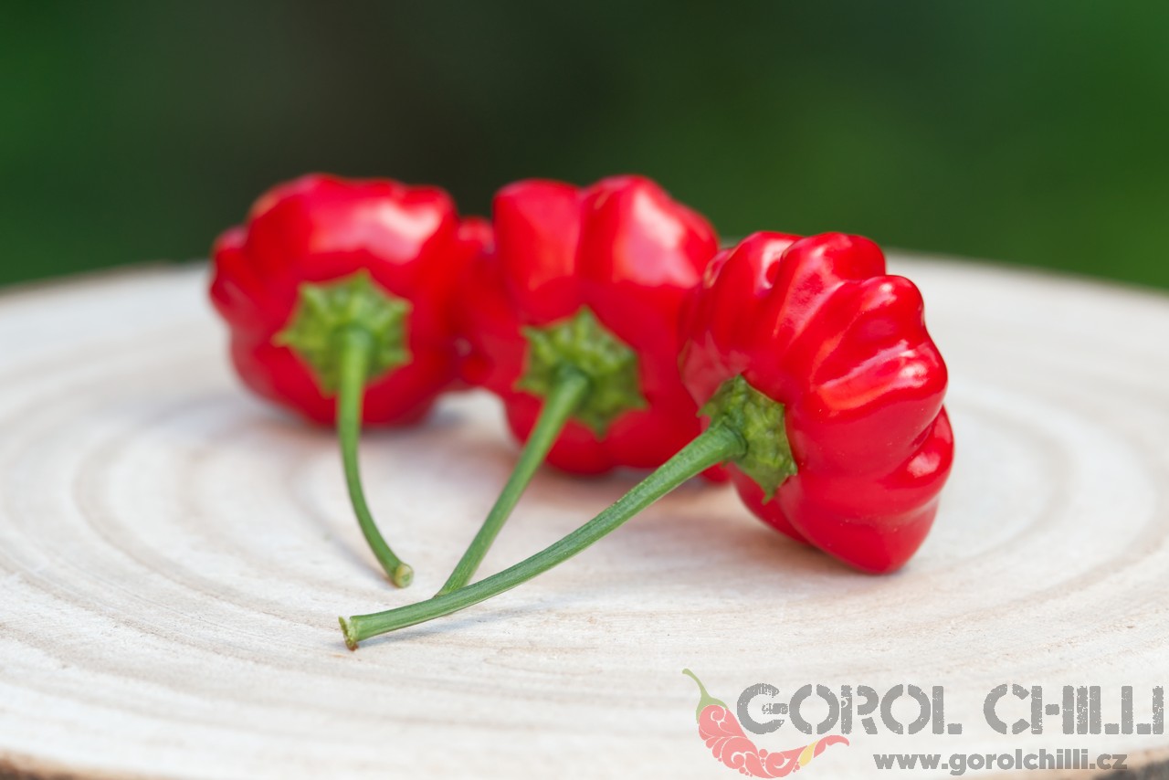 Plody: Menší, soudečkovité, na první pohled připomínající zmenšenou Morugu. Zprvu jsou tmavě zelené, později zrají do svítivě červené barvy.  Chuť a pal: Plody jsou ovocné a nezvykle sladké, doprovázené velmi agresivním kořeněným aroma.…
