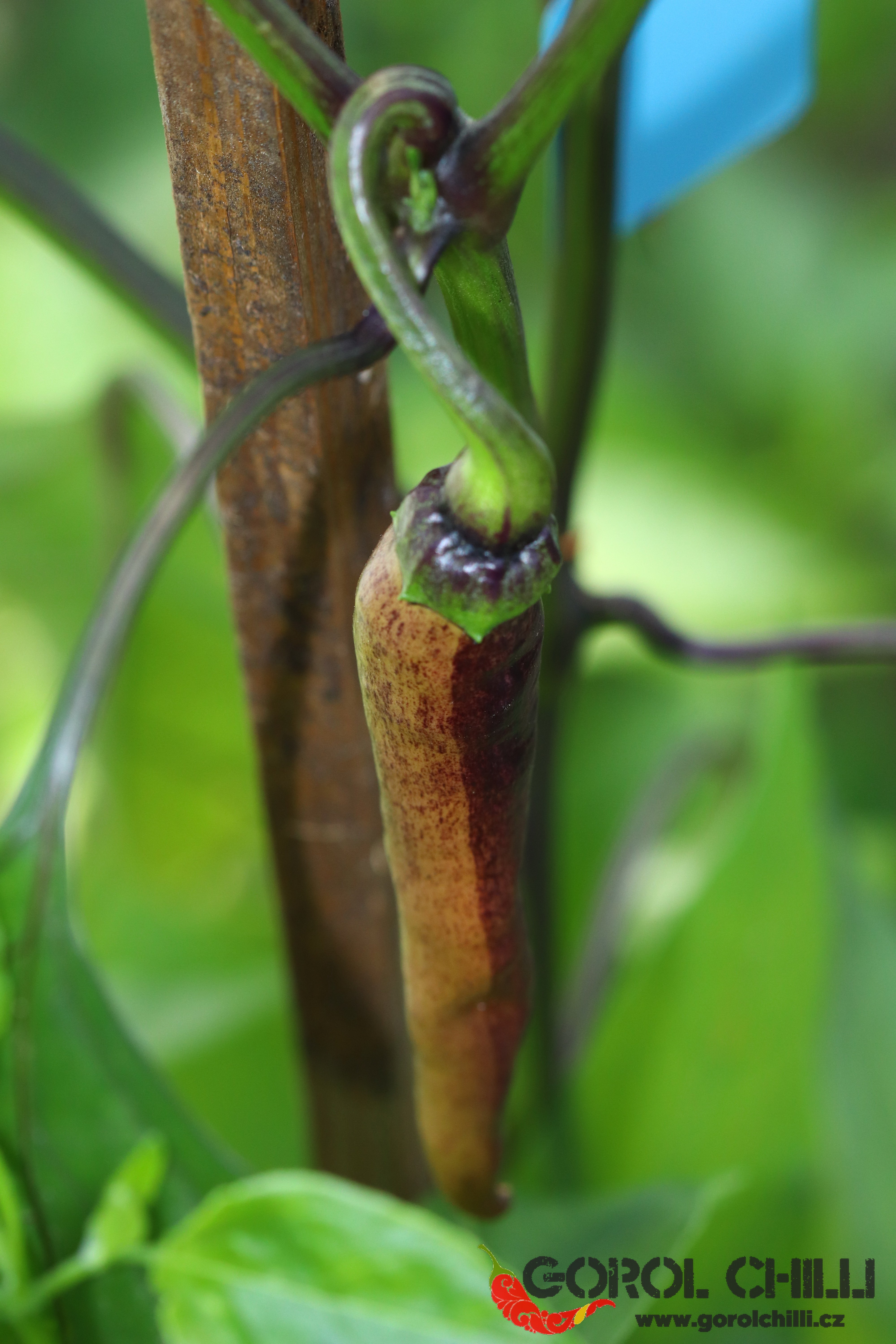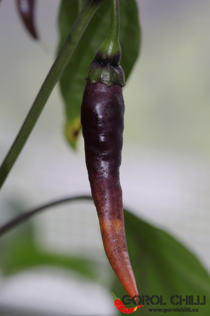Plody: Podlouhlé, tvarem typické chilli papričky typu beraní roh / cayenne. Papriky jsou orientované směrem dolů a nejprve jsou temně fialové. Následně zrají do různých odstínů mezi oranžovou a cappuccino, přičemž si ponechávají různé vzory fialové (nejčastěji podélné zebrování). Zajímavé je, že fialové žíhání v plné zralosti mnohdy přejde do hnědé barvy.