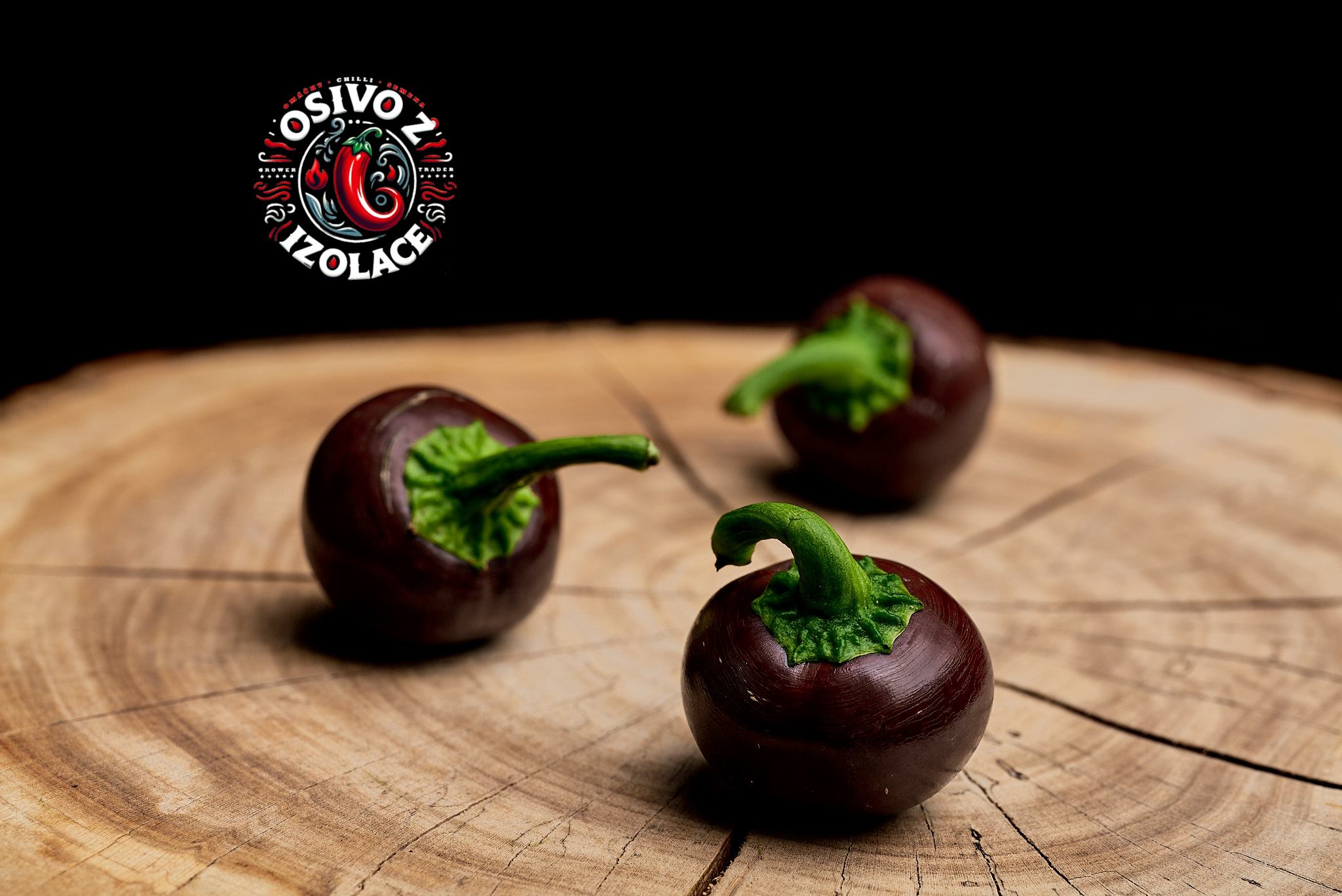 Plody: Malé, kulaté, třešňovitého tvaru (cherry pepper), s hladkým a lesklým povrchem. Plody dosahují průměru 2–3 cm. Zrají ze zelené barvy do syté, tmavě hnědé až čokoládové barvy. Jsou masité a křupavé, s tlustou stěnou. Díky svému tvaru a barvě jsou velmi atraktivní a hodí se k plnění nebo dekoraci.