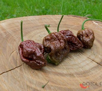 Plody: Robustní, soudečkovité, asi 7-10 cm dlouhé a 2-2,5 cm široké. Zprvu jsou zelené, následně zrají do velmi tmavého odstínu hnědé barvy.  Chuť a pal: Jedny z nejchutnějších superhot odrůd, které jsme kdy měli. Chuť je ovocná, exotická…