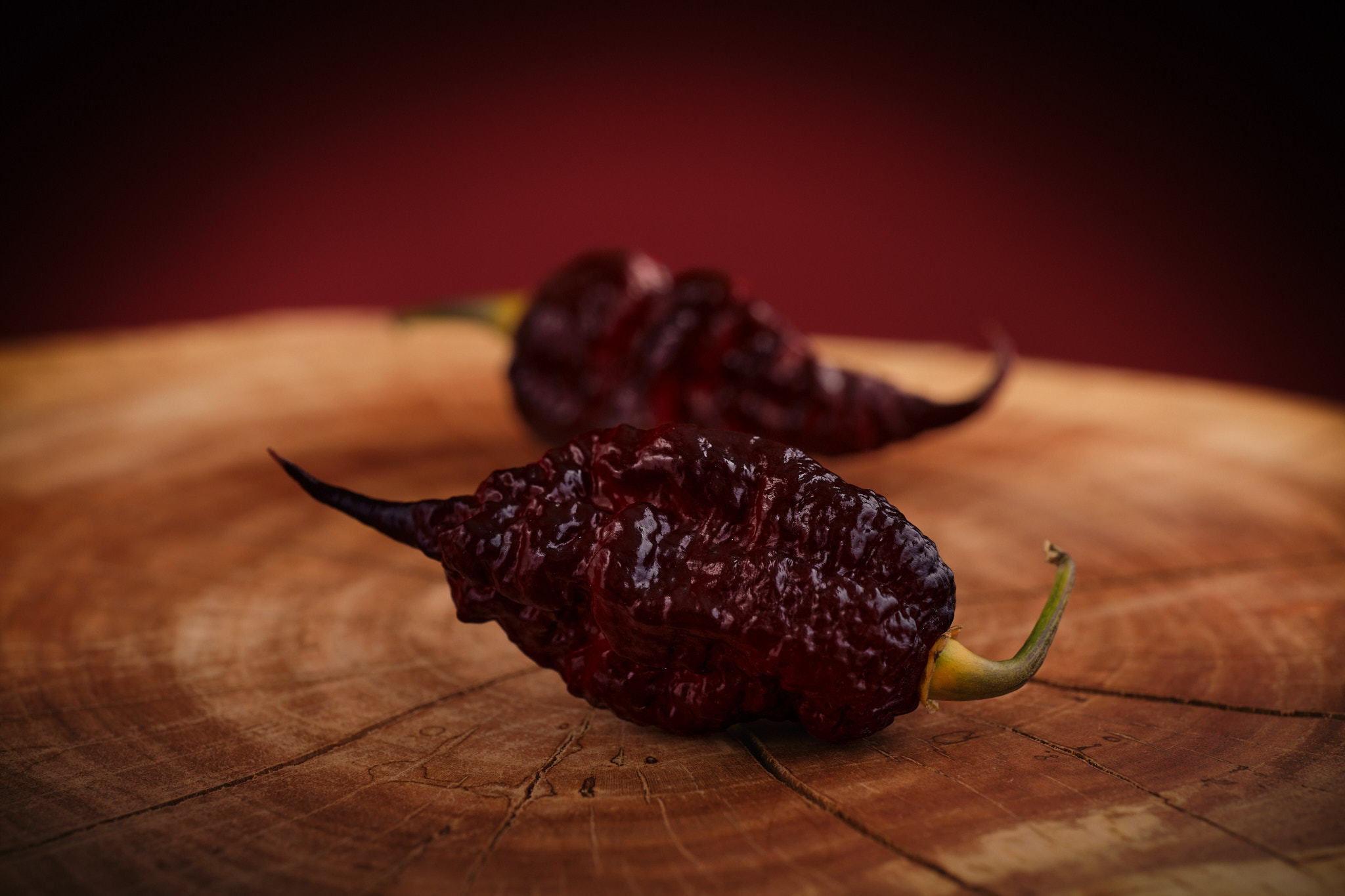 Plody: Robustní, podlouhle a zvláště krabaté. Většinou jsou zakončeny výraznějším ocáskem nebo alespoň špičkou. Nezralé papriky mají nádherně sytou fialovou barvu. Finální barva se popisuje docela složitě. Jedná se o směs fialové s až namodrylými tóny a rubínově červené barvy. Jedna z nejkrásnějších paprik a nejkrásnější superhot vůbec, který jsme kdy viděli.