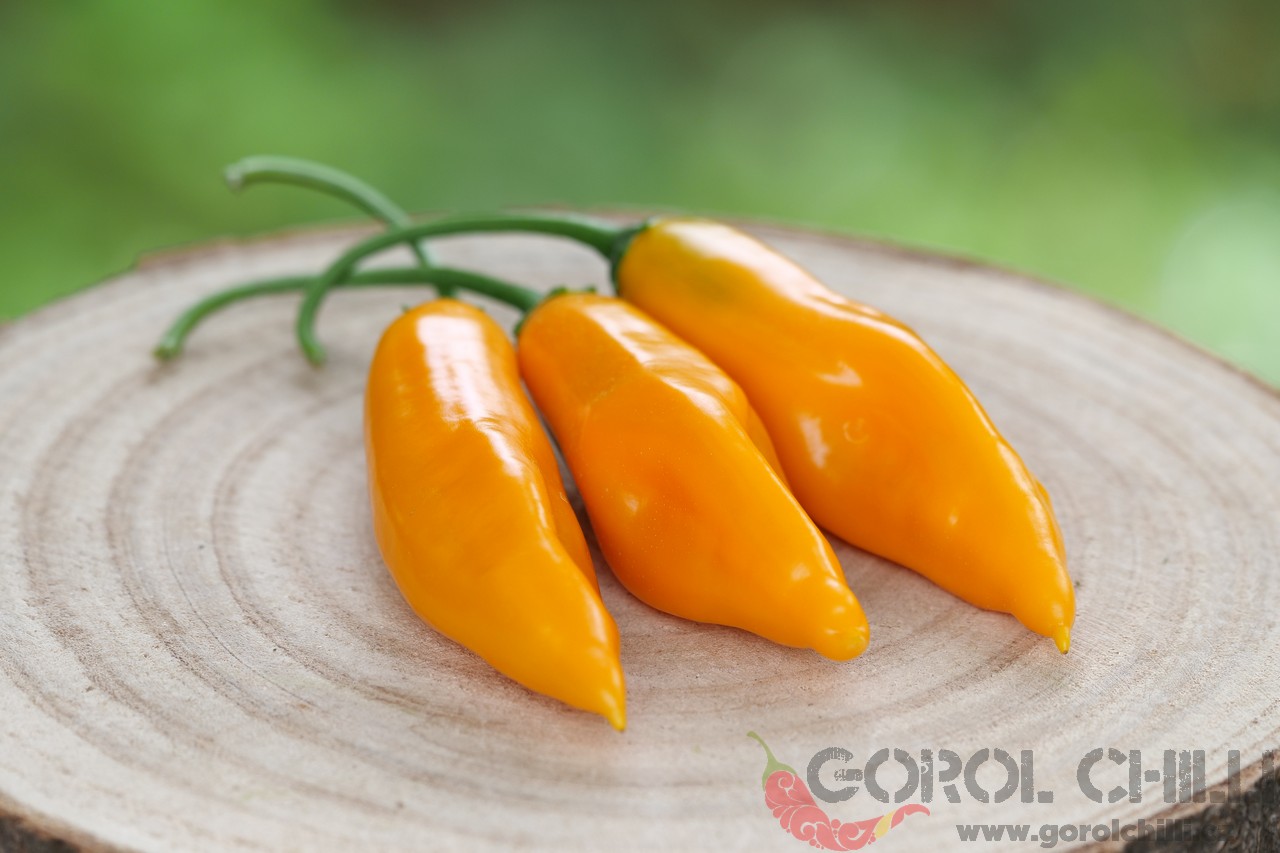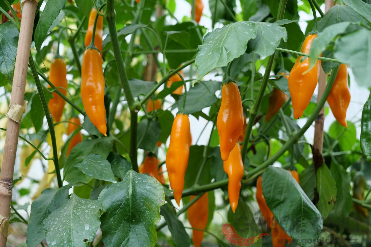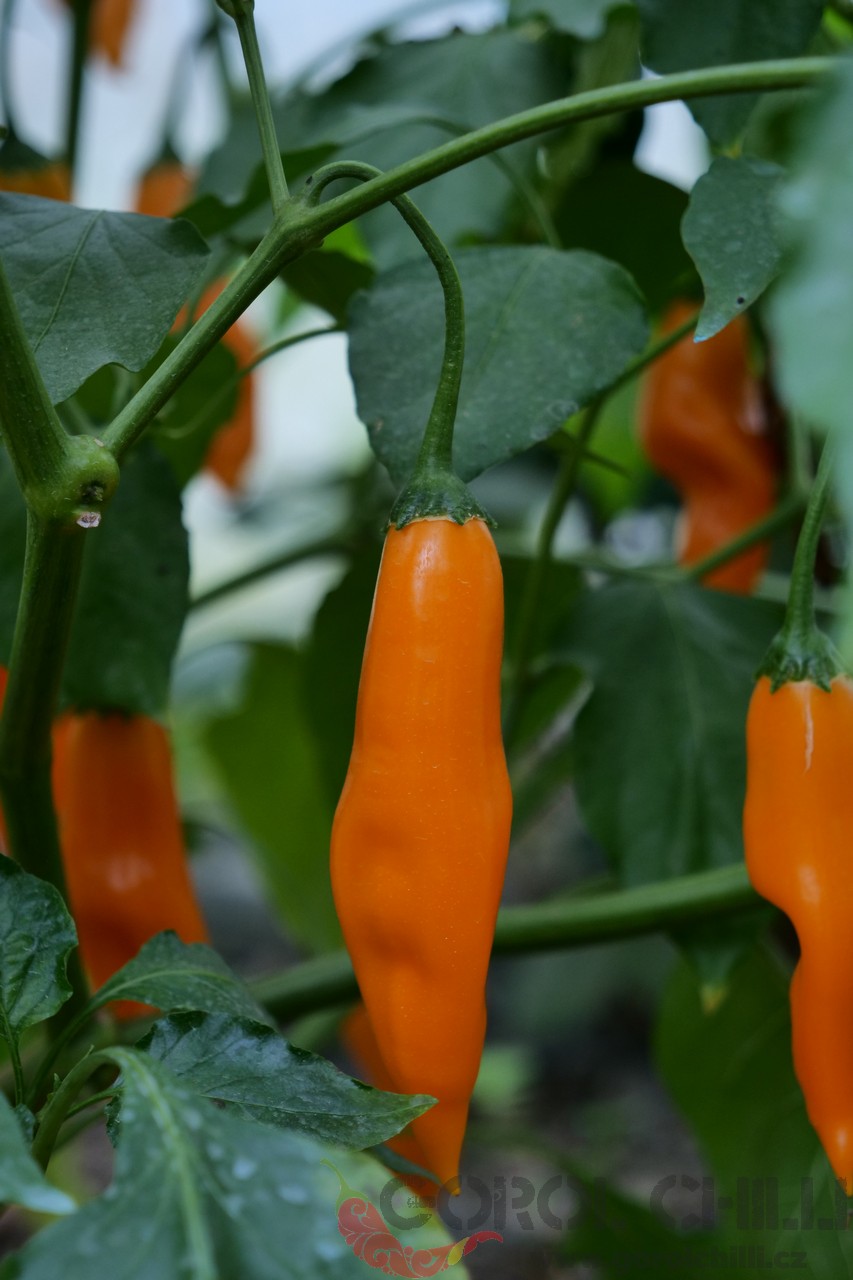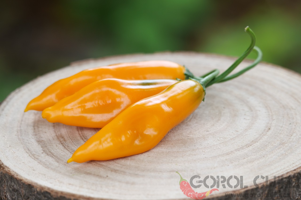 Plody: Podlouhlé, kuželovité, dorůstající okolo 5-7 cm délky a asi 2-3 cm v průměru. Zrají ze zelené do svítivé žluté barvy.  Chuť a pal: Papriky mají velmi jemnou ovocnou chuť s exotickým kořeněným aroma. Pálivost se pohybuje okolo 200…