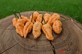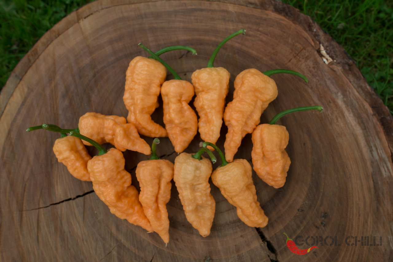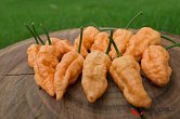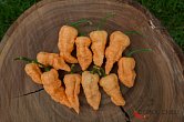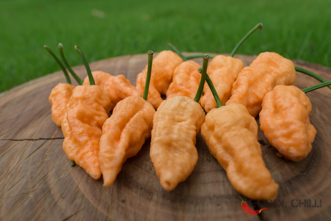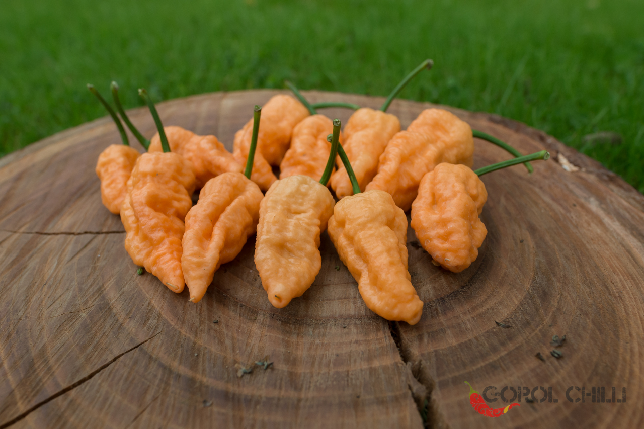 Plody: Robustní, zavalité, svým způsobem připomínají lehce krabaté habanero. Dorůstají délky okolo 5-6 cm a průměru asi 4-5 cm. Zprvu jsou světle zelené, následně zrají do bledě oranžové barvy.  Chuť a pal: Plody se vyznačují jemnou…