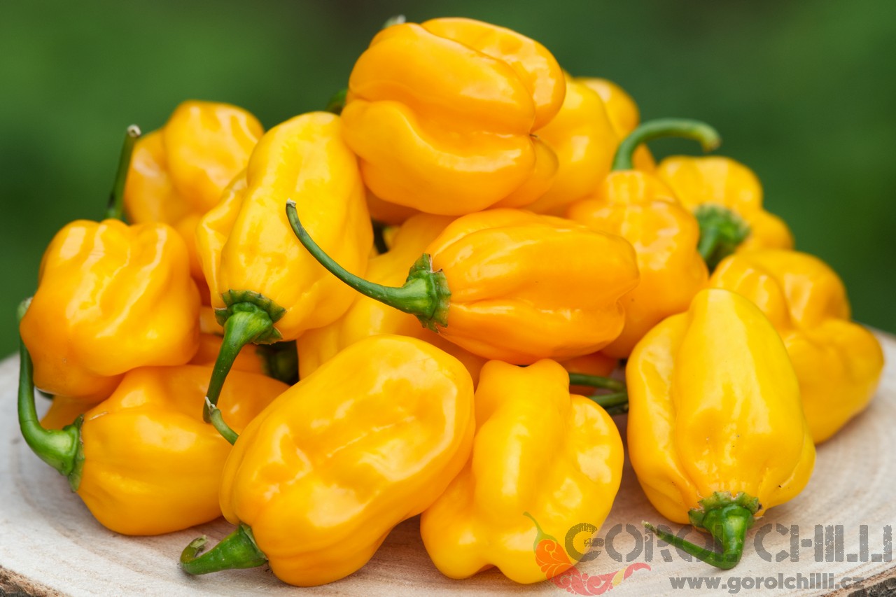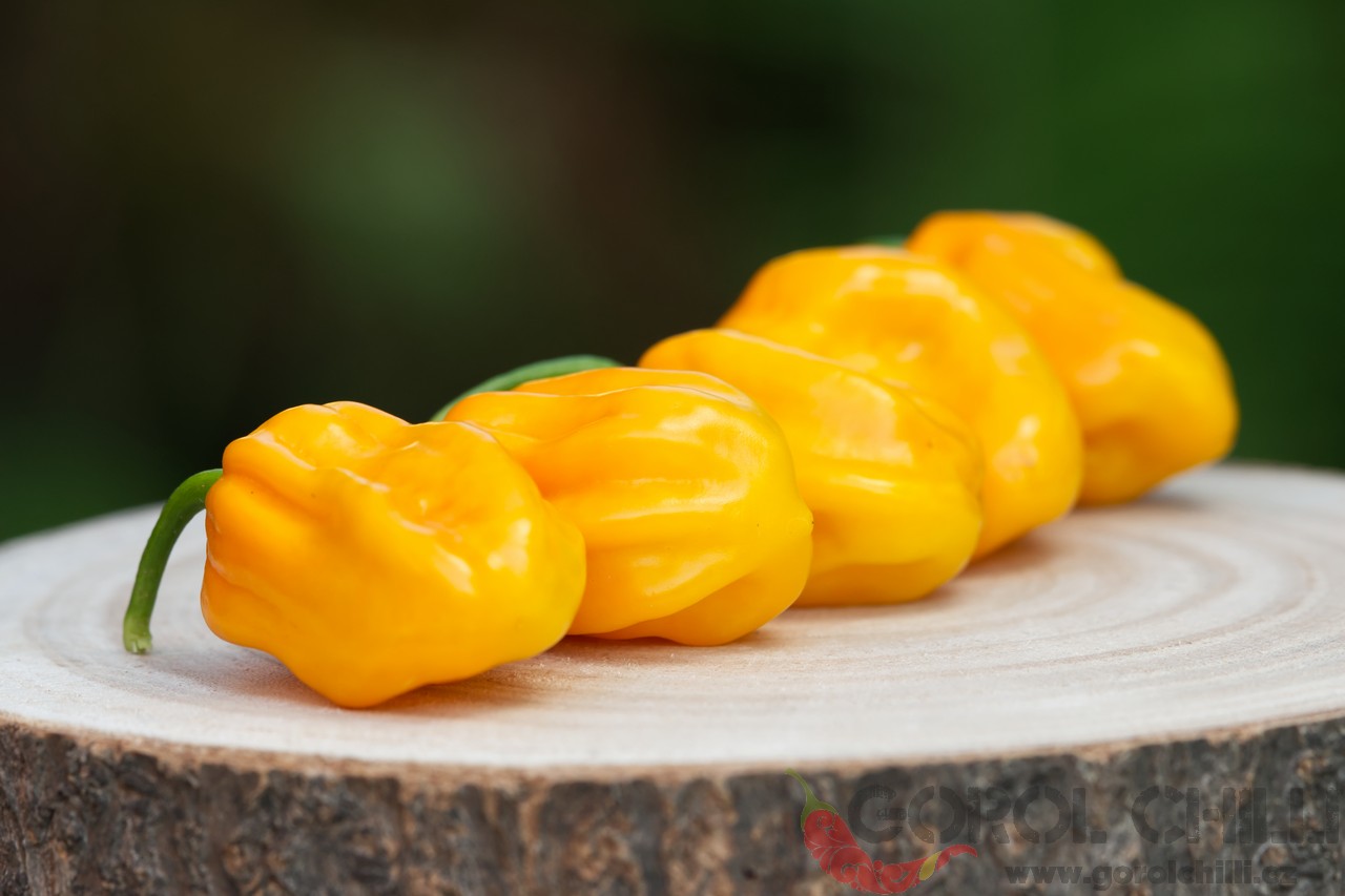 Plody: Soudečkovité, oproti běžným Habanerům však mírně podlouhlé, mají tedy celkově užší dojem. Dorůstají délky okolo 5 cm a asi 3-3,5 cm v průměru. Zrají ze zelené do žluto oranžové barvy.  Chuť a pal: Papriky mají osvěžující ovocnou…