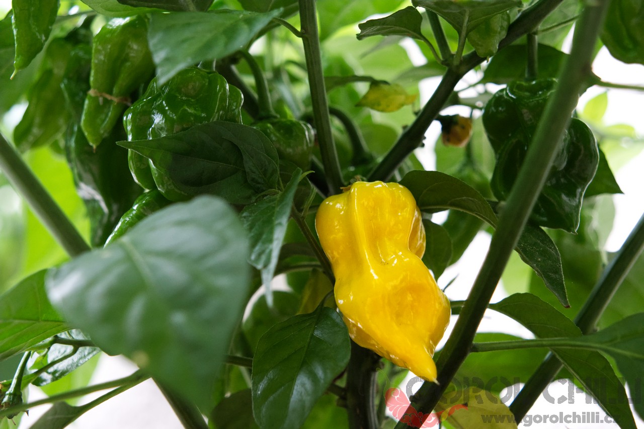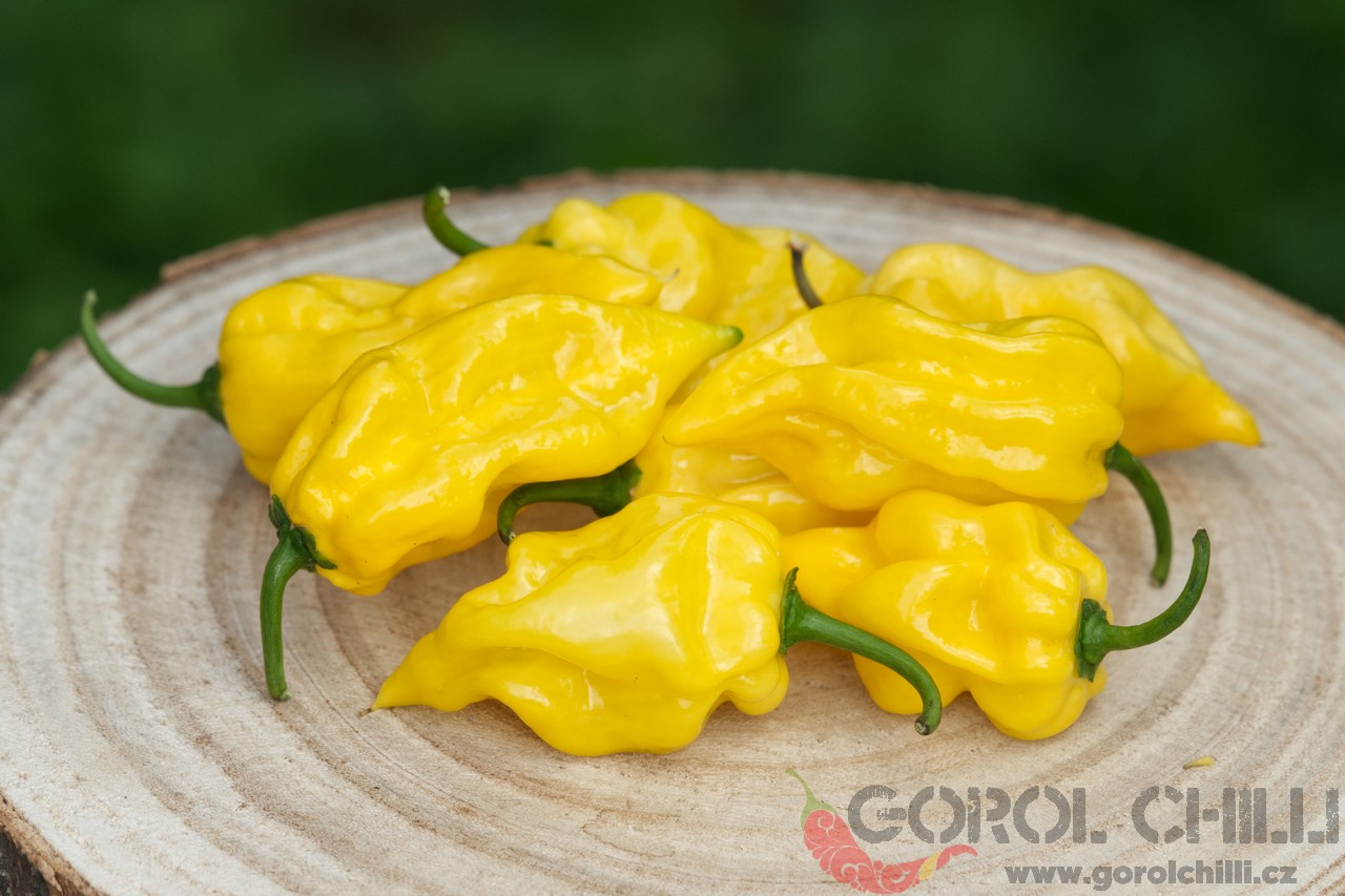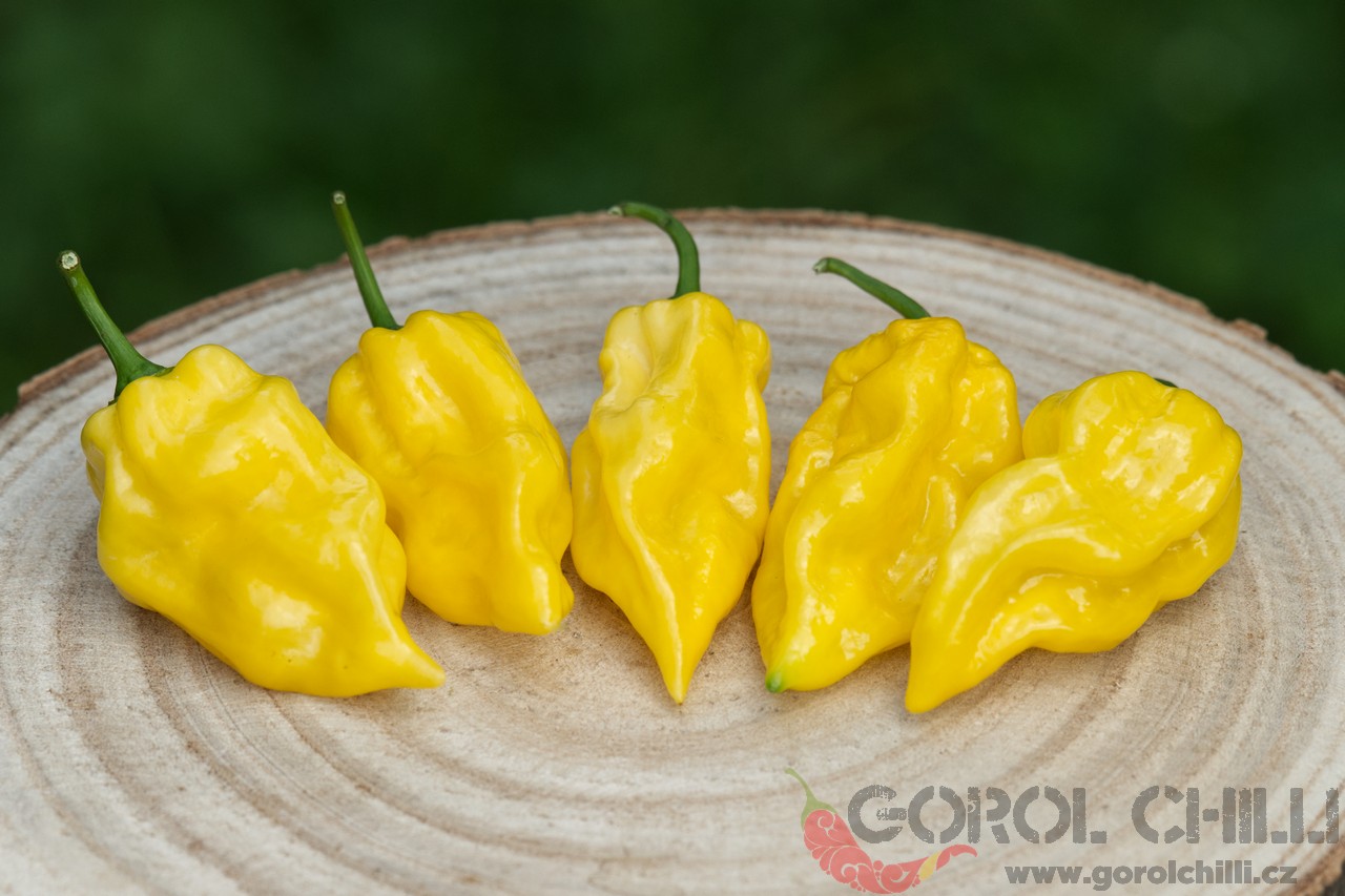 Plody: Robustní, zavalité, svým způsobem připomínají lehce krabaté habanero. Dorůstají délky okolo 5-6 cm a průměru asi 4-5 cm. Zprvu jsou světle zelené, následně zrají do bledě oranžové barvy.  Chuť a pal: Plody se vyznačují jemnou…