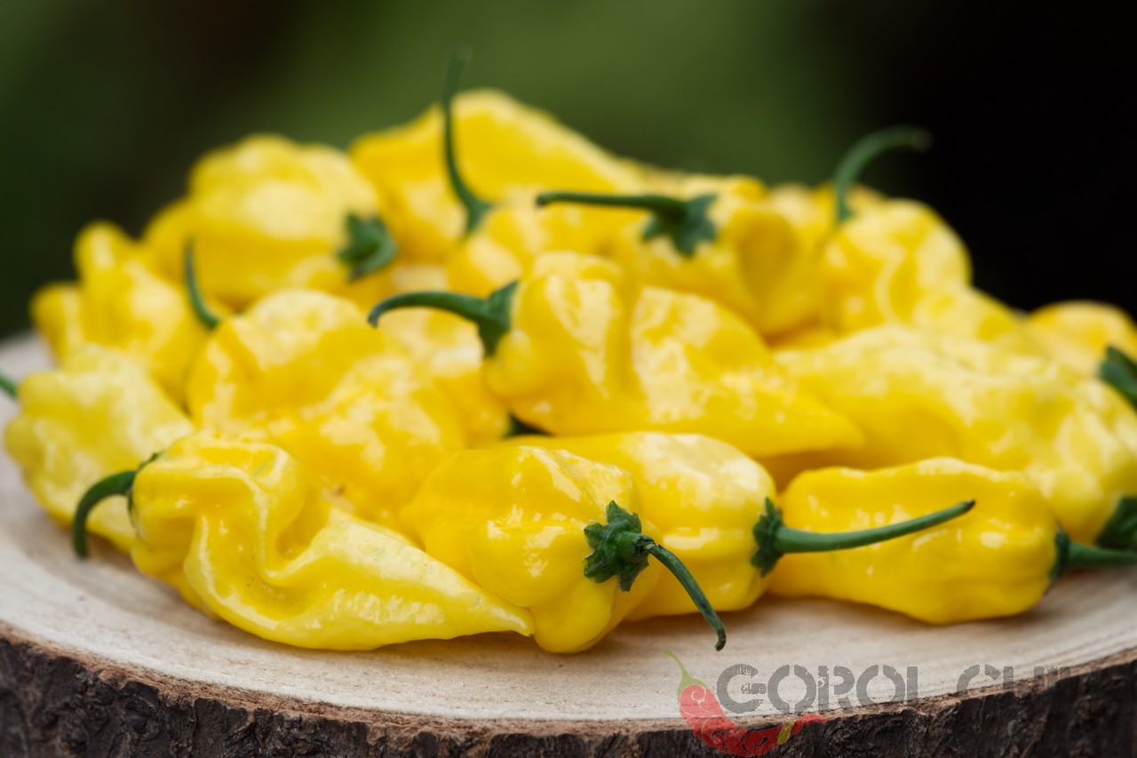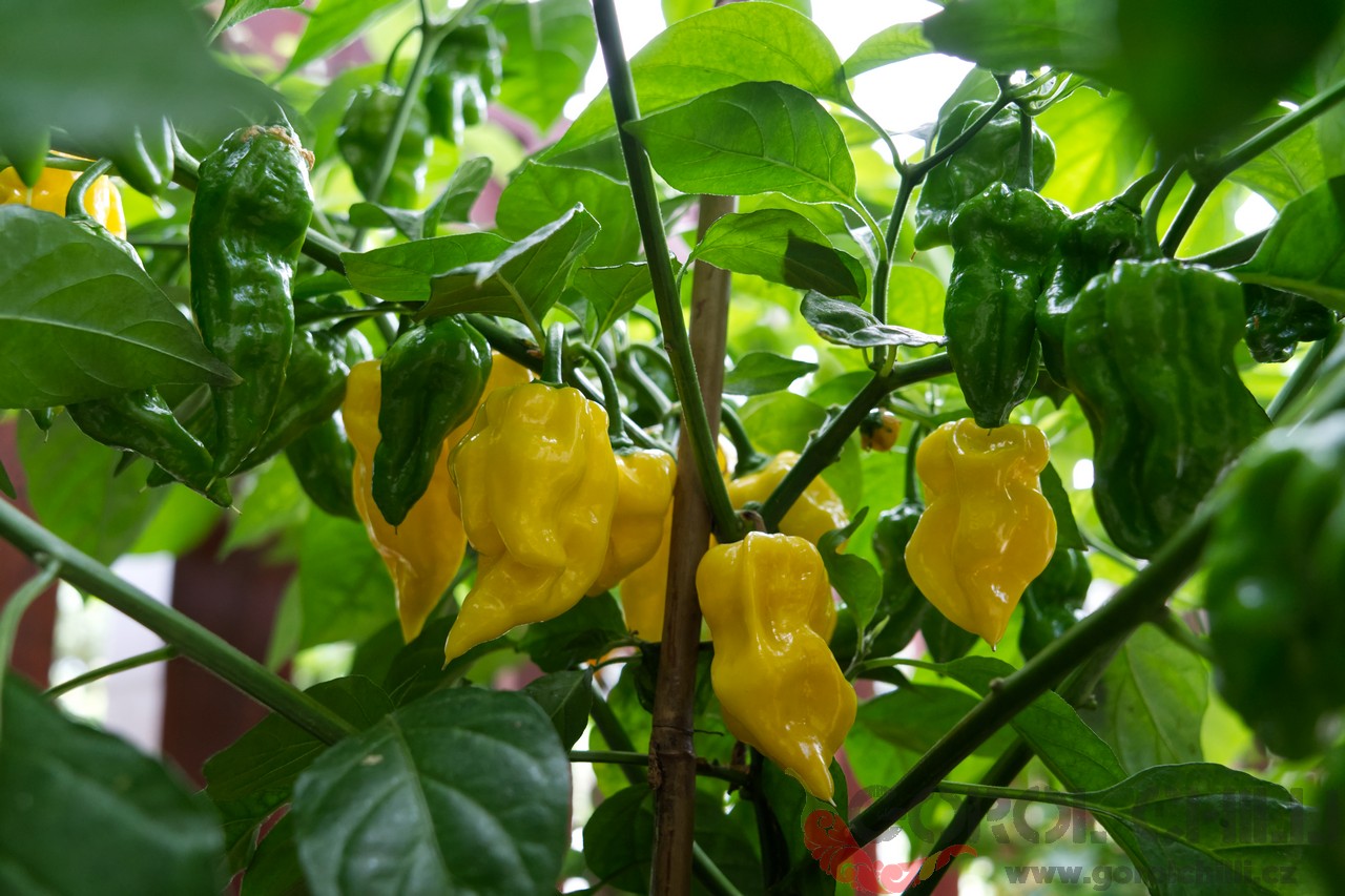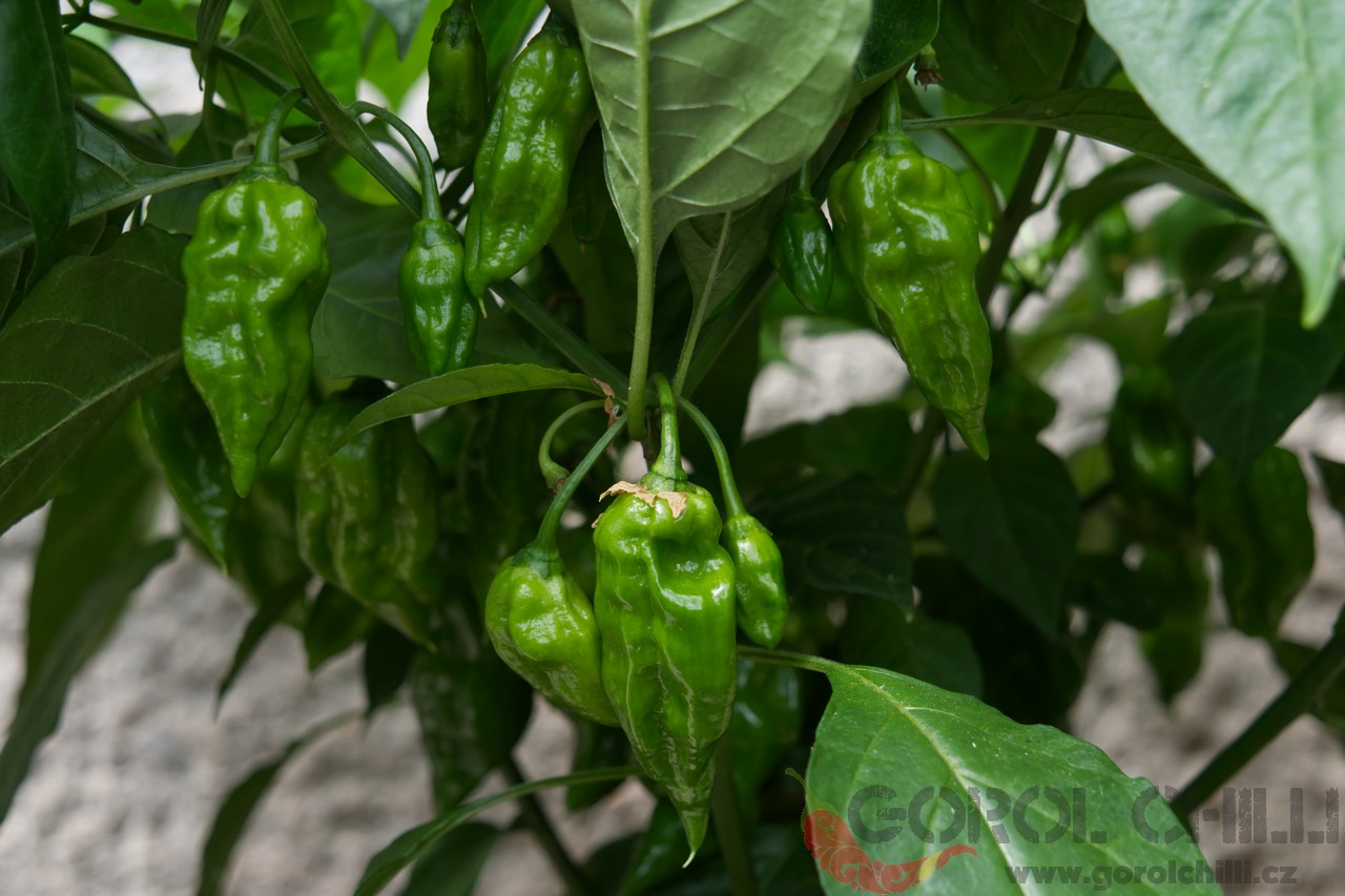 Plody: Robustní, zavalité, svým způsobem připomínají lehce krabaté habanero. Dorůstají délky okolo 5-6 cm a průměru asi 4-5 cm. Zprvu jsou světle zelené, následně zrají do bledě oranžové barvy.  Chuť a pal: Plody se vyznačují jemnou…
