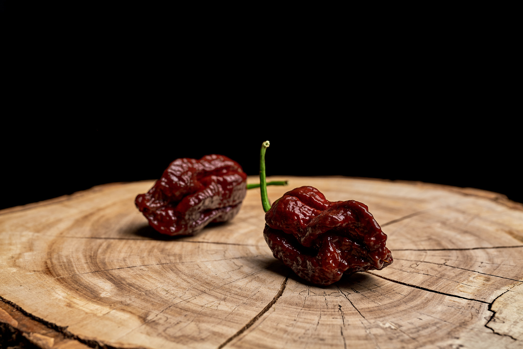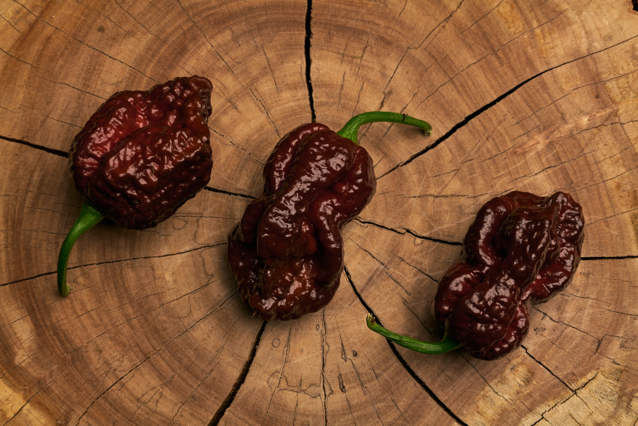 Plody: Robustní, soudečkovité a výrazně zvrásněné, typicky ve stylu extrémně pálivých „superhotů“. Dorůstají zpravidla délky okolo 4–6 cm a průměru kolem 3–4 cm. Zprvu jsou světle až středně zelené, postupně zrají do tmavě hnědé barvy podle podmínek pěstování.