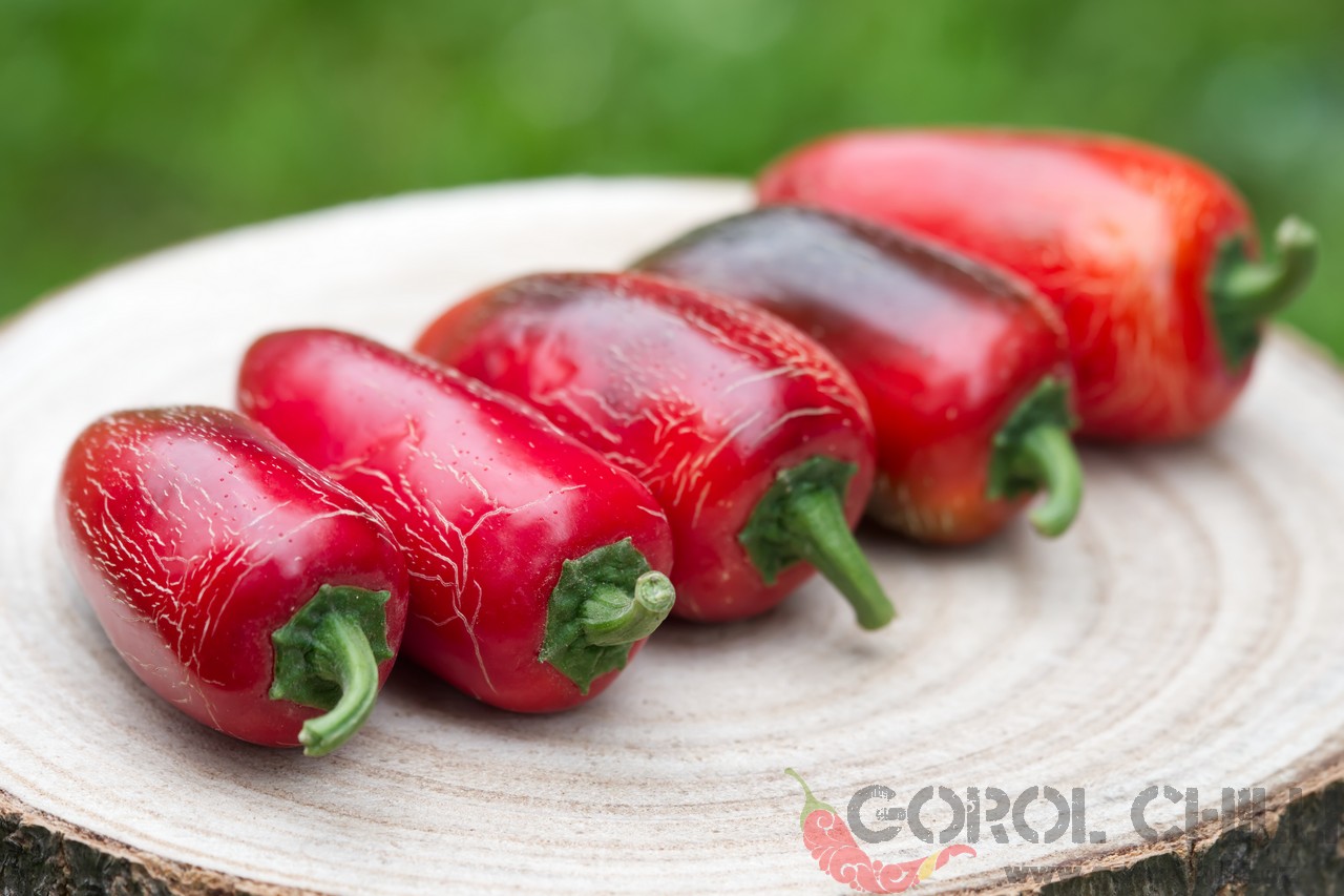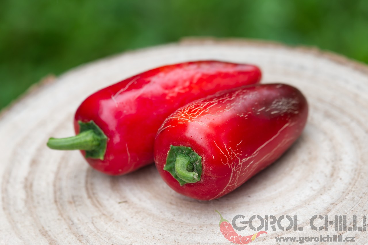 Plody: Robustní, podlouhlé a mírně kónické. Dorůstají délky okolo 7,5-10 cm a průměru kolem 3,5-4 cm. Zprvu jsou zelené, poté zrají do červené barvy. Na plodech se většinou nachází řídce rozprostřené kornatění.
