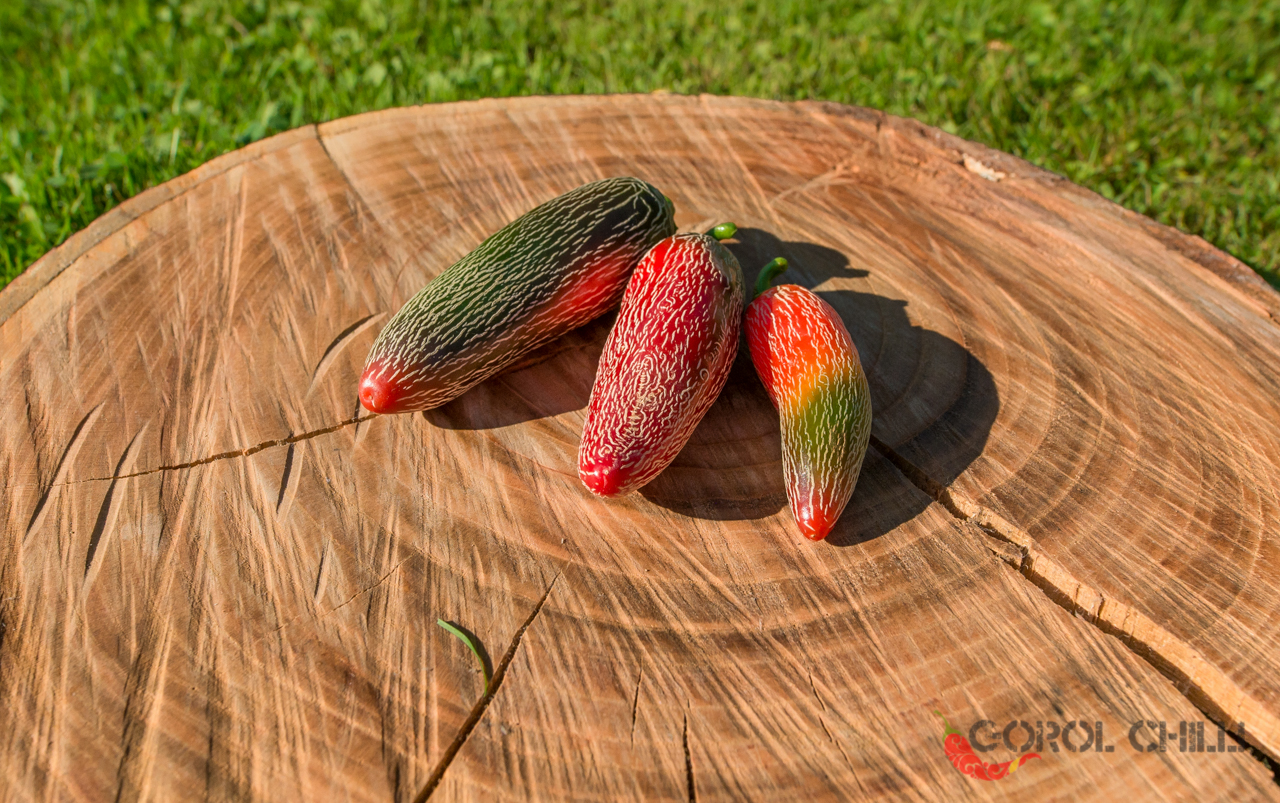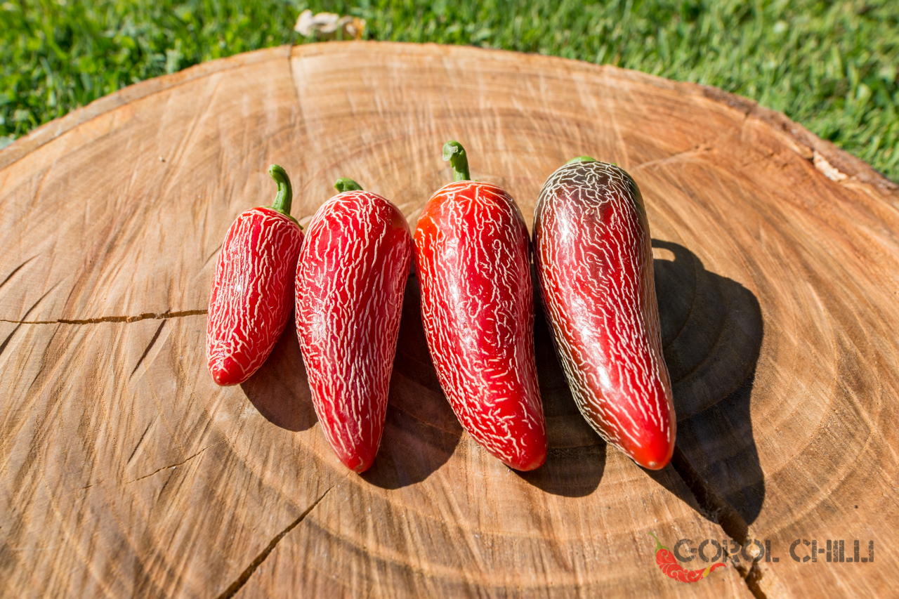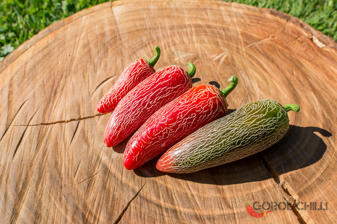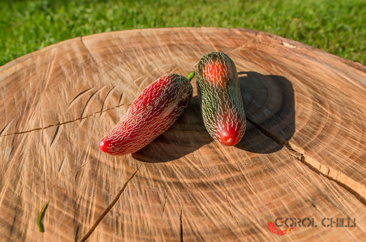 Plody: Jedno z nejkrásnějších Jalapeň na světě. Plody jsou podlouhlé, spíše užší, měří okolo 8-11,5 cm na délku a asi 2-2,5 cm v průměru. Zprvu jsou zelené, následně zrají do svítivé červené barvy. Povrch plodů je protkán neuvěřitelně krásným kornatěním, které jim dodává zcela unikátní vzhled.