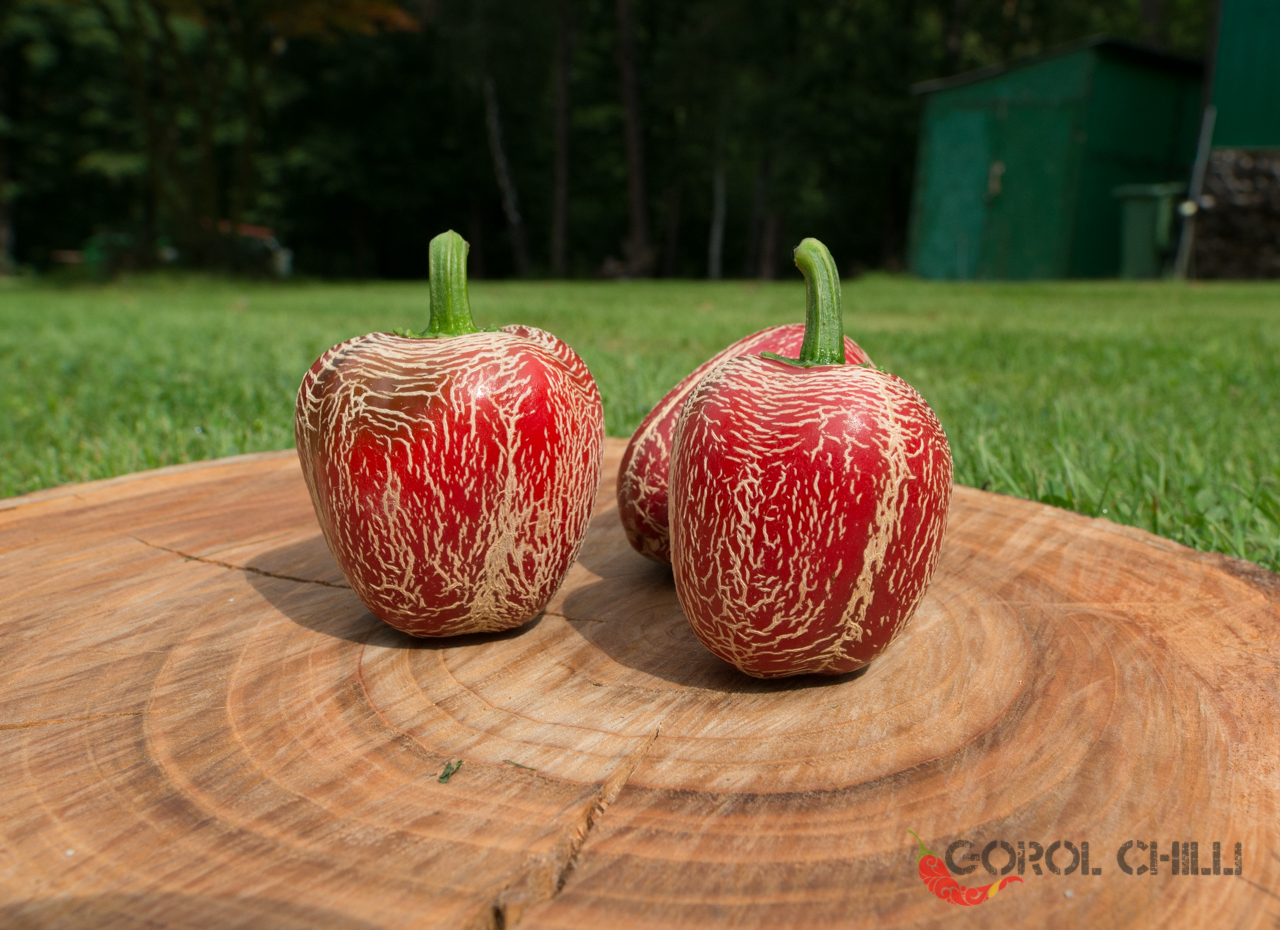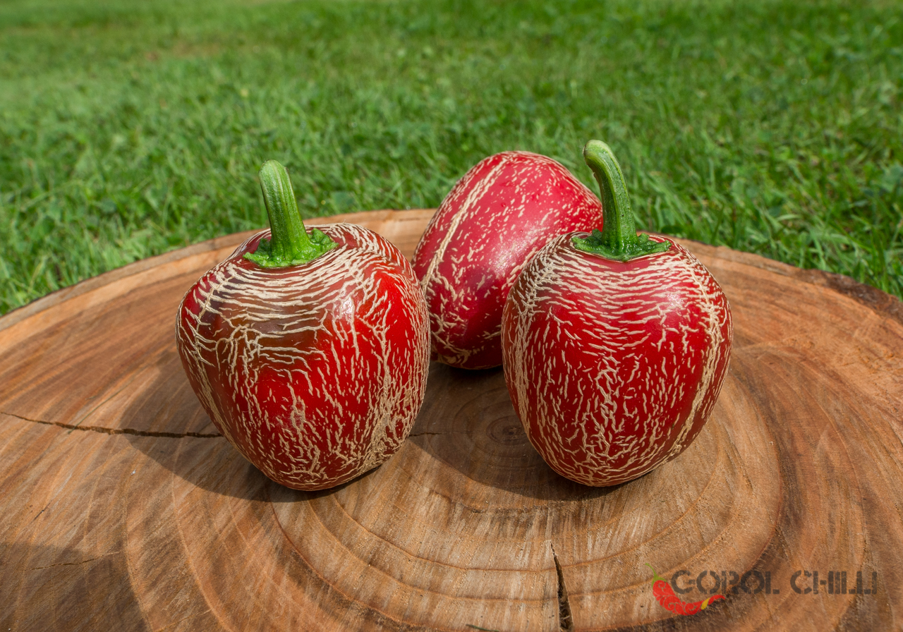 Plody: Robustní, soudečkovité a s velmi zvrásněným povrchem. Jsou asi 4-6 cm dlouhé a okolo 3-4 cm široké. Zprvu jsou zelené, následně zrají do sytě červené barvy.  Chuť a pal: Plody jsou typické svým bohatým ovocným a kořeněným aroma a…