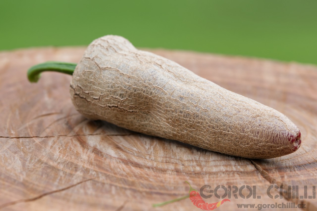 Plody: Středně velké, masité, se někdy se zvrásněným a pokrouceným povrchem, který je typický pro superhot papričky. Plody jsou často nepravidelné a mohou mít malý hrot nebo ocásek na špičce. Zrají ze zelené barvy do jasně, až sytě červené…