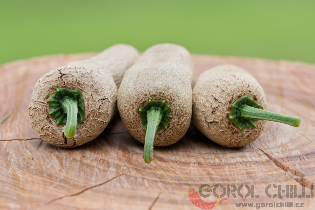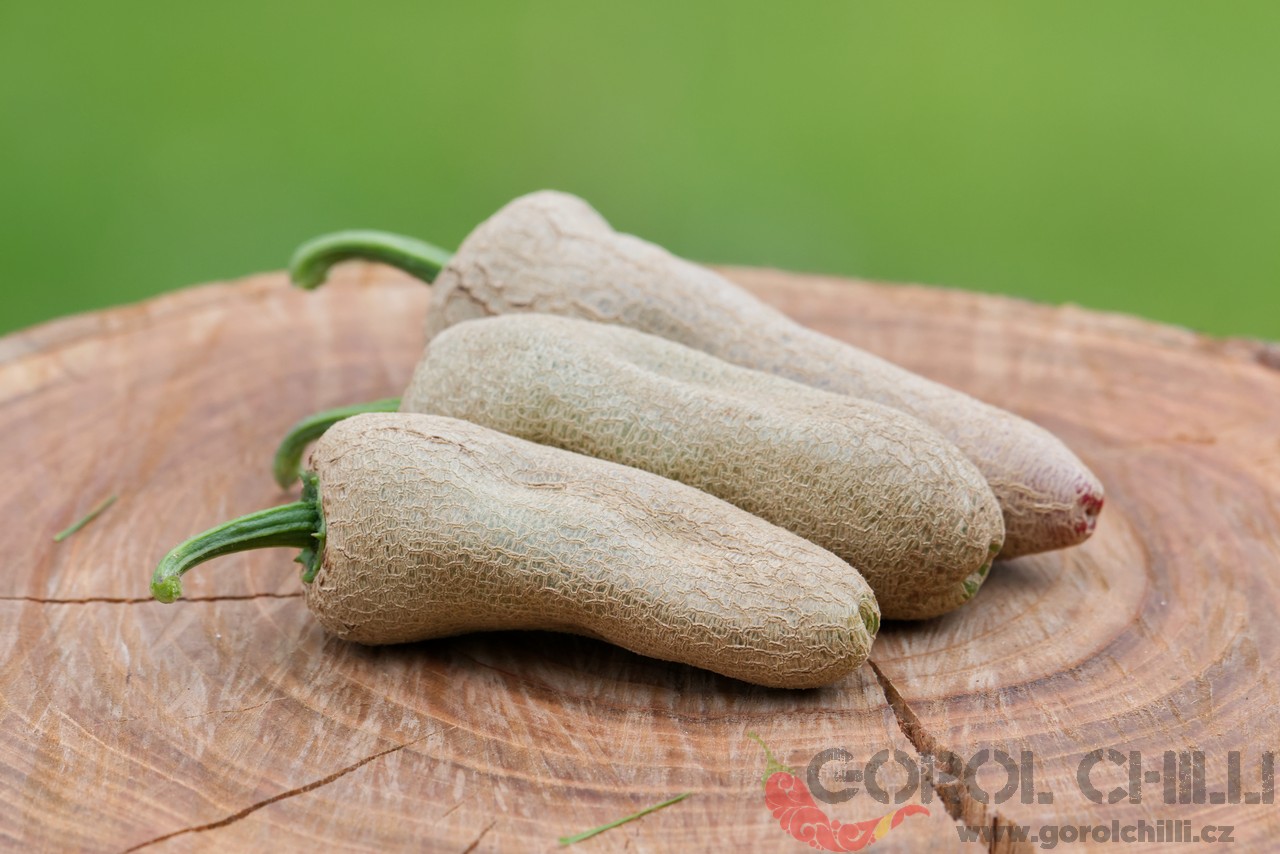 Plody: Robustní, kompaktní, asi 5-6 cm dlouhé a okolo 3,5-4 cm široké. Mají silně zvrásněný povrch. Zrají z jasně zelené do svítivě žluté barvy.  Chuť a pal: Papriky dosahují velmi vysokého palu okolo 1-1,5 milionu SHU. Chuť je kořeněná,…