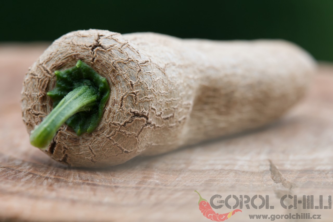 Plody: Dlouhé, úzké a s krabatým povrchem. Dosahují délky okolo 6-8 cm a průměru asi 2-3,5 cm. Zprvu jsou světle zelené až bělavé, později zrají do jasně bílé barvy. Chuť a pal: Papriky mají spíše jemnou a silně kořeněnou chuť, kterou…