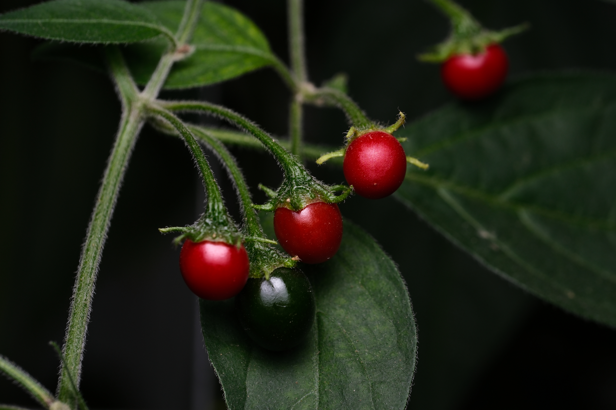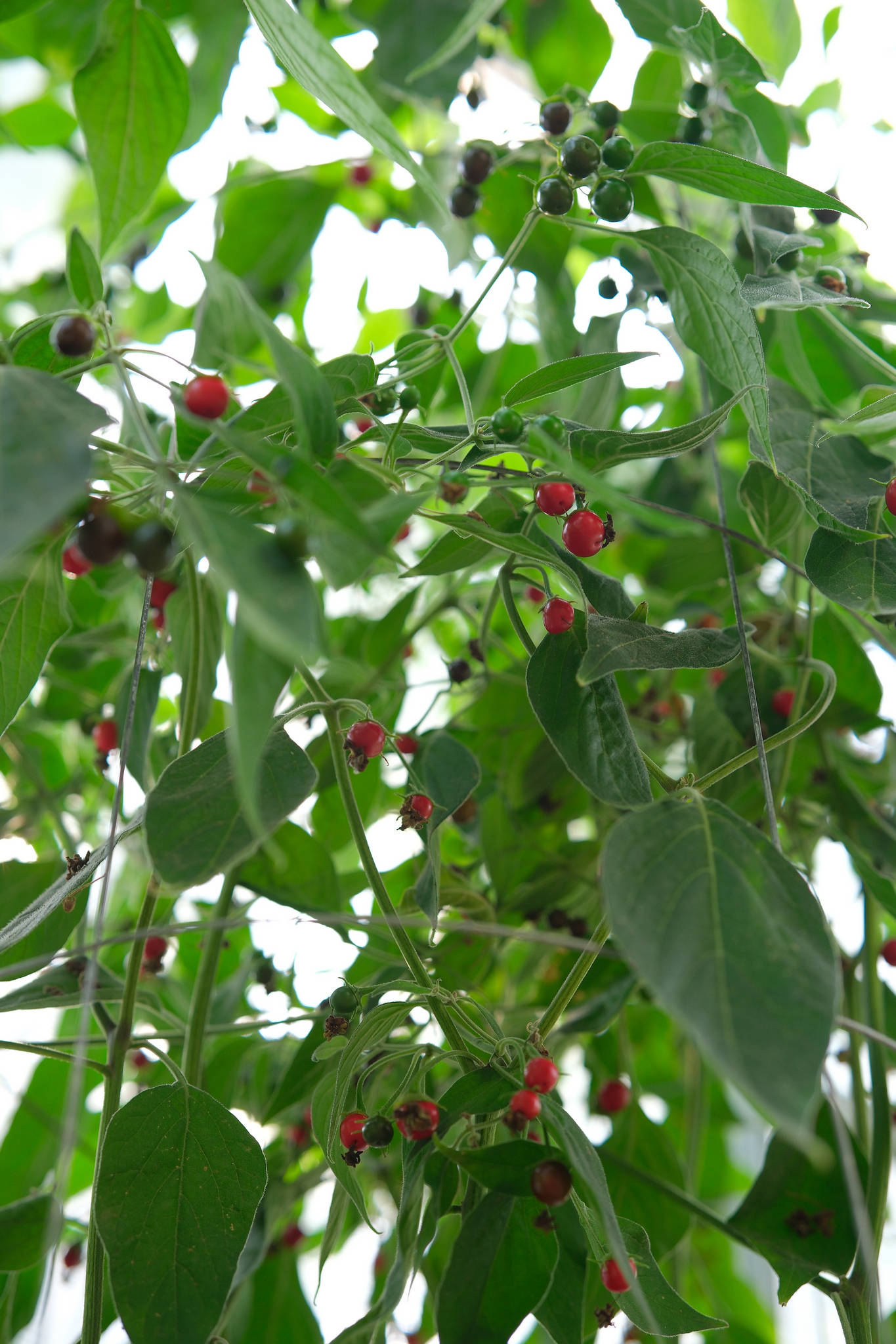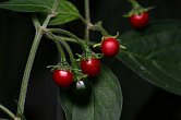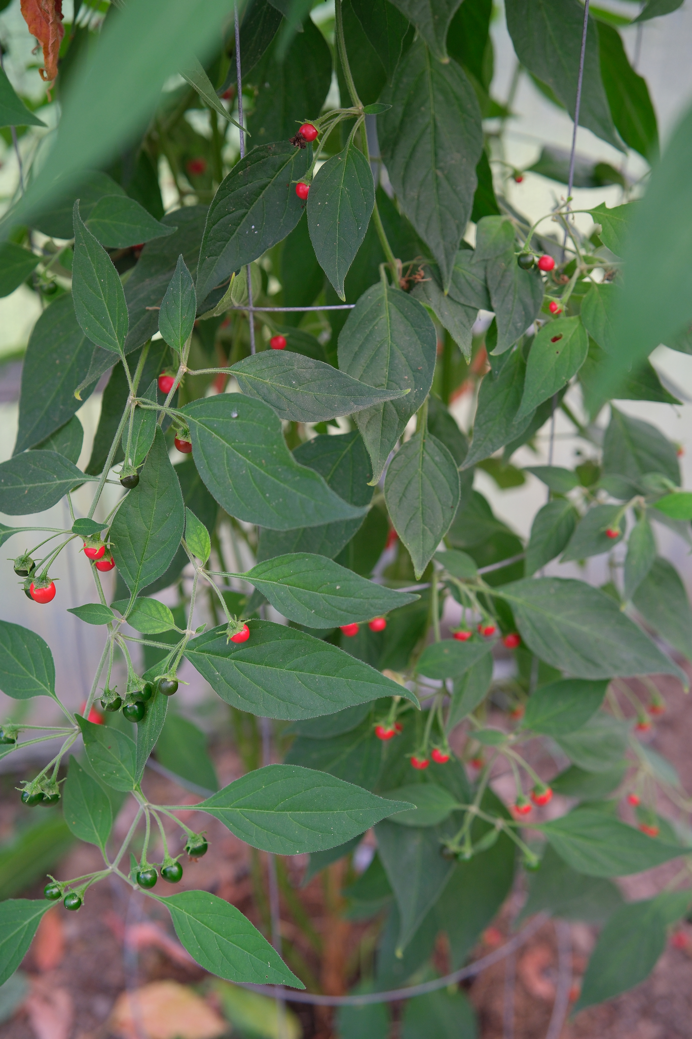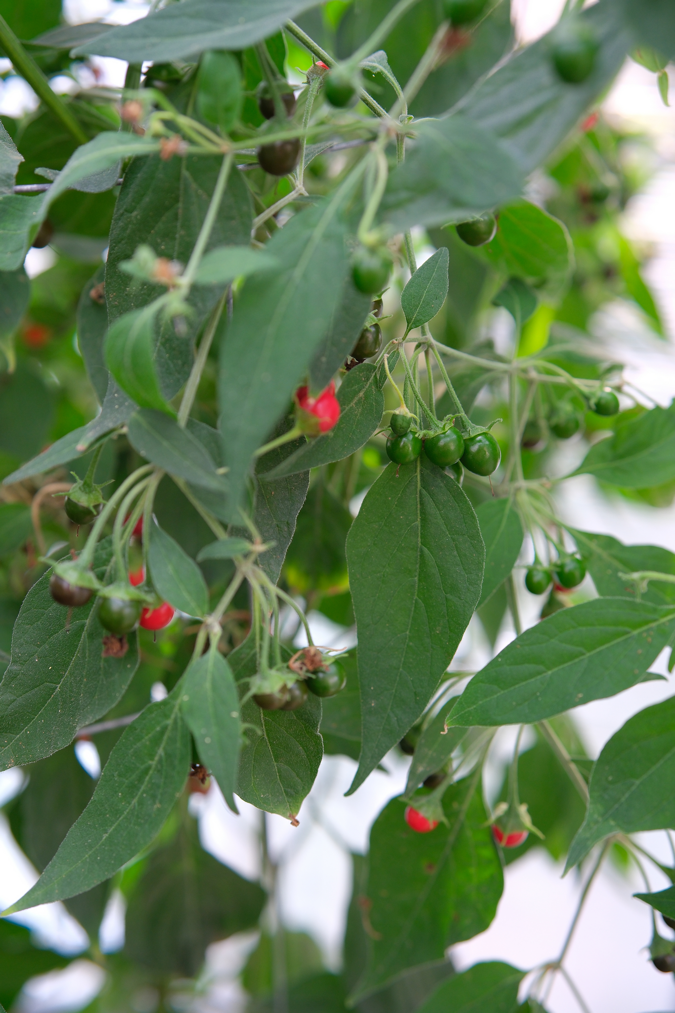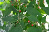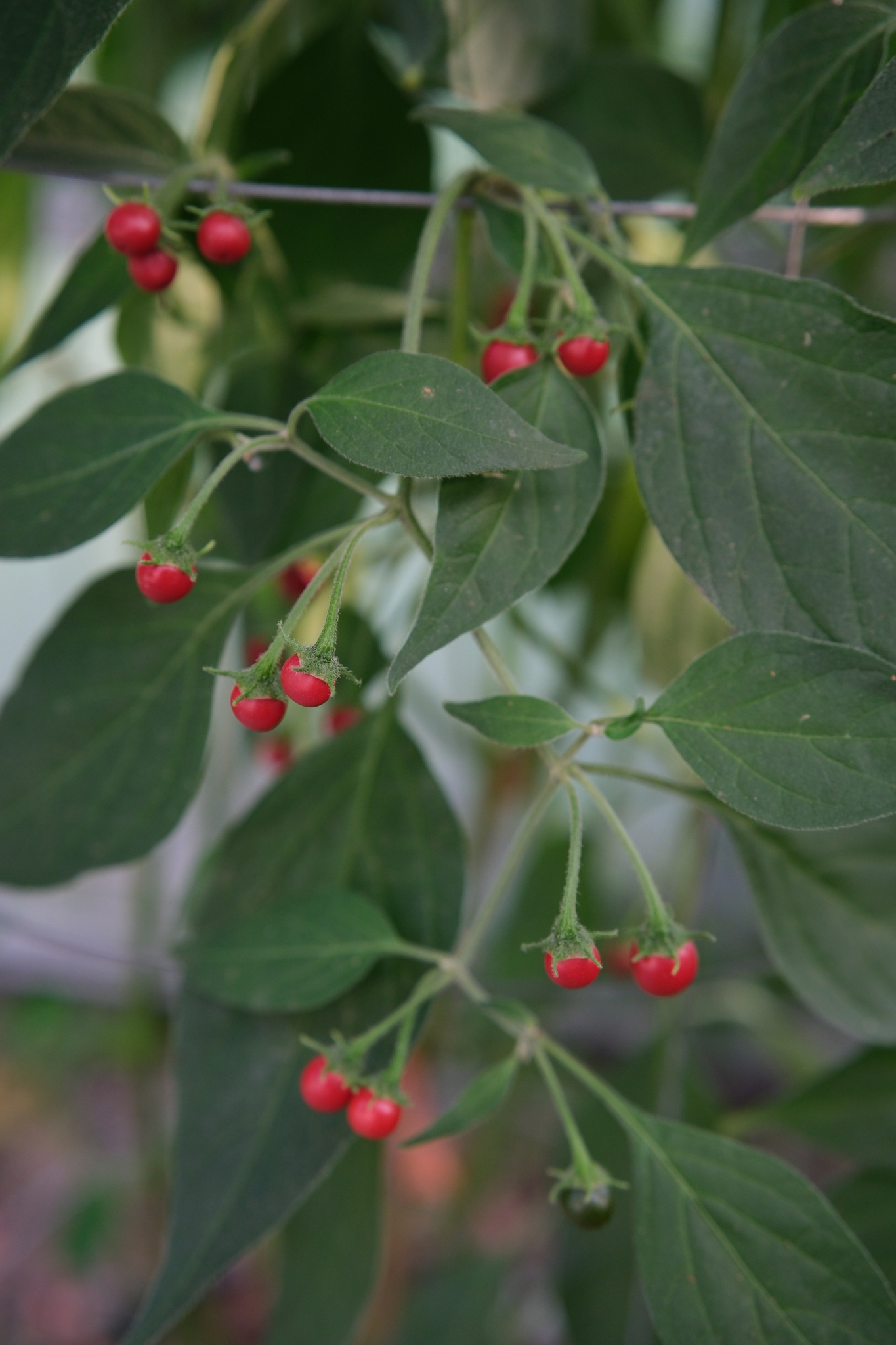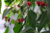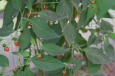 Plody: Kulaté, někdy jemně kónické, zpravidla okolo 1 cm v průměru. Zprvu jsou tmavě zelené, místy fialové, poté zrají do jasně červené barvy. Plody vyrůstají téměř kolmo dolů směrem k zemi.