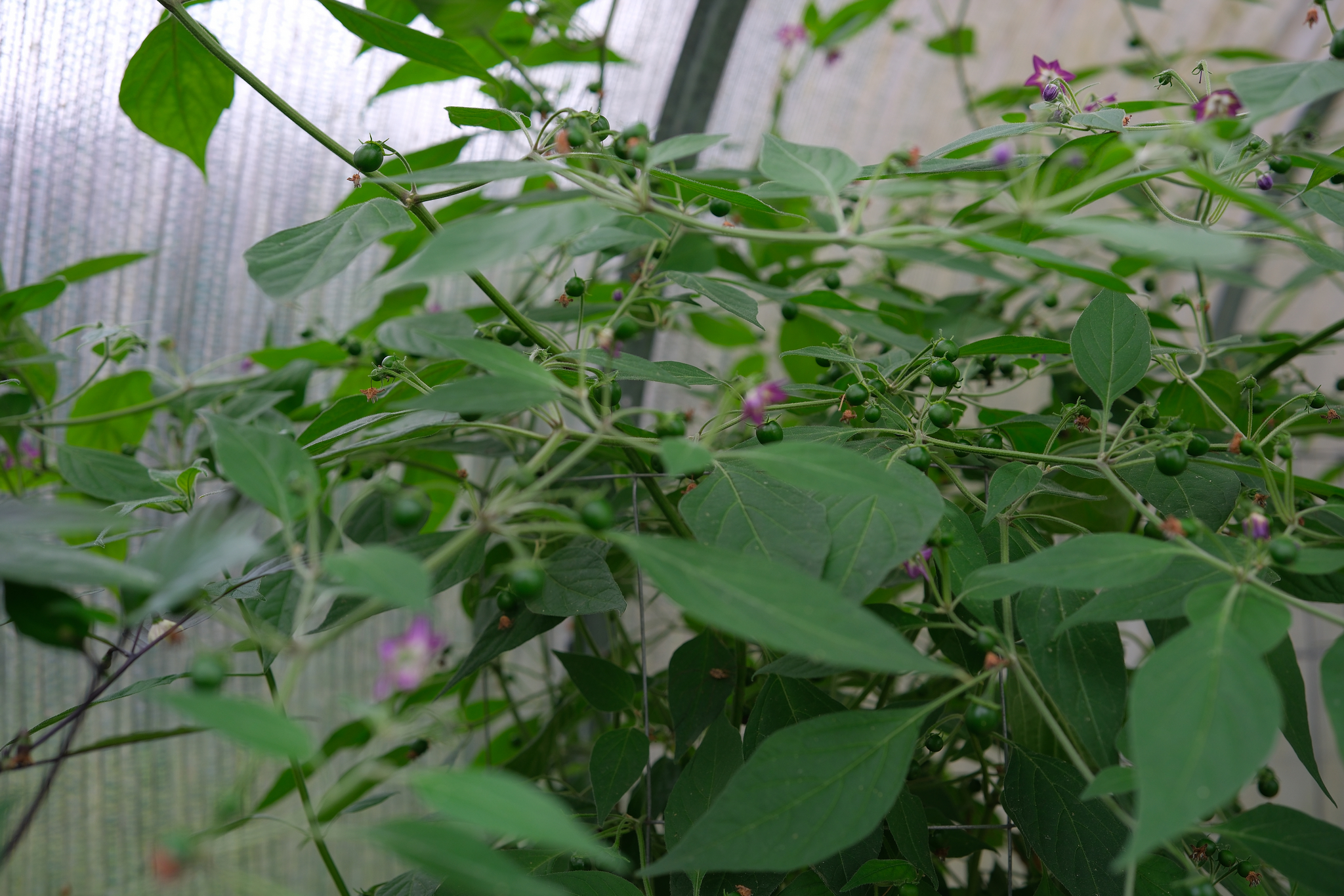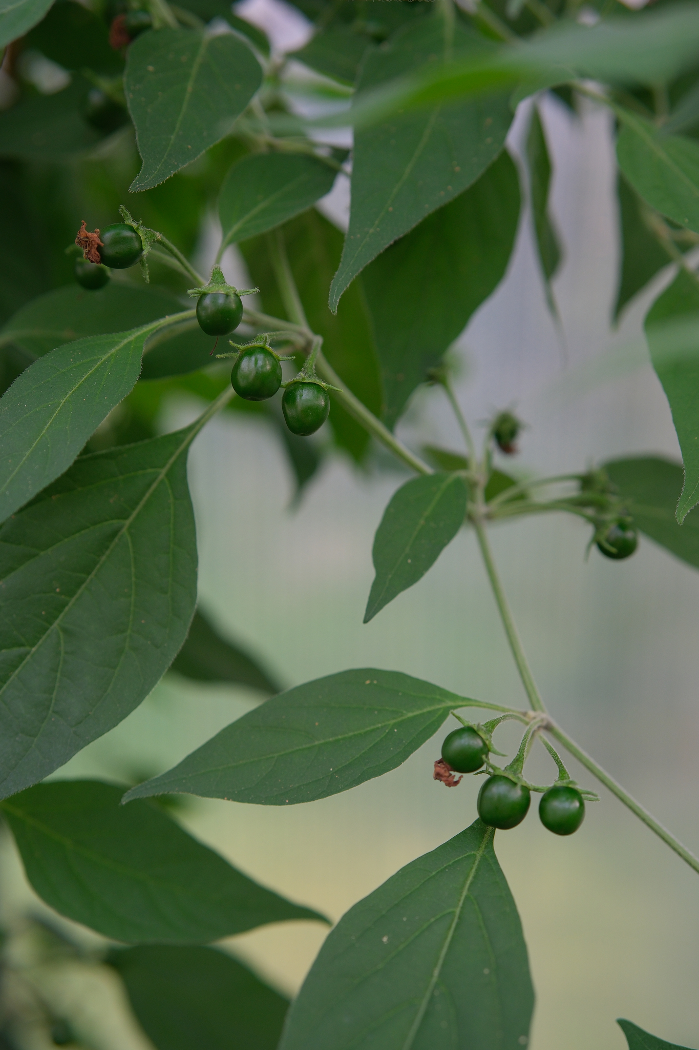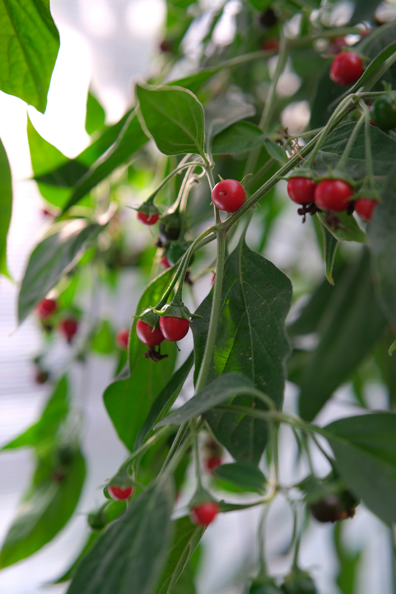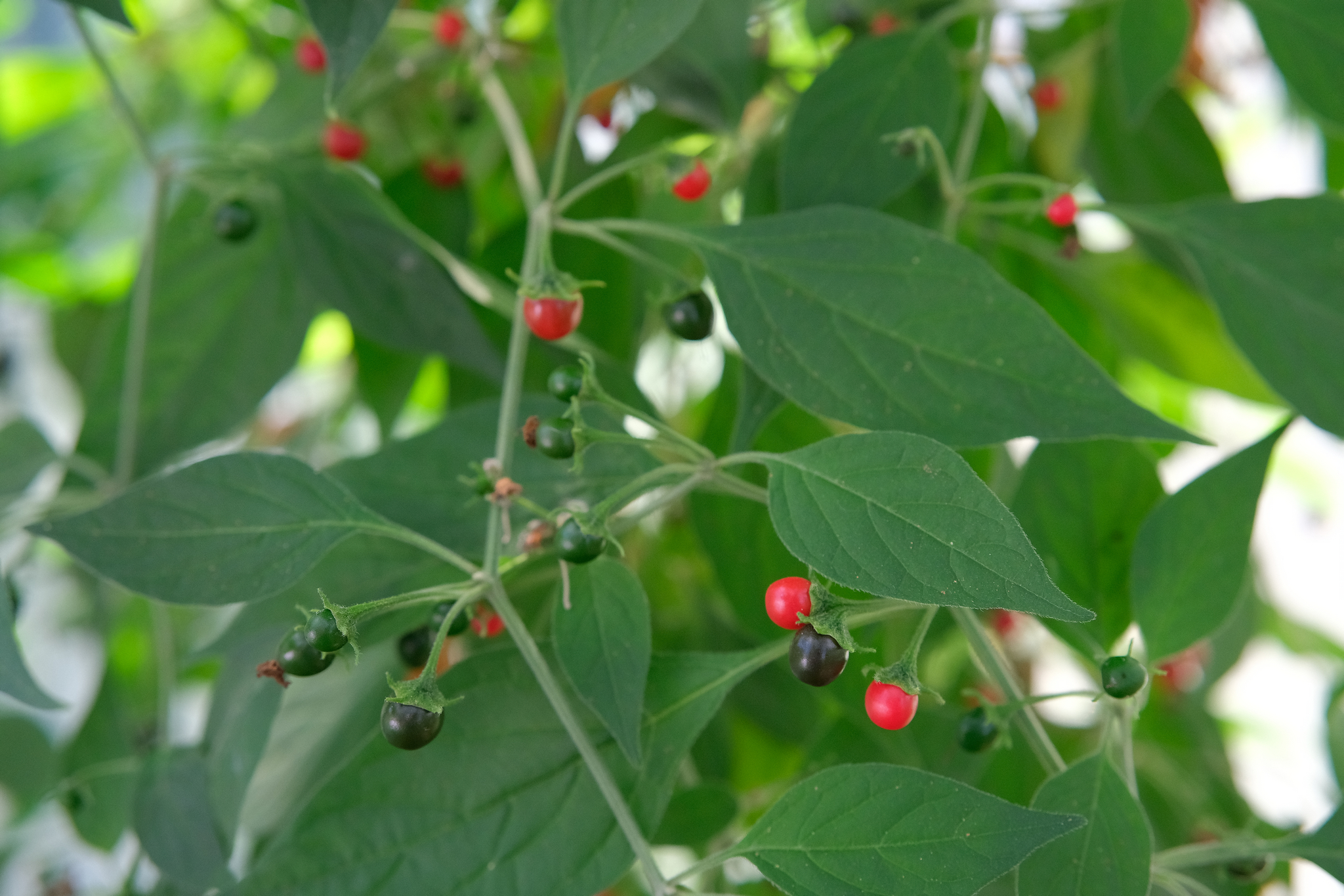 Plody: Kulaté, někdy jemně kónické, zpravidla okolo 1 cm v průměru. Zprvu jsou tmavě zelené, místy fialové, poté zrají do jasně červené barvy. Plody vyrůstají téměř kolmo dolů směrem k zemi.