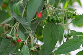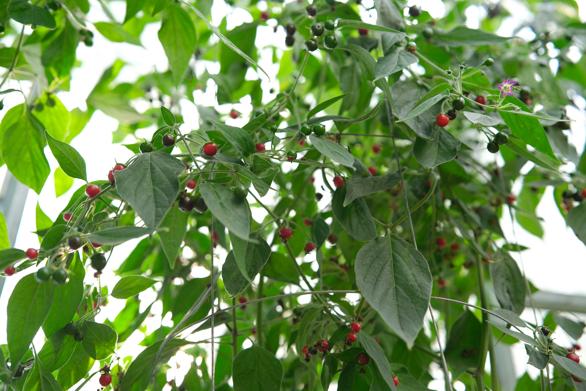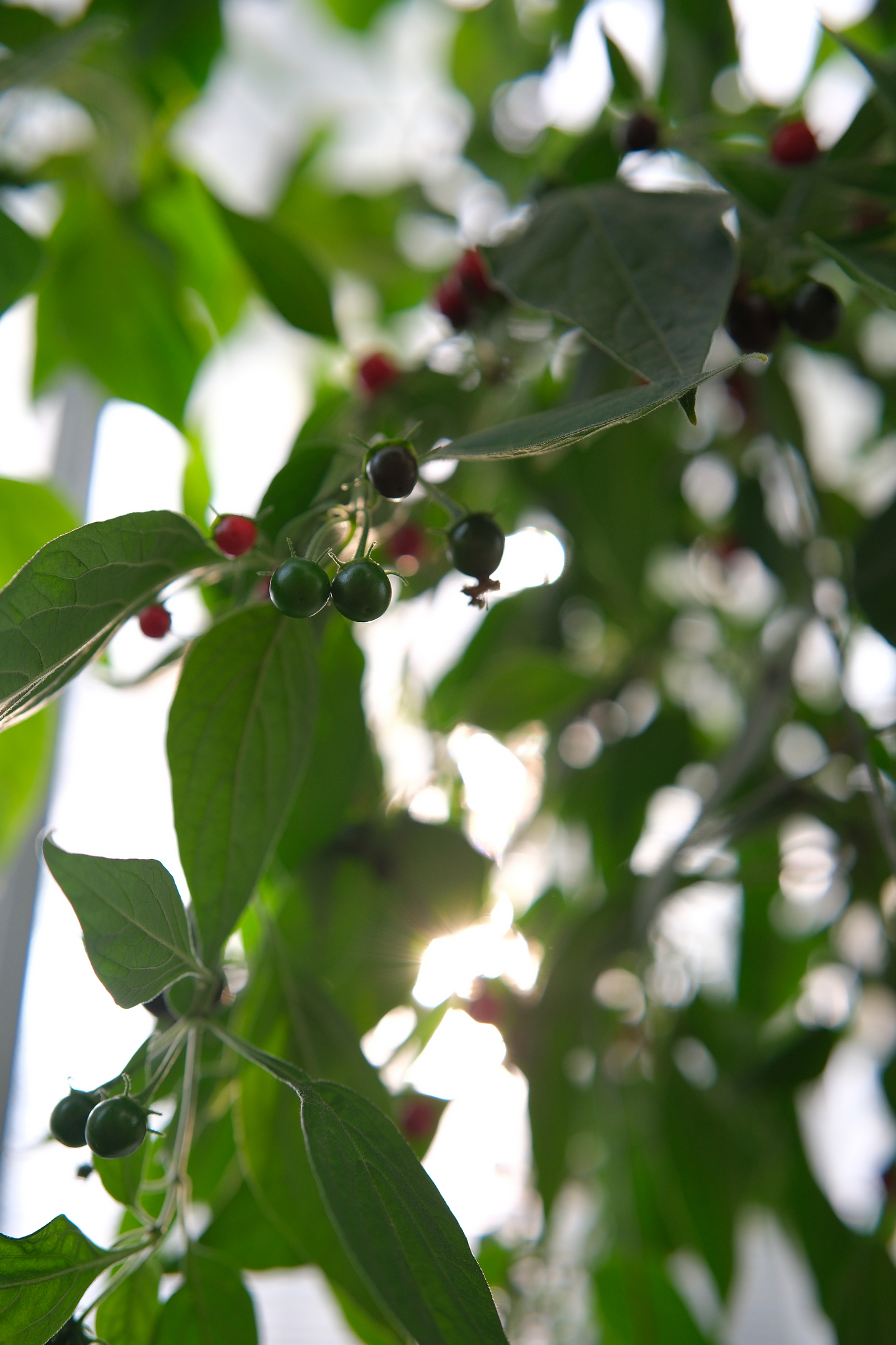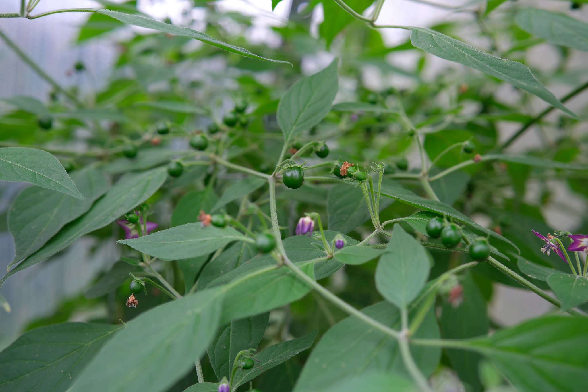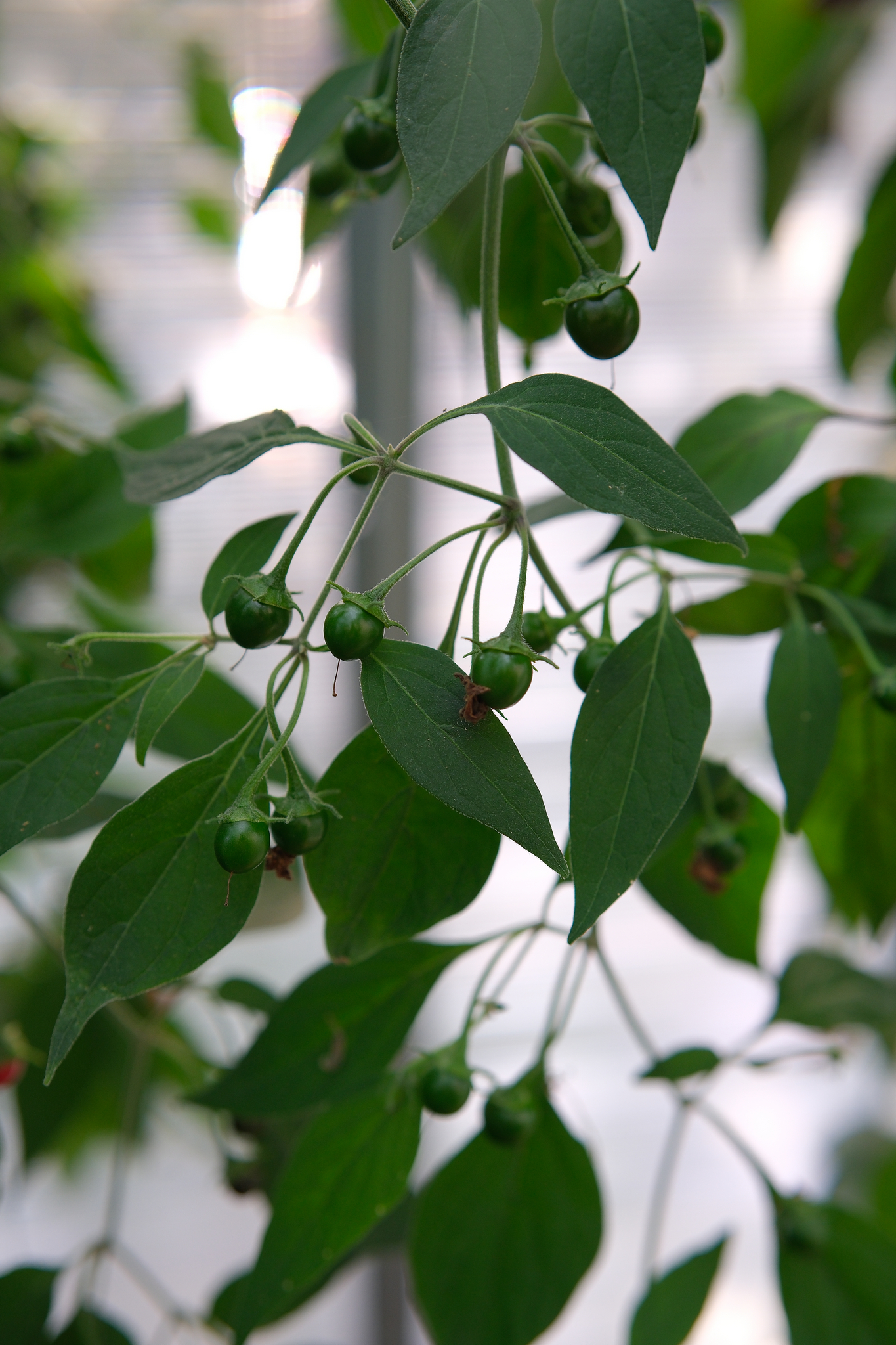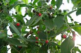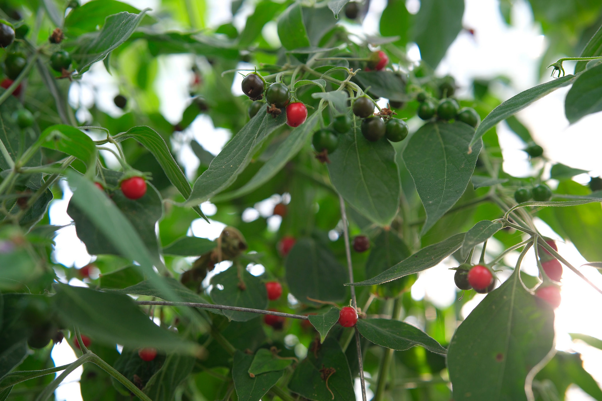 Plody: Kulaté, někdy jemně kónické, zpravidla okolo 1 cm v průměru. Zprvu jsou tmavě zelené, místy fialové, poté zrají do jasně červené barvy. Plody vyrůstají téměř kolmo dolů směrem k zemi.