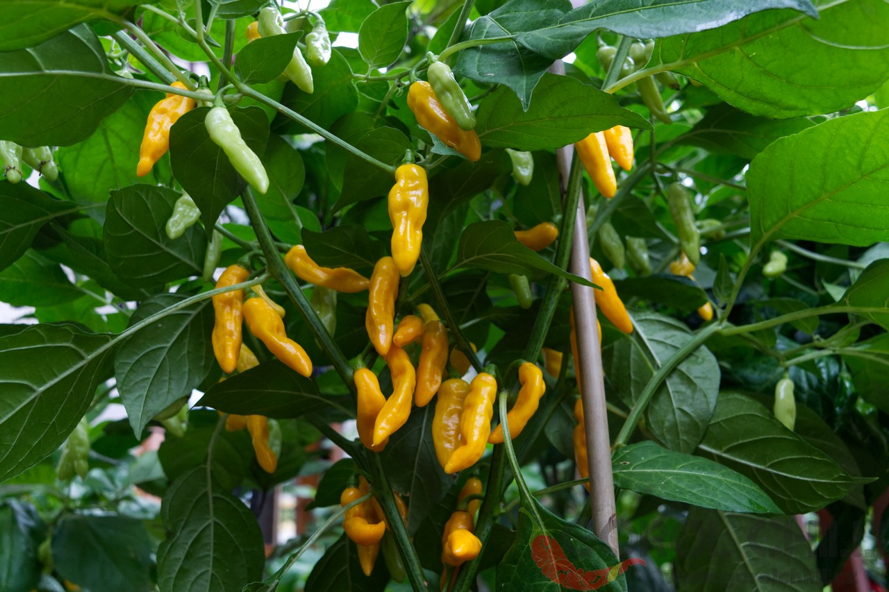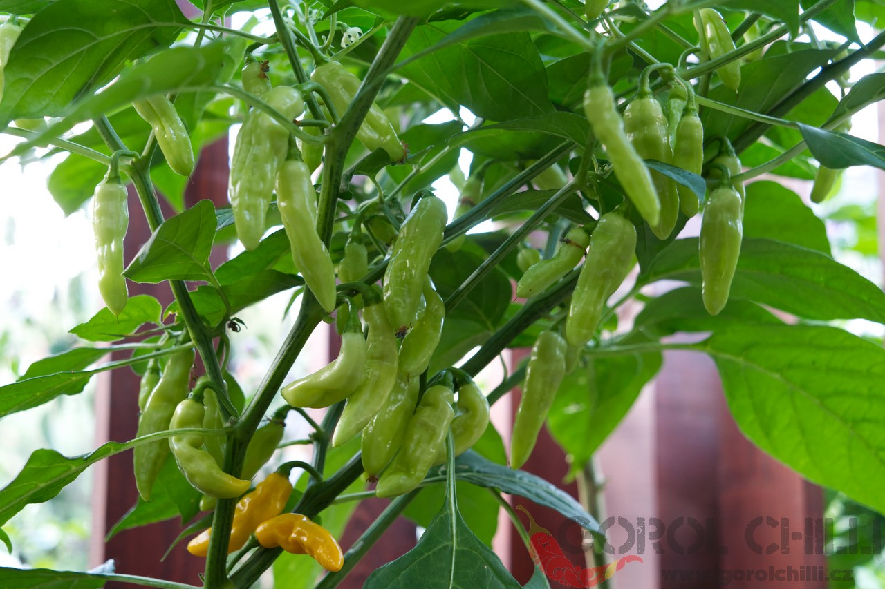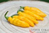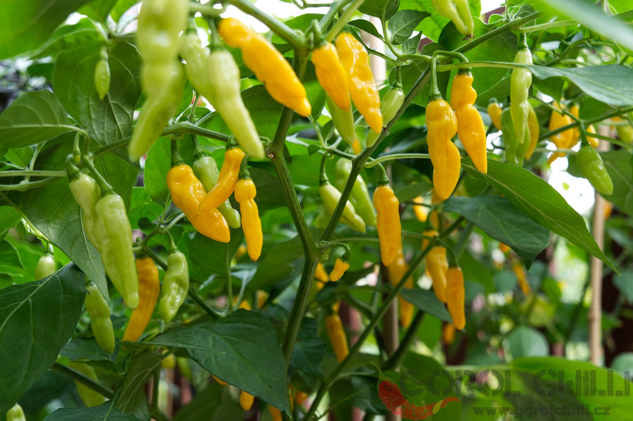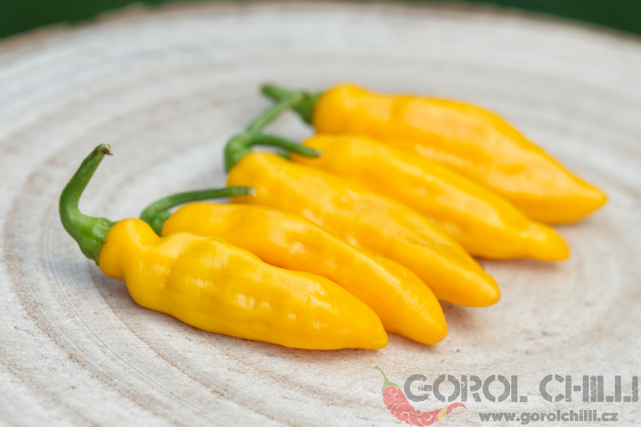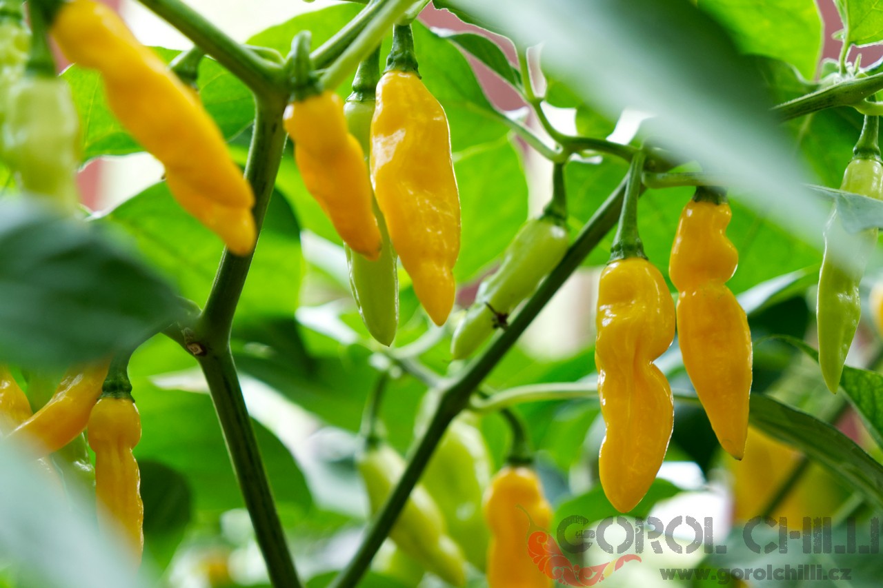 Plody: Robustní, zavalité, svým způsobem připomínají lehce krabaté habanero. Dorůstají délky okolo 5-6 cm a průměru asi 4-5 cm. Zprvu jsou světle zelené, následně zrají do bledě oranžové barvy.  Chuť a pal: Plody se vyznačují jemnou…