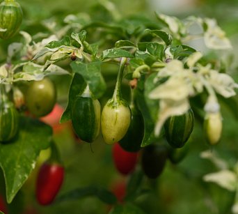 Plody: Drobné, fazolkovité, asi 1-1,2 cm dlouhé a nejvíc 0,5 cm široké. Zprvu jsou zelené, následně zrají přes oranžovou do červené barvy.   Chuť a pal: Plody mají silně kořeněnou exotickou chuť doprovázenou kouřovým zemitým aroma, což je…