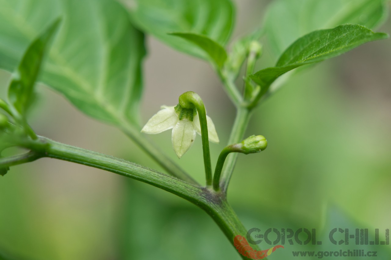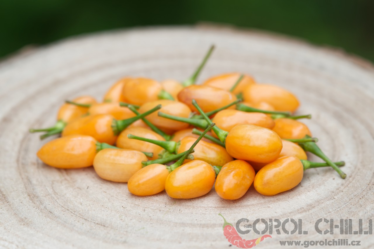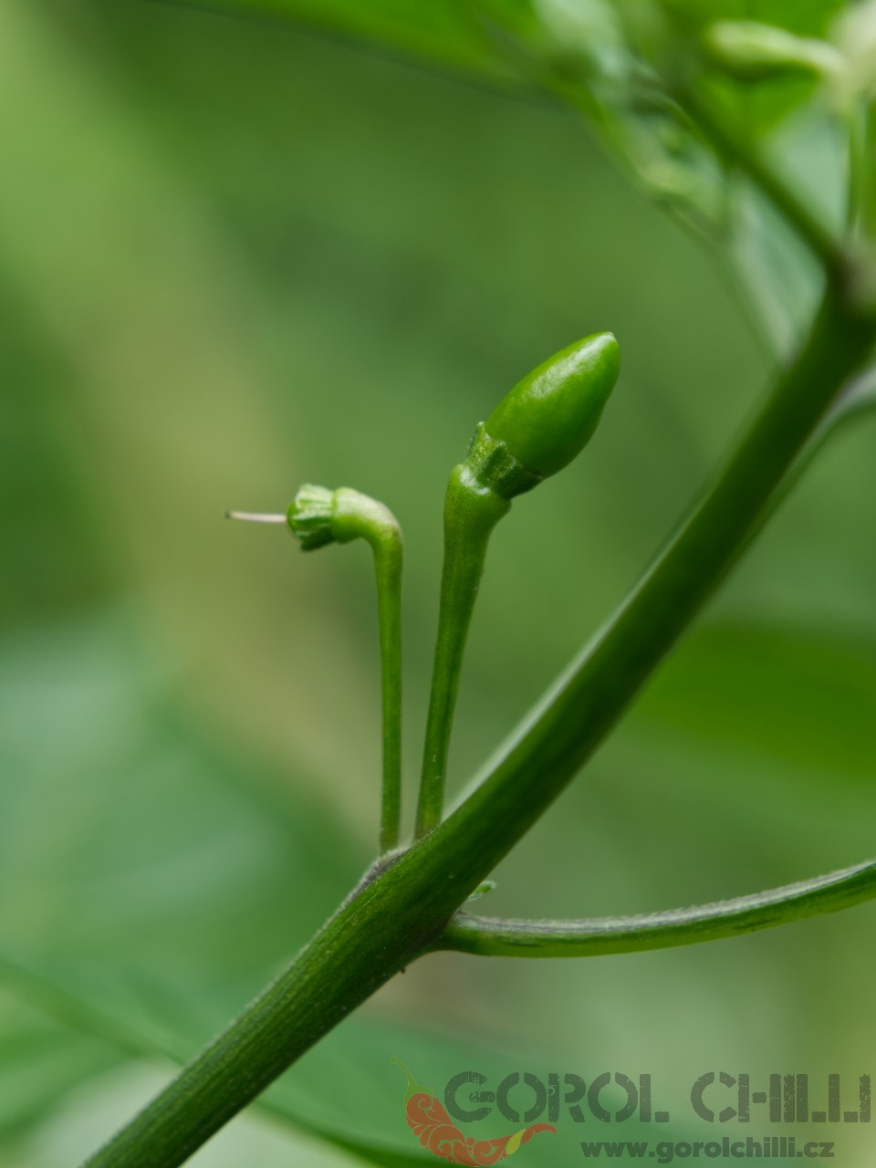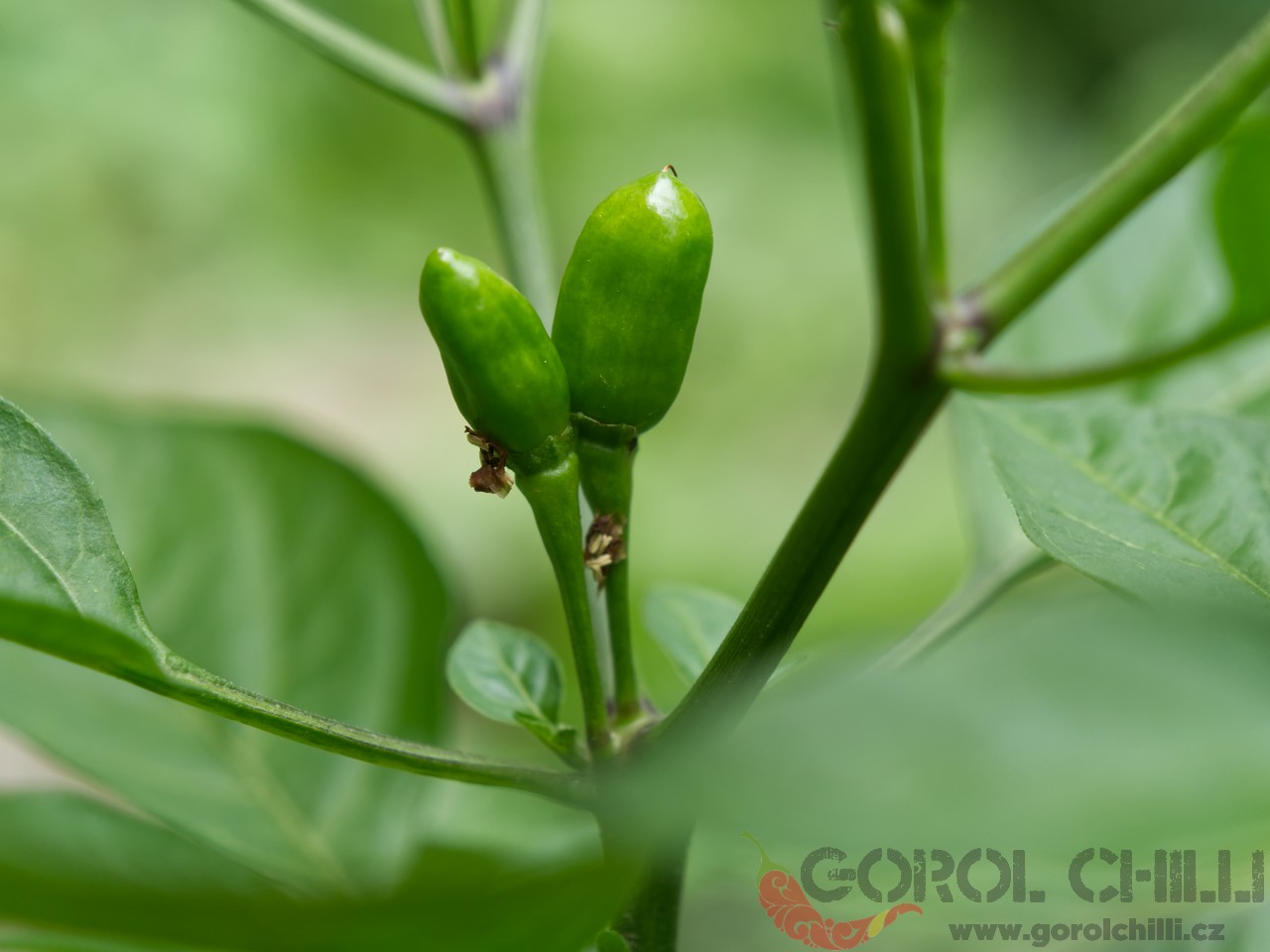 Plody: Drobné, kónické, asi 2-3 cm dlouhé a okolo 1-1,5 cm široké, na rostlině vyrůstají vzpřímeně. Zprvu jsou zelené, následně zrají do bledého odstínu žluto-oranžové barvy.