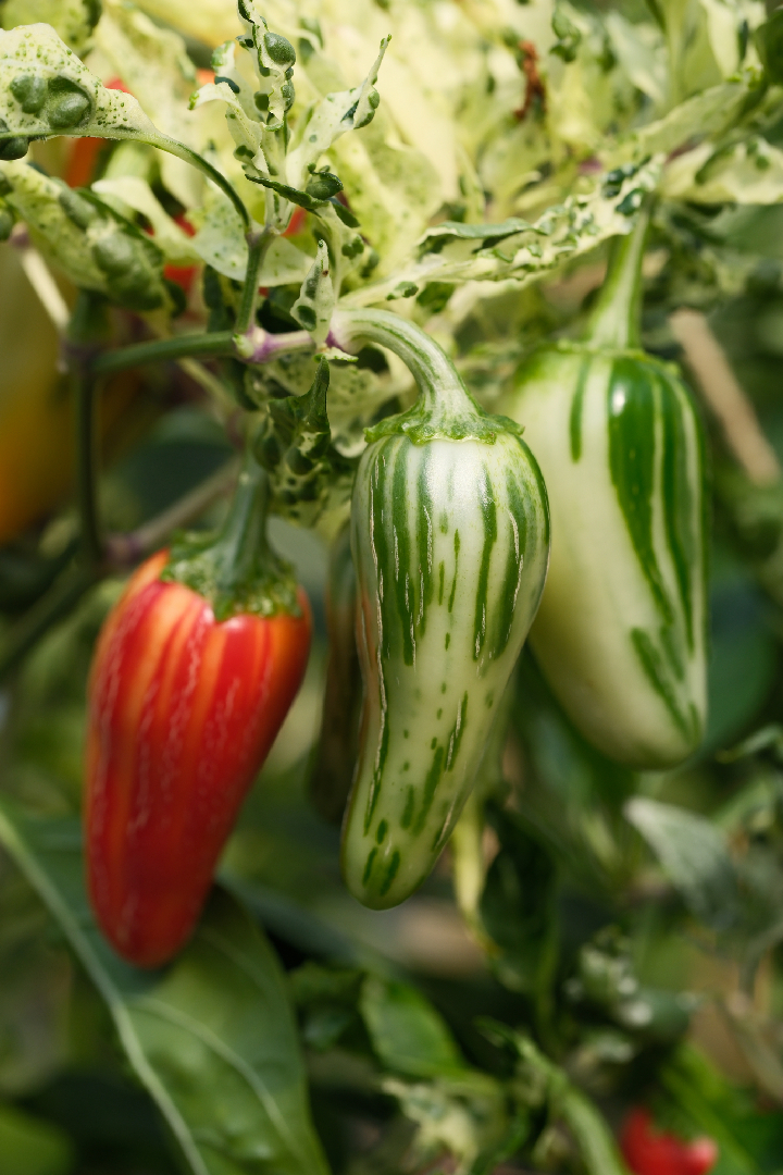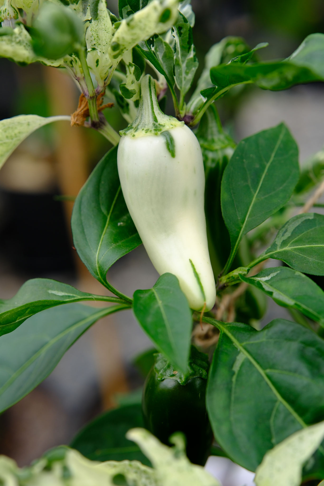 Plody: Vejčité, podlouhlé a směrem ke stopce se zužují. Dorůstají délky okolo 6-8 cm a asi 2-2,5 cm v průměru. Zprvu jsou zelené s bílým panašováním, následně zrají do červené barvy s oranžovým panašováním a bílým kornatěním plodů. Některé plody mohou dozrát do jednolitě červené barvy, u jiných může v plné zralosti zůstat i část bílého panašování.