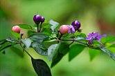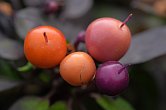 Plody: Soudečkovité, spíše menší, dorůstají délky okolo 3-4,5 cm a průměru kolem 2 cm. Mají mírně krabatý a lesklý, až voskovitý povrch. Zprvu jsou zeleno fialové, později zrají přes oranžovou do červené barvy s fialovými přelivy.  Chuť a…