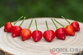 Plody: Kapkovité, baculaté a relativně drobné, jen okolo 2,5-3 cm dlouhé a 2-2,5 cm široké. Zprvu jsou bílé, na straně exponované slunci nafialovělé, následně zrají přes žlutou a oranžovou do červené barvy. Jejich váha se pohybuje okolo 3-4,5 g.
