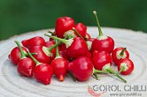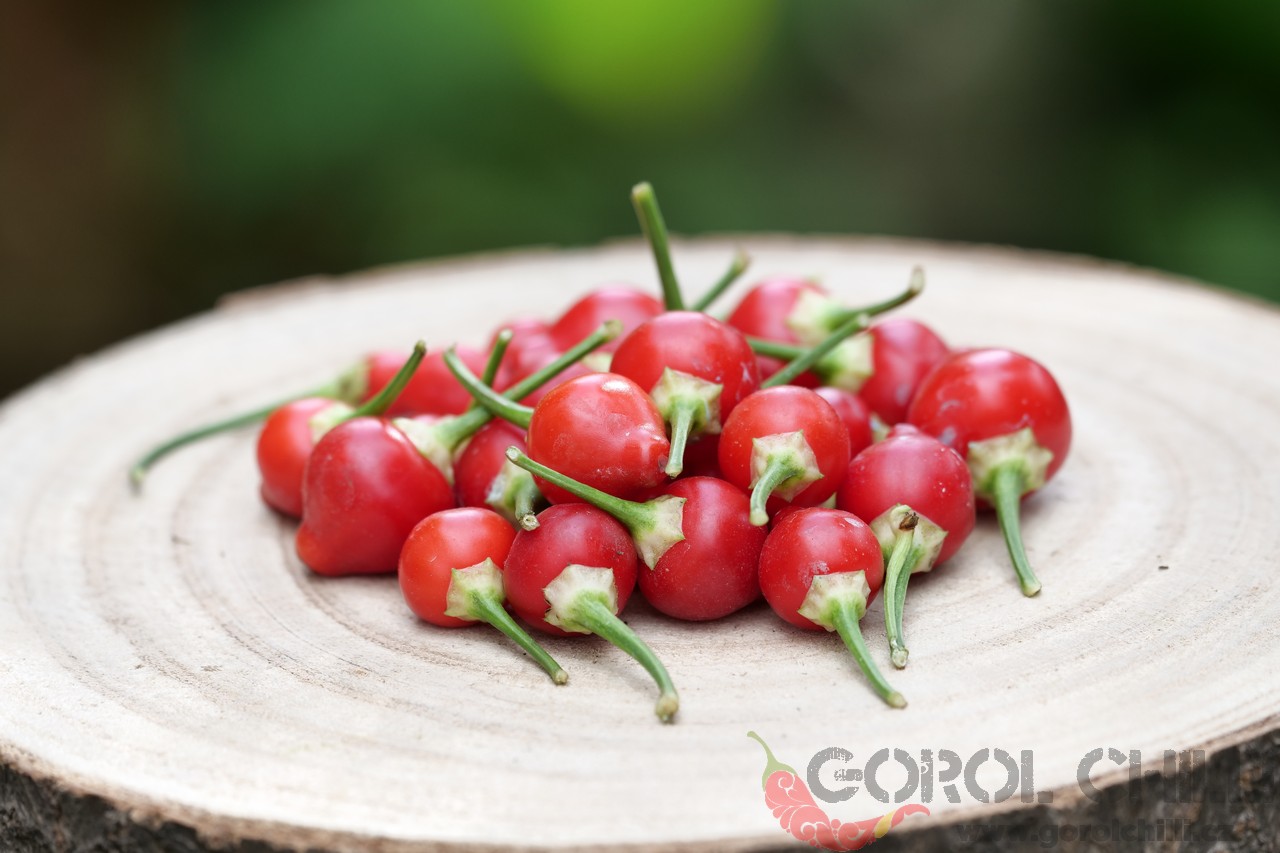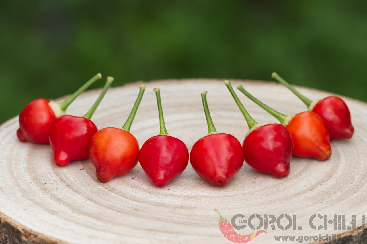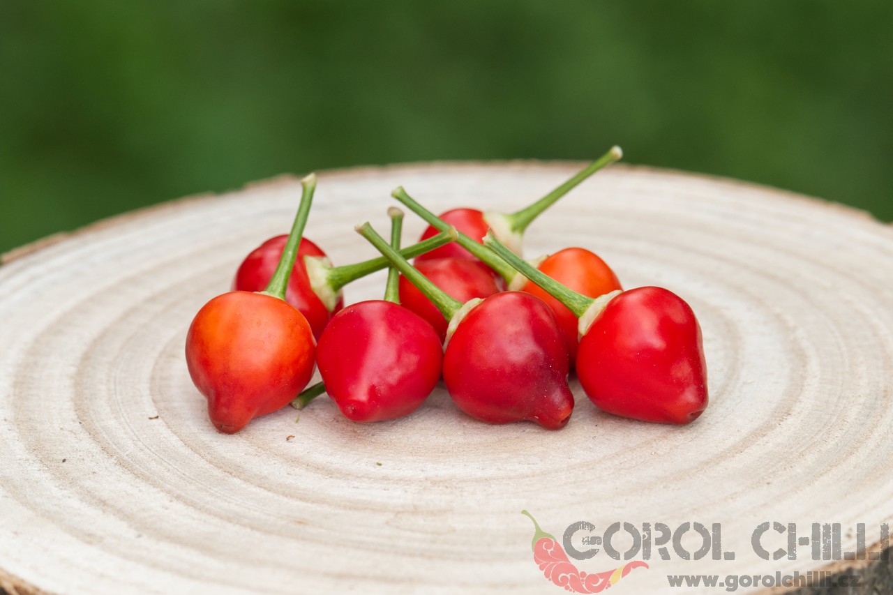 Plody: Menší, soudečkovité, na první pohled připomínající zmenšenou Morugu. Zprvu jsou tmavě zelené, později zrají do svítivě červené barvy.  Chuť a pal: Plody jsou ovocné a nezvykle sladké, doprovázené velmi agresivním kořeněným aroma.…