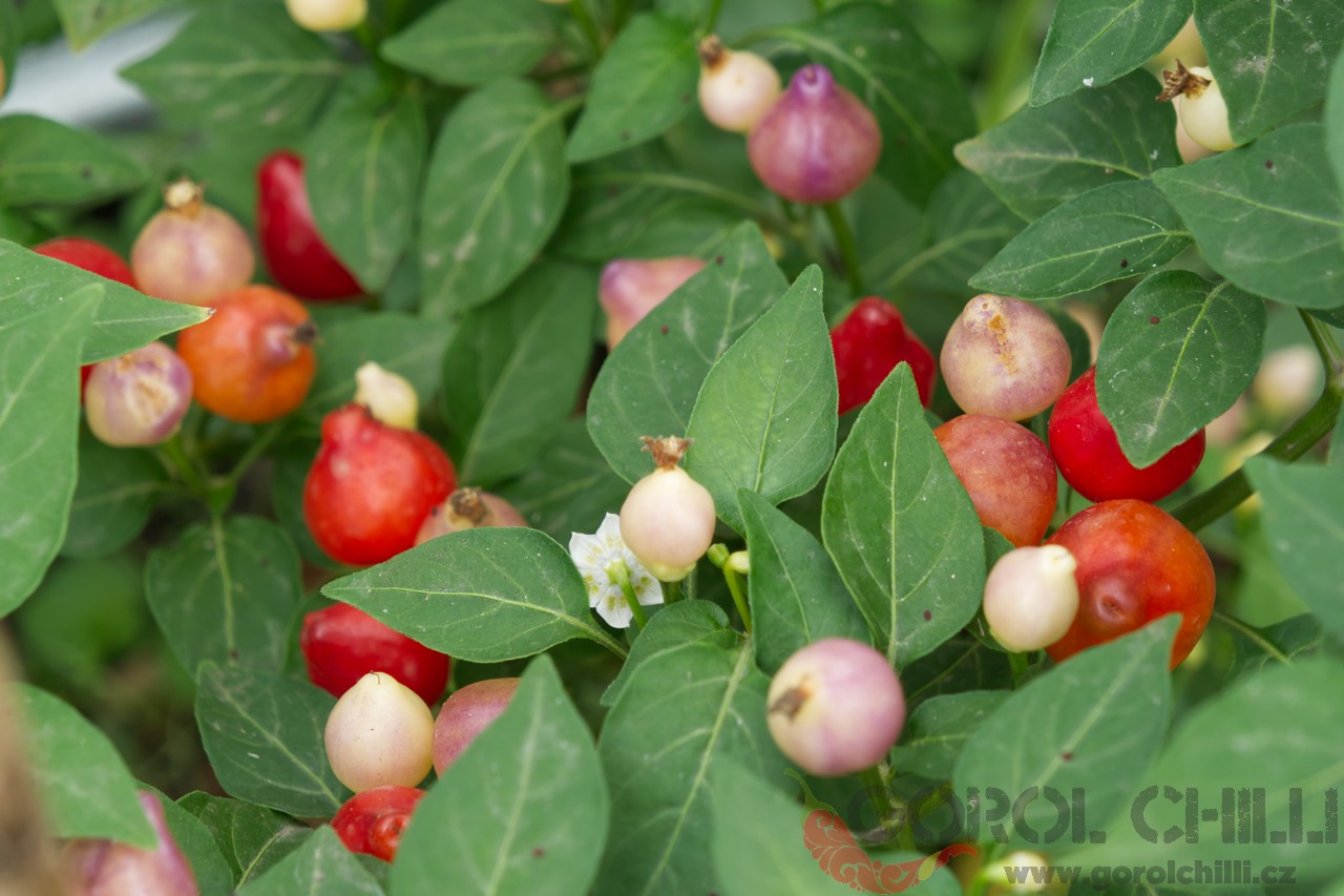 Plody: Soudečkovité, někdy téměř kulaté, okolo 2 cm v průměru. Zprvu jsou tmavě fialové až zcela černé, následně zrají přes světle fialovou do tmavě hnědo-červené barvy. Chuť a pal: Chuť je typická pro druh C. chinense, sladká, ovocná s…