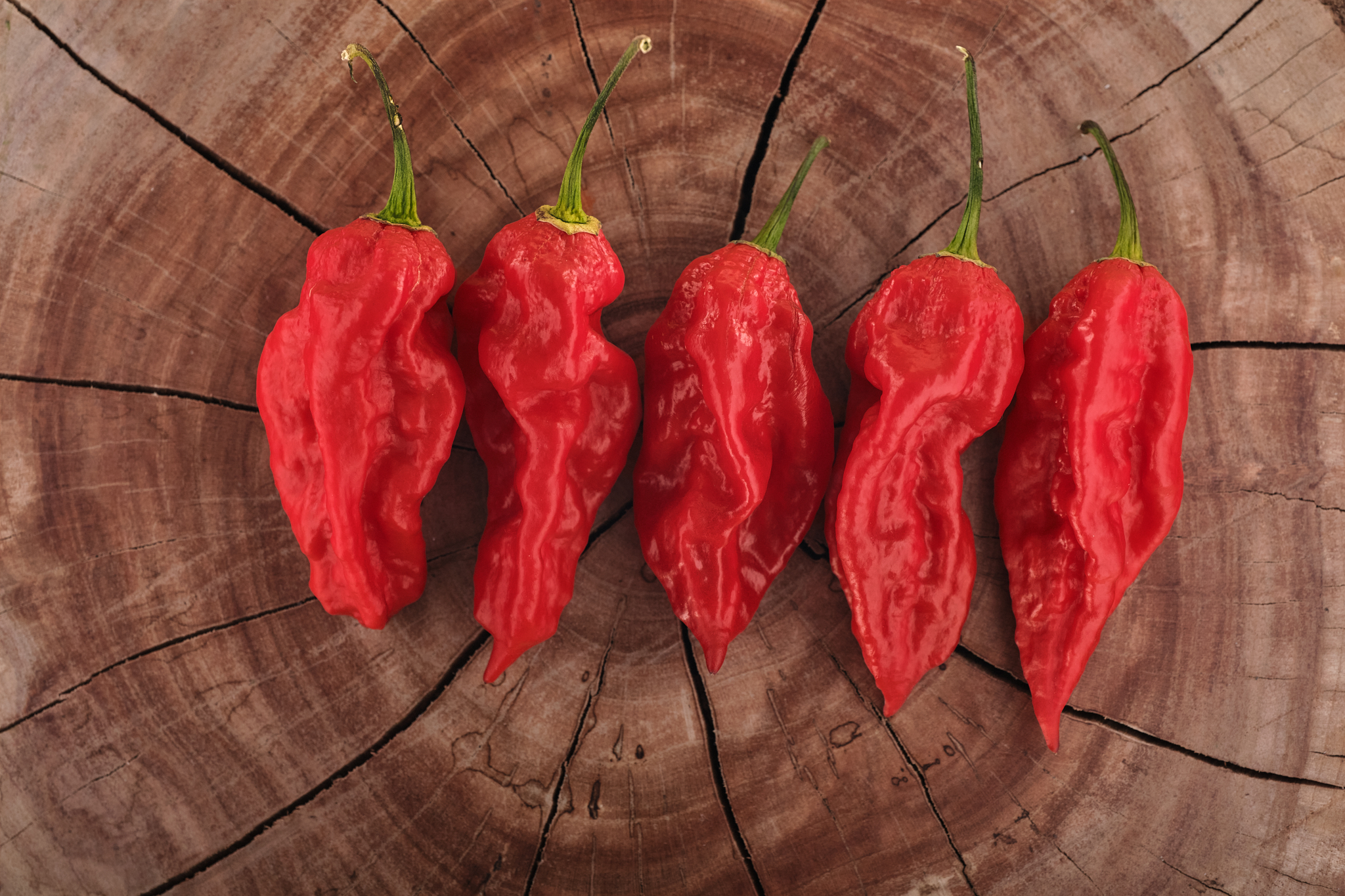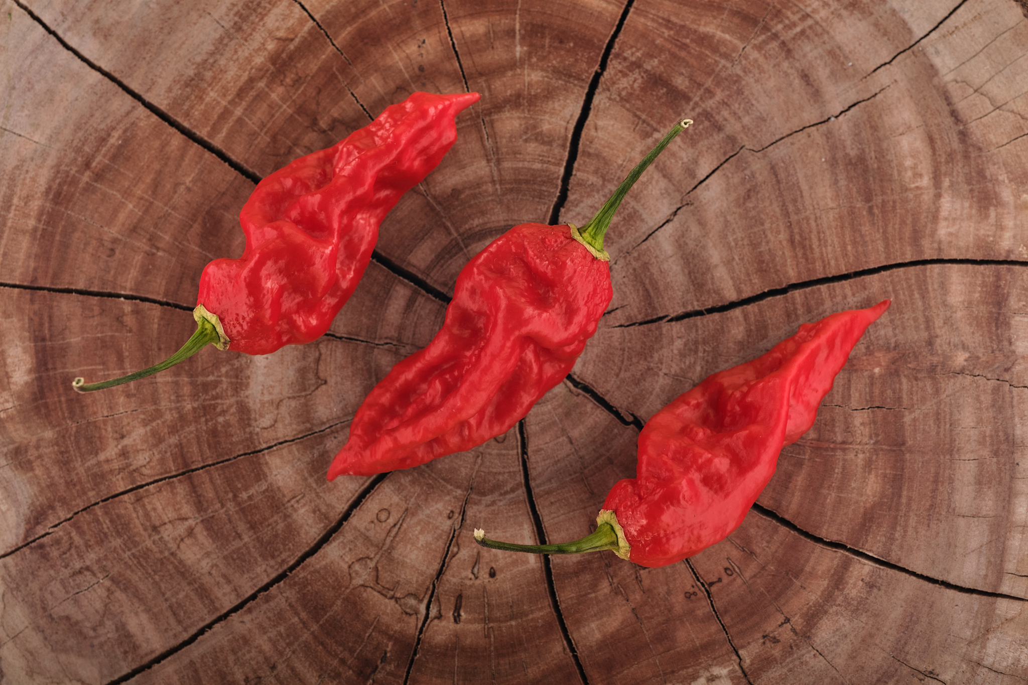 Plody: Robustní, soudečkovité a extrémně zvrásněné. Dorůstají délky okolo 4-5 cm a porobného průměru. Zprvu jsou tmavě zelené, následně zrají do sytě červené barvy.  Chuť a pal: Plody mají silně kořeněnou chuť s ovocnými tóny s palčivým…