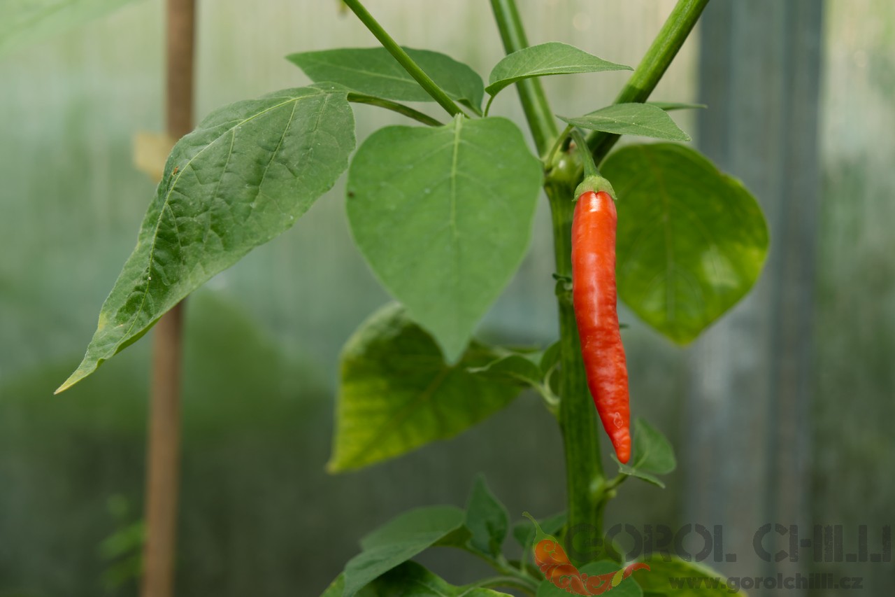 Plody: Podlouhlé, úzké, asi 7-10 cm dlouhé a 0,5 cm široké. Zprvu jsou bílé, následně zrají přes oranzovou do červené barvy. Na rostlině vyrůstají vzpřímeně a jejich váha se pohybuje okolo 2,5-3 g.