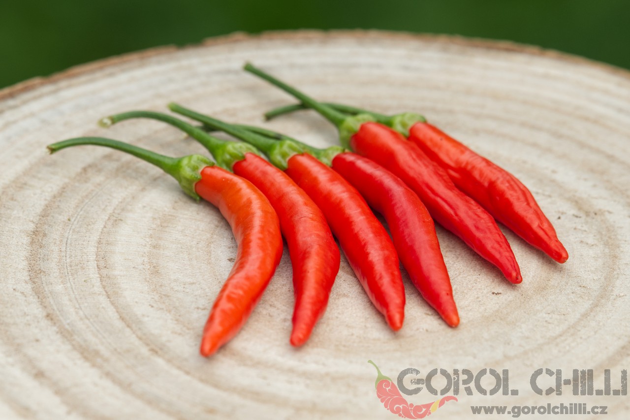 Plody: Podlouhlé, úzké a silně vrásčité. Dorůstají délky okolo 8-11 cm a průměru do 2 cm. Zprvu jsou světle zelené až bělavé, následně zrají do zářivě červené barvy.  Chuť a pal: Papriky vynikají kořeněnou ovocnou chutí, kterou doprovází…