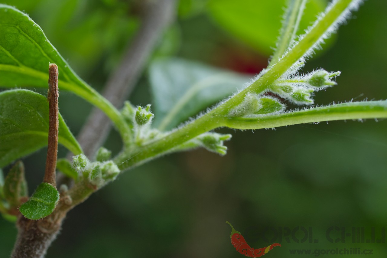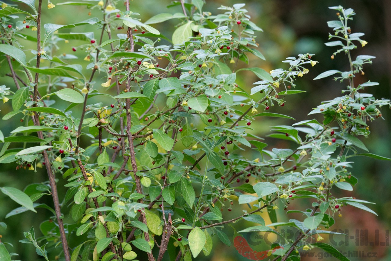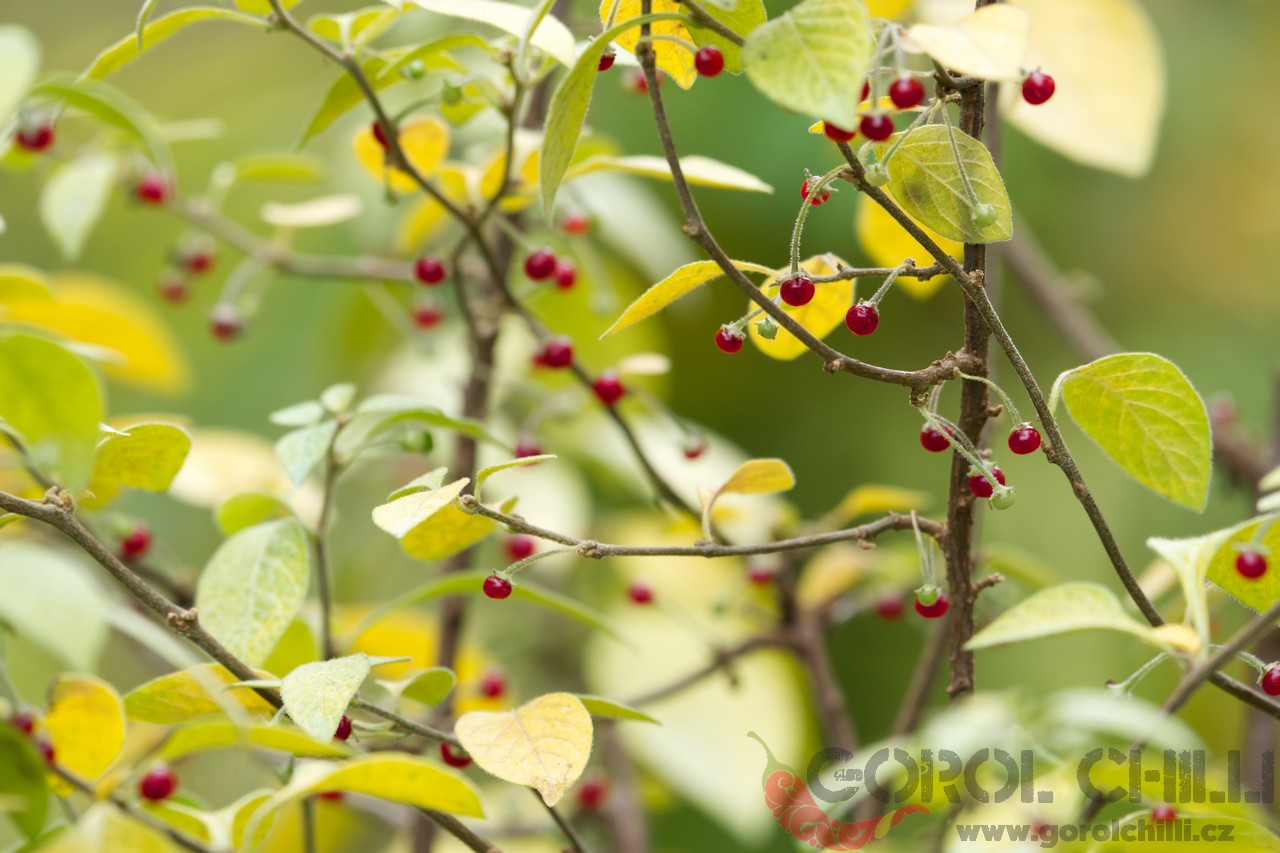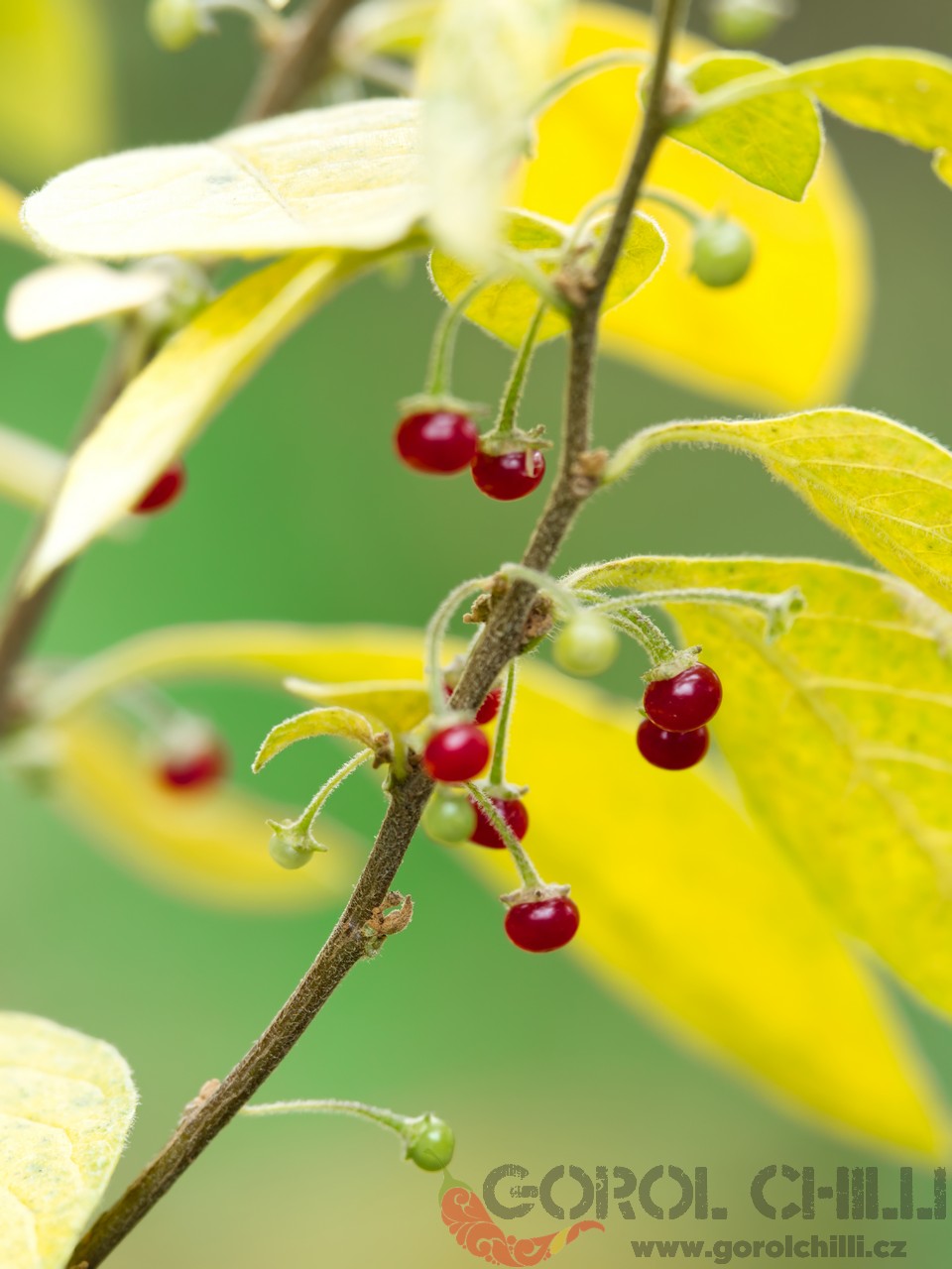 Plody: Velmi drobné kuličky dorůstající průměru okolo 3-9 mm. Zprvu jsou světle zelené, následně zrají do velmi tmavě červené barvy.