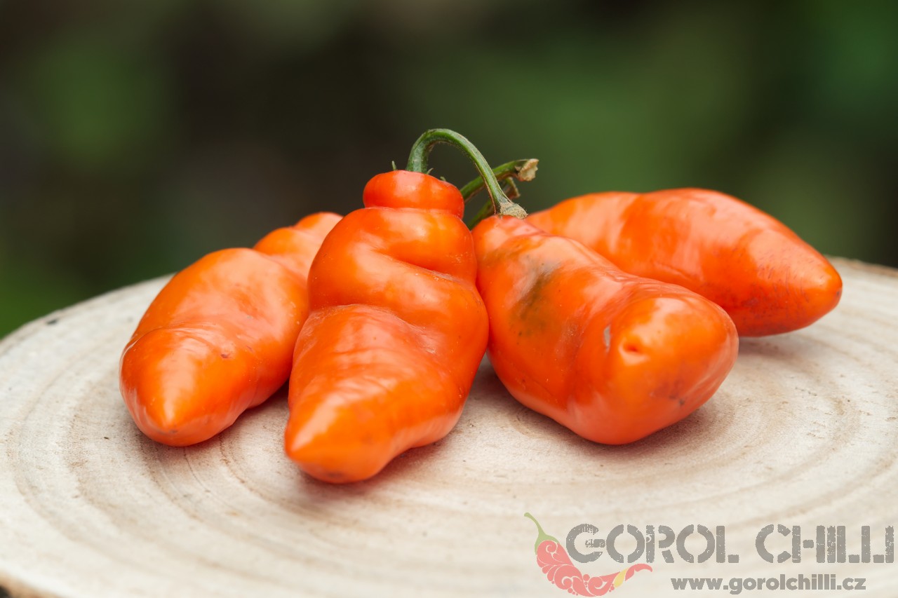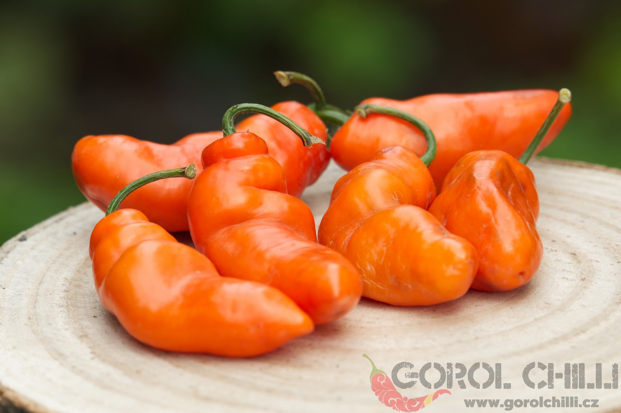 Plody: Podlouhlé, úzké s lehce krabaté. Zprvu jsou světle zelené až bělavé, později zrají do krásné karamelové barvy. Dorůstají délky okolo 8-11 cm a průměru do 2 cm. Chuť a pal: Chuť je typická pro indické kultivary typu Jolokia,…