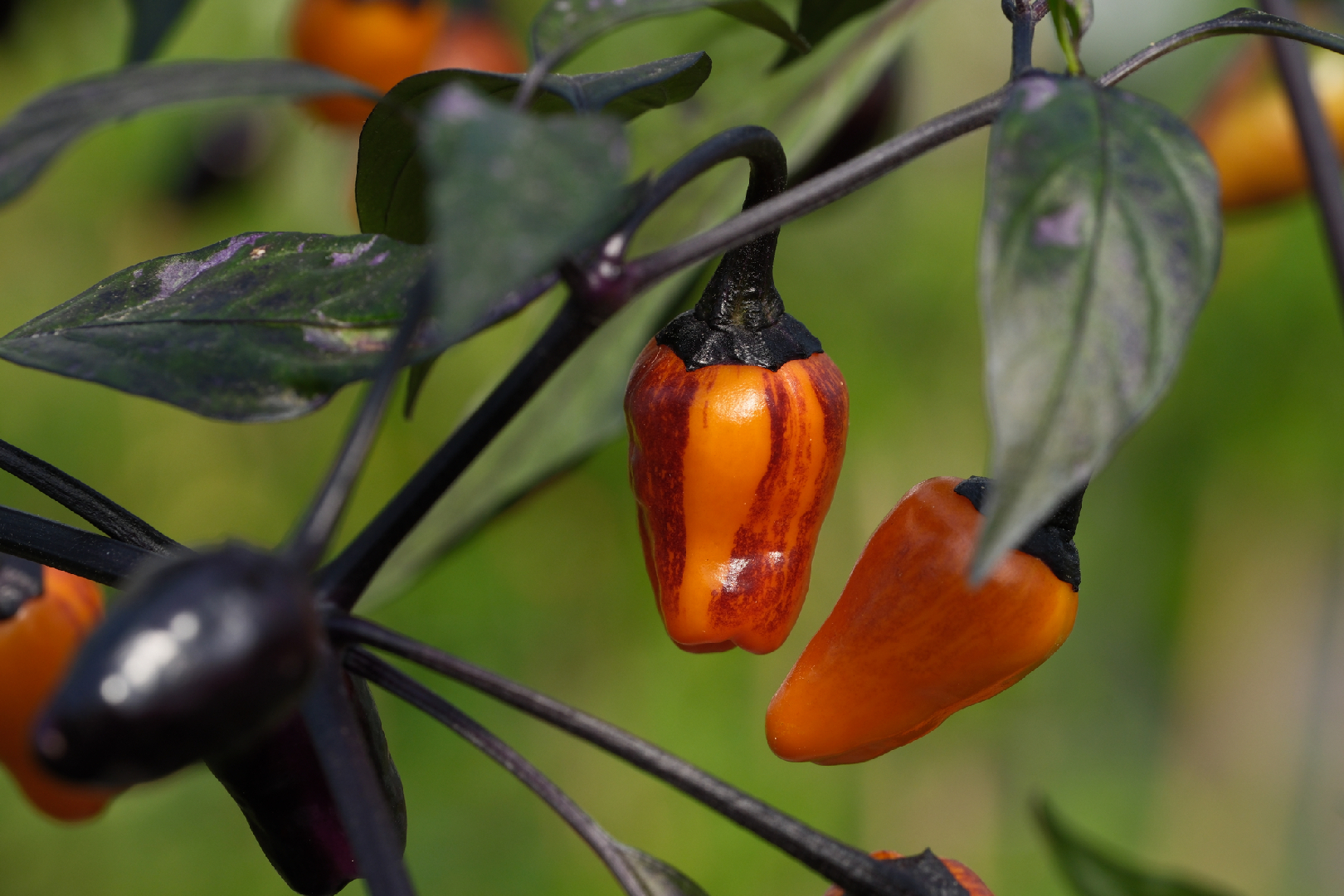 Rostlina: Velmi vysoký keř dorůstající výšky okolo 2 metrů a průměru koruny okolo 1 m. Rostlina zpravidla naroste do mohutné výšky, kde se rozvětví a vytvoří několik pater doslova obalených minimálně stovkami plodů. Stonky jsou fialové až černé, listy tmavě zelené s fialovým, až narůžovělým panašováním.