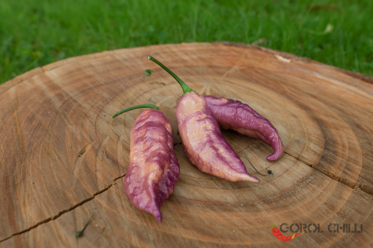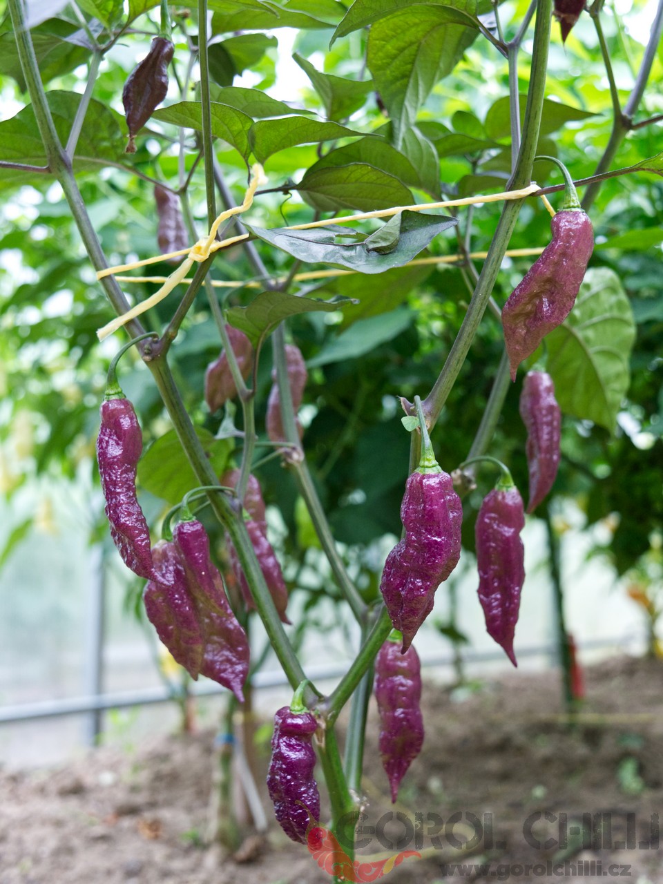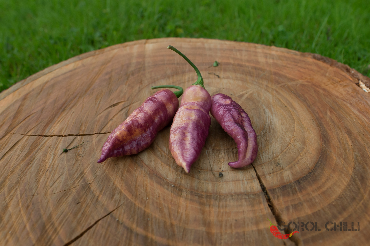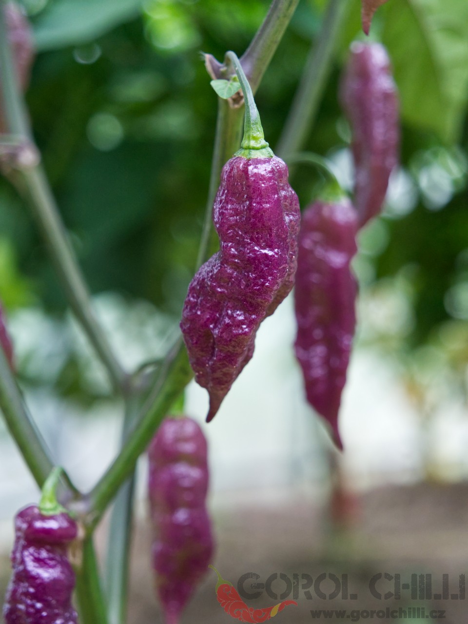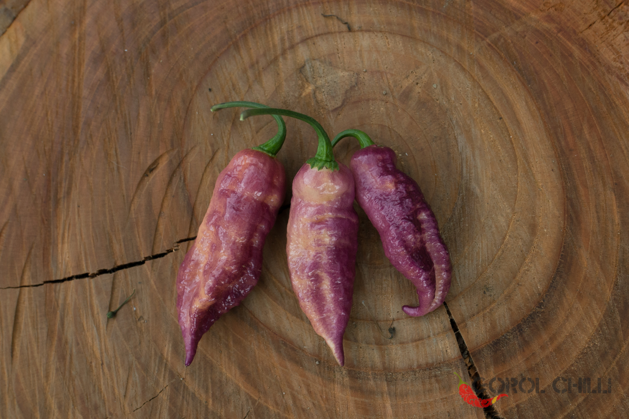 Plody: Robustní, soudečkovité a extrémně zvrásněné. Dorůstají délky okolo 4-5 cm a porobného průměru. Zprvu jsou tmavě zelené, následně zrají do sytě červené barvy.  Chuť a pal: Plody mají silně kořeněnou chuť s ovocnými tóny s palčivým…