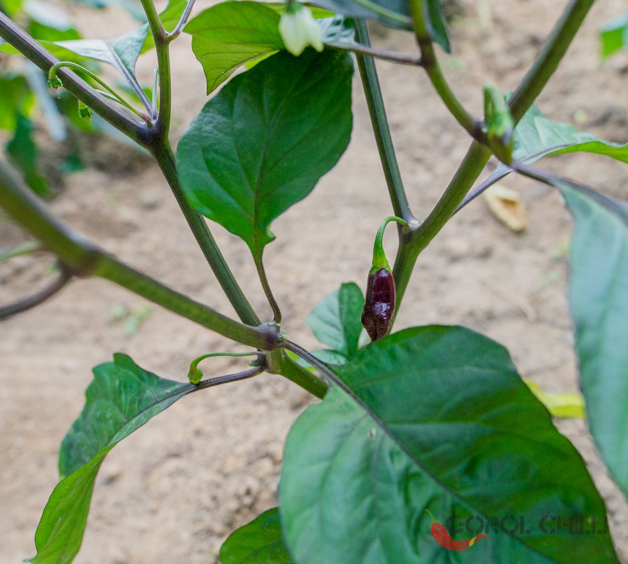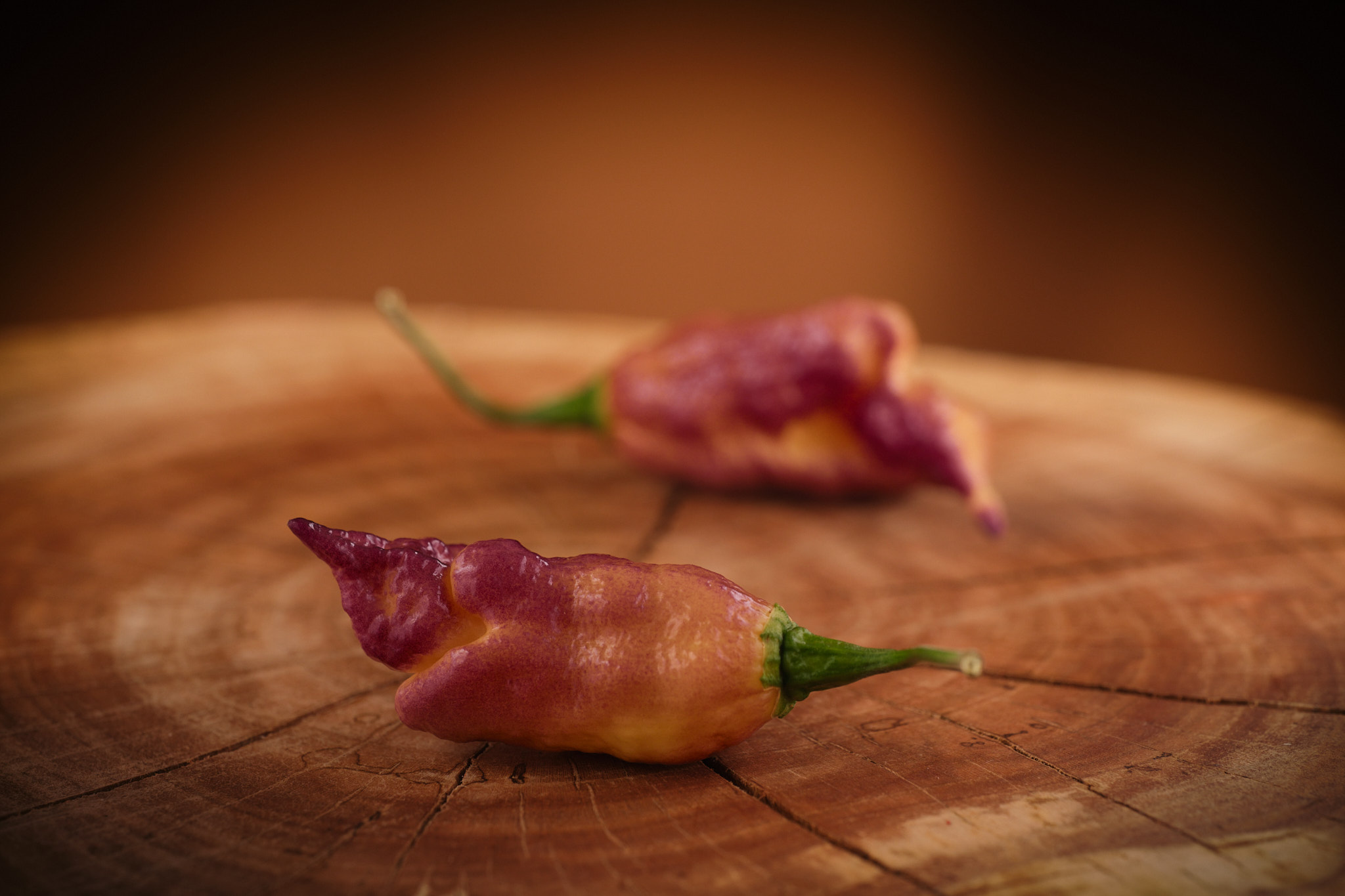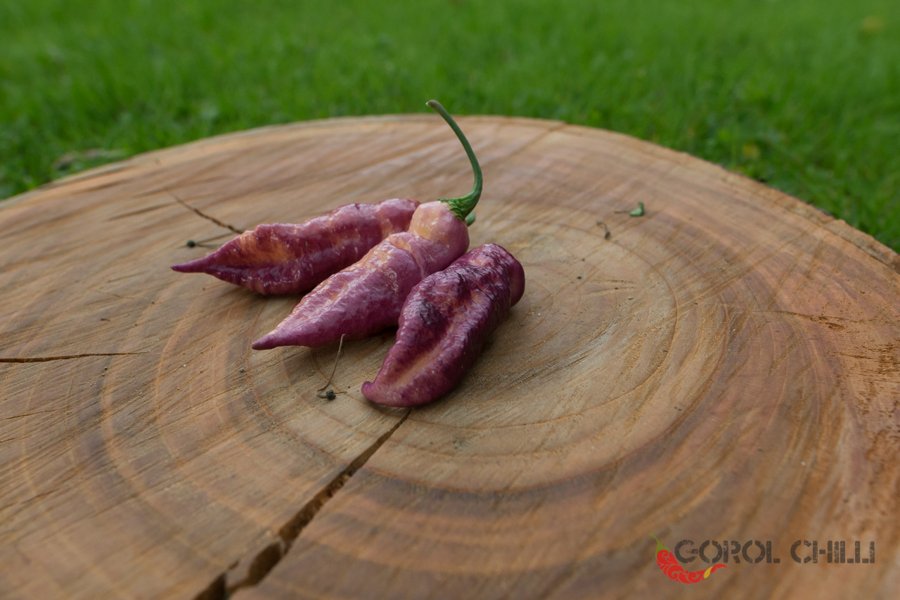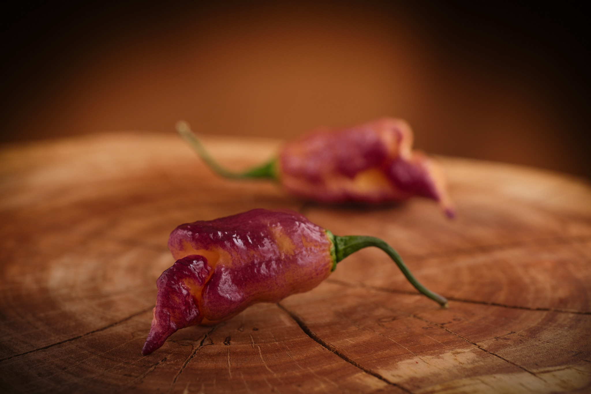 Plody: Robustní, soudečkovité a extrémně zvrásněné. Dorůstají délky okolo 4-5 cm a porobného průměru. Zprvu jsou tmavě zelené, následně zrají do sytě červené barvy.  Chuť a pal: Plody mají silně kořeněnou chuť s ovocnými tóny s palčivým…