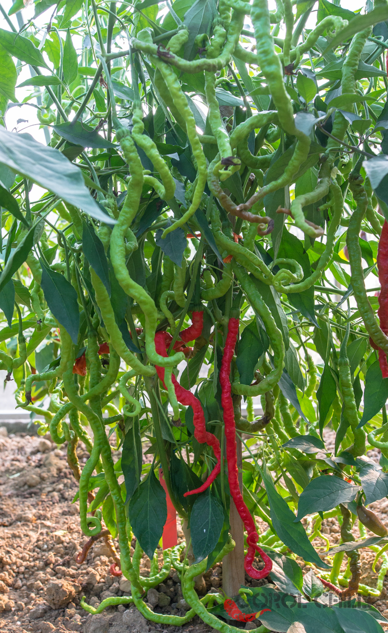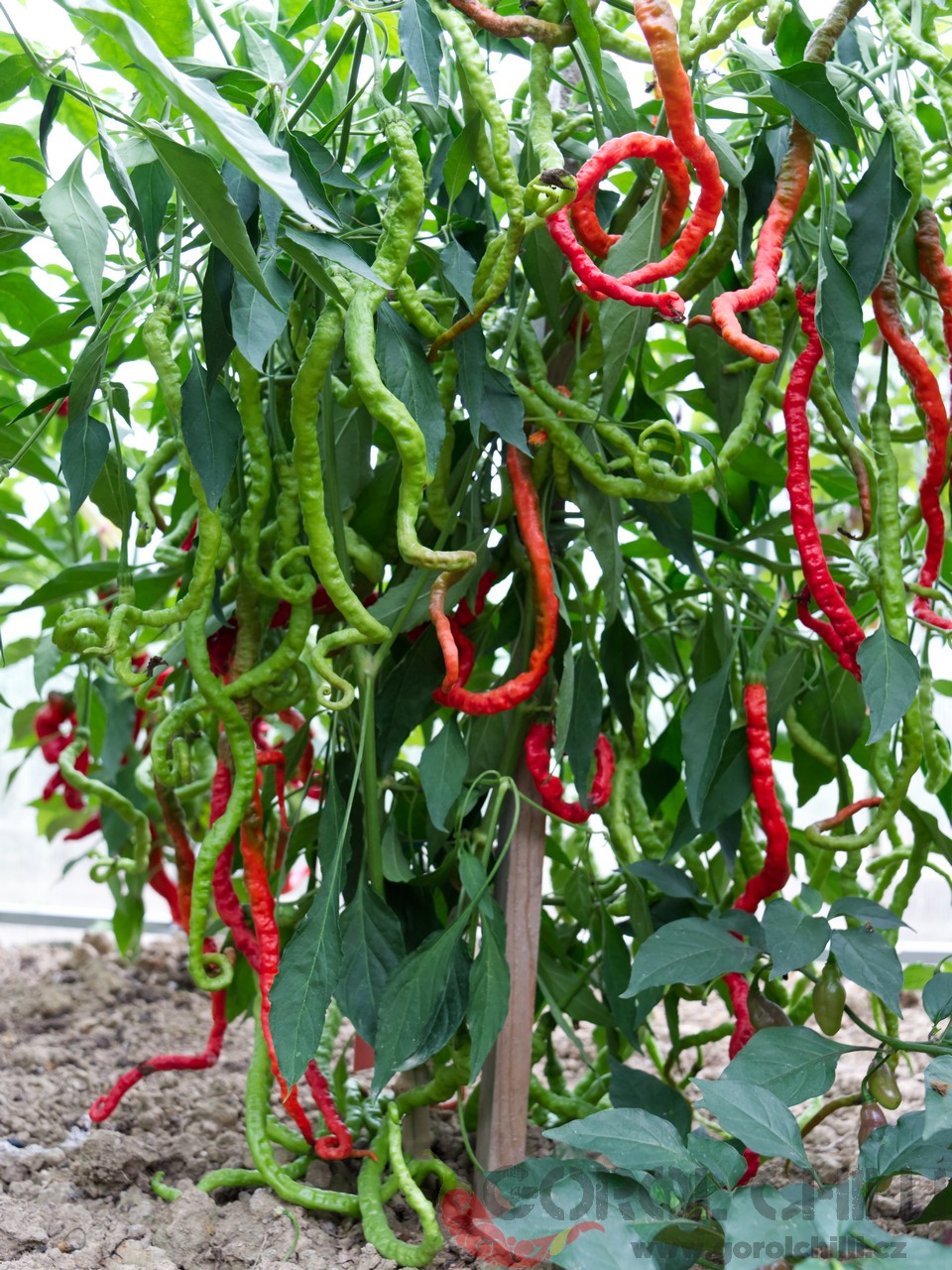 Plody: Robustní, spíše podlouhlé a silně zvlněné. Dorůstají délky okolo 6-7,5 cm a v průměru kolem 2,5-3,5 cm. Zprvu jsou zelené, následně zrají do svítivě červené barvy.  Chuť a pal: Plody se vyznačují výraznou ovocnou chutí a palčivým…