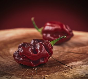 Plody: Robustní, soudečkovité a extrémně zvrásněné. Dorůstají délky okolo 4-5 cm a porobného průměru. Zprvu jsou tmavě zelené, následně zrají do sytě červené barvy.  Chuť a pal: Plody mají silně kořeněnou chuť s ovocnými tóny s palčivým…